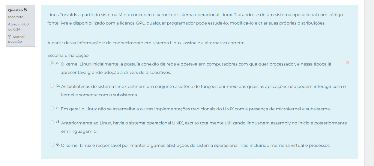 <p>Questão 5 Incorreto Linus Torvalds a partir do sistema Minix concebeu kernel do sistema operacional Tratando-se de um sistema operacional com código Atingiu 0,00 fonte livre e disponibilizado com a licença GPL, qualquer programador pode estuda-lo, modifica-lo e criar suas próprias distribuições. do Marcar questão A partir dessa informação e do conhecimento em sistema Linux, assinale a alternativa correta: Escolha uma opção: a. kernel Linux inicialmente já possuía conexão de rede e operava em computadores com qualquer processador, e nessa época já apresentava grande adoção a drivers de dispositivos. b. As bibliotecas do sistema Linux definem um conjunto aleatório de funções por meio das quais as aplicações não podem interagir com kernel e somente com C. Em geral, O Linux não se assemelha a outras implementações tradicionais do UNIX com a presença de microkernel e d. Anteriormente ao Linux, havia sistema operacional UNIX, escrito totalmente utilizando linguagem assembly no início e posteriormente em linguagem C. e. kernel Linux é responsável por manter algumas abstrações do sistema operacional, não incluindo virtual e processos.</p>