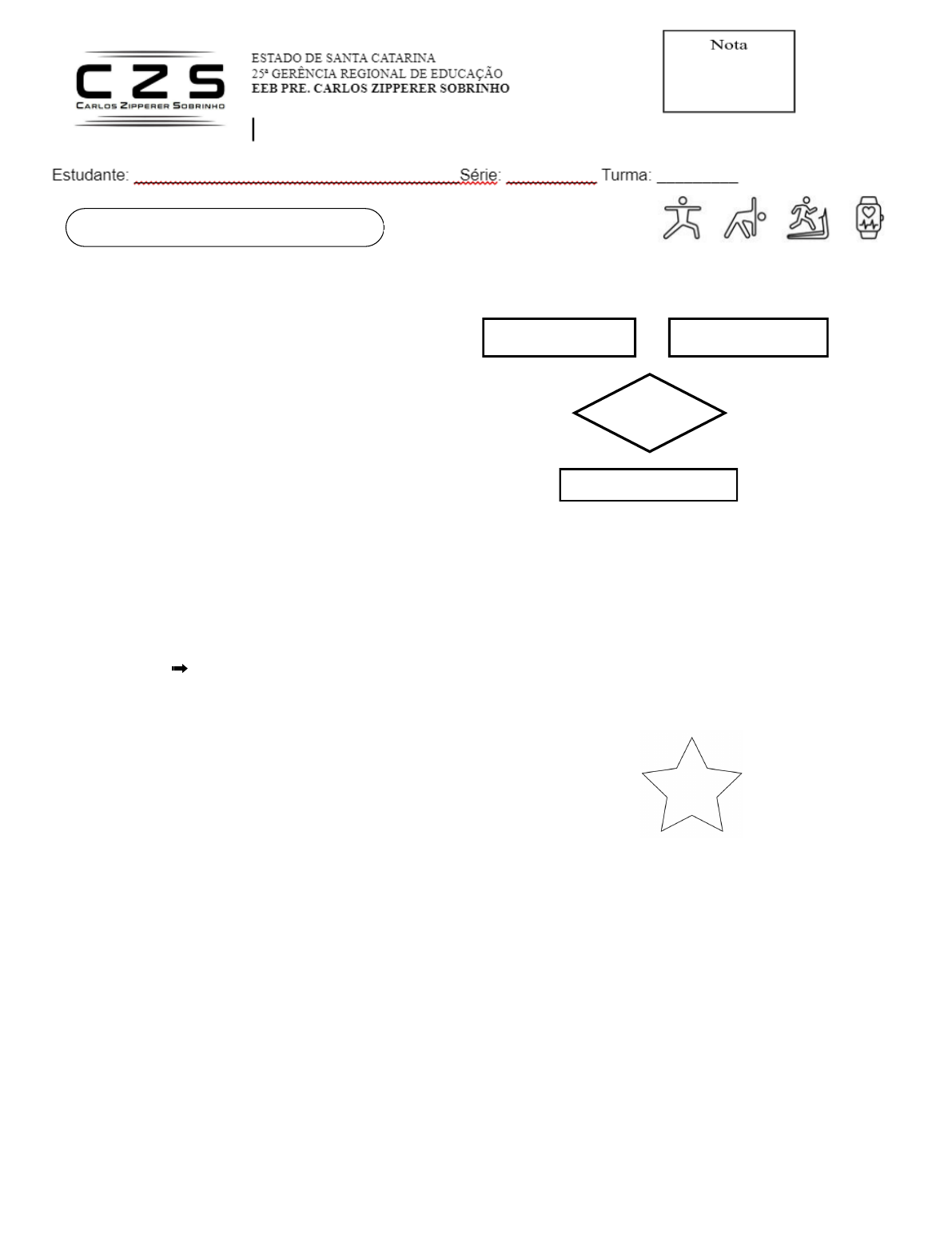 <p>2.Estamos longe de sermos tão saudáveis quanto poderíamos ser. Além de estilos de vida que põem em</p><p>risco a saúde — seja pelo __________________________________________________________ —</p><p>ainda existem diferenças gritantes no padrão de vida de regiões mais desenvolvidas e daquelas mais</p><p>pobres.</p><p>3.Estilo de Vida➟</p><p>5.Existem fatores do nosso estilo de vida que afetam negativamente nossa saúde e sobre os quais</p><p>podemos ter controle. Cite 5 fatores:</p><p>6.Todas as partes corporais, se usadas com moderação e exercitadas em tarefas a que estão</p><p>acostumadas, tornam-se saudáveis e envelhecem mais lentamente; se pouco utilizadas, tornam-se mais</p><p>sujeitas às doenças e envelhecem rapidamente. Nos últimos 70 anos, observou-se uma série de</p><p>modificações nas sociedades humanas, de magnitude e ritmo sem precedentes, que fizeram com que a</p><p>atividade física passasse a ser estudada como fator de prevenção e tratamento de inúmeras doenças.</p><p>Quem fez essa afirmação? ( ) Sócrates ( ) Aristótales ( ) Hipócrates ( ) Isóseles</p><p>7.Em uma dieta saudável qual é a porcentagem diária de macronutrientes?</p><p>Carboidratos ➔ Proteínas ➔ Gorduras ➔</p><p>PROFESSORA : GRASIELE DA SILVA</p><p>Data:</p><p>1.</p><p>Qual é o modelo conceitual de Qualidade de vida?</p><p>4.Quais são as cinco pontas do Pentáculo do Bem- Estar</p><p>8.O processo de mudança se fundamenta na _______________________________________ e na</p><p>criação de ambientes que favoreçam as escolhas por um</p><p>________________________________________________________________, e que possam melhorar</p><p>a qualidade de vida das pessoas no ambiente familiar, numa organização ou na comunidade em geral.</p><p>9.Dicas para Mudanças de Estilo de Vida (2 pontos)</p><p>5</p><p>5</p><p>5</p><p>BOA</p><p>PROVA!</p>