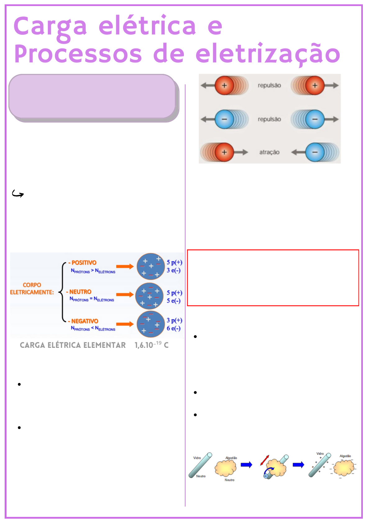 <p>Também chamada de carga líquida ou resultante, a</p><p>carga elétrica é uma propriedade associada aos</p><p>elementos constituintes do átomo - prótons e</p><p>elétrons.</p><p>A carga elétrica do próton e do elétron têm o</p><p>mesmo valor absoluto - carga elétrica elementar (o</p><p>menor valor de carga elétrica encontrado isolado na</p><p>natureza). Entretanto, apresentam</p><p>comportamentos elétricos opostos (positivo x</p><p>negativo). Já o nêutron não apresenta carga elétrica.</p><p>Carga elétrica eCarga elétrica e</p><p>Processos de eletrizaçãoProcessos de eletrização</p><p>Princípio de conservação da carga elétrica</p><p>A carga elétrica total de um sistema</p><p>eletricamente isolado é constante.</p><p>Princípio de quantização da carga elétrica</p><p>Q=n.e</p><p>Q - quantidade de carga elétrica de um corpo;</p><p>n - número inteiro de elétrons em excesso (-) ou</p><p>em falta (+)</p><p>e - carga elétrica elementar</p><p>Unidade de medida, segundo SI, é Coulomb (C)</p><p>Pode ser utilizado qualquer tipo de material</p><p>(isolante ou condutor). Entretanto, necessitam</p><p>ser diferentes para que ocorra o atrito - um</p><p>mais frágil, o que sempre perde elétrons, e</p><p>outro mais forte, que ganha elétrons.</p><p>Os corpos atritados adquirem cargas de sinais</p><p>opostos.</p><p>Em um sistema isolado, os corpos apresentam</p><p>cargas elétricas de mesmo módulo, já que a</p><p>carga elétrica do sistema é conservada.</p><p>Sendo os átomos eletricamente neutros, todo</p><p>corpo tende a se apresentar eletricamente neutro.</p><p>Portanto, eletrizar um corpo é fazer com que, no</p><p>conjunto, o n° de prótons difira do n° de elétrons, o</p><p>desequilibrando eletricamente.</p><p>Carga elétrica</p><p>Eletricidade é o termo que engloba todos</p><p>os fenômenos resultantes da existência de</p><p>carga elétrica.</p><p>Carga elétrica elementarCarga elétrica elementar 1,6.10⁻¹⁹ C1,6.10⁻¹⁹ C</p><p>Eletrizado</p><p>Eletrizado</p><p>Propriedades</p><p>Processos de eletrização</p><p>OBS.: A transferência de cargas ocorre pelo</p><p>movimento dos elétrons. Para que haja uma</p><p>alteração nos prótons, fixados no núcleo, é</p><p>necessário que ocorra uma fissão nuclear.</p><p>Atrito</p><p>Realizado entre materiais condutores (metais,</p><p>por exemplo), ligando-os por um fio ou</p><p>encostando-os.</p><p>Um corpo carregado positivamente entra em</p><p>contato com um segundo corpo neutro. Como</p><p>o primeiro estava carregado positivamente, irá</p><p>atrair os elétrons livres do corpo neutro, o</p><p>deixando positivo e, o que antes já era</p><p>positivo, continua eletrizado positivamente,</p><p>porém com uma carga menor.</p><p>A quantidade de carga que um corpo</p><p>transferirá para outro dependerá dos seus</p><p>tamanhos.</p><p>Com mesmo tamanho, devido a conservação,</p><p>os corpos apresentarão a mesma quantidade</p><p>de carga elétrica:</p><p>Os elétrons livres movem-se sob a influência</p><p>de forças elétricas externas.</p><p>O corpo que será induzido deve ser condutor.</p><p>Indução eletroestática: ocorre quando um</p><p>corpo A eletrizado (positivamente ou</p><p>negativamente) é aproximado de um corpo</p><p>neutro B, atraindo ou repelindo os elétrons</p><p>presentes nele. Nesse momento, ocorre</p><p>apenas uma polarização das cargas elétricas,</p><p>continua neutro.</p><p>Eletrização: com essa polarização, liga-se o</p><p>corpo B, agora induzido, a um fio-terra</p><p>(obrigatoriamente na parte externa). Ainda</p><p>com a presença do indutor, sobem elétrons</p><p>atraídos pelo polo positivo ou fogem os</p><p>elétrons polarizados pelo fio, eletrizando</p><p>negativamente ou positivamente o corpo B.</p><p>Desliga-se o contato com a terra e, depois,</p><p>afasta-se o indutor, espalhando as cargas pela</p><p>superfície do corpo induzido.</p><p>Para-raios são exemplos de fios-terra.</p><p>Contato</p><p>Indução</p><p>BLINDAGEM</p><p>Fenômeno físico que ocorre em materiais</p><p>condutores fazendo com que seu interior</p><p>apresente eletricidade nula. Isso ocorre devido a</p><p>distribuição de cargas elétricas no decorrer da</p><p>superfície dos condutores em equilíbrio</p><p>eletrostático. Em qualquer condutor fechado, seu</p><p>interior será nulo, primeiro pela repulsão</p><p>eletrostática e, segundo, pela mobilidade das</p><p>cargas elétricas no condutores -> estabelece que</p><p>as cargas elétricas fiquem distribuídas pela</p><p>superfície. Desse modo, quando algo ou alguém</p><p>se encontra no interior de algum condutor</p><p>fechado, estará blindado de cargas elétricas.</p><p>ATERRAMENTO</p><p>Ou simplesmente terra, é a designação para</p><p>qualquer ligação que permita tirar carga elétrica</p><p>de um corpo. A terra se caracteriza como um</p><p>corpo que atua como um reservatório de elétrons.</p>