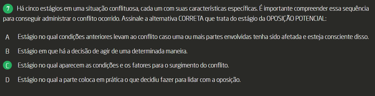 <p>7 Há cinco estágios em uma situação conflituosa, cada um com suas características específicas. É importante compreender essa seguência para conseguir administrar conflito ocorrido. Assinale a alternativa CORRETA que trata do estágio da OPOSIÇÃO POTENCIAL: A Estágio no qual condições anteriores levam ao conflito caso uma ou mais partes envolvidas tenha sido afetada e esteja consciente disso. B Estágio em que há a decisão de agir de uma determinada maneira. C Estágio no qual aparecem as condições e os fatores para surgimento do conflito. D Estágio no qual a parte coloca em prática que decidiu fazer para lidar com a oposição.</p>