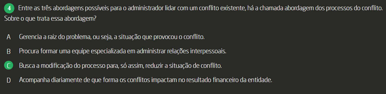 <p>4 Entre as três abordagens possíveis para administrador lidar com um conflito existente, há a chamada abordagem dos processos do conflito. Sobre que trata essa abordagem? A Gerencia a raiz do problema, ou seja, a situação que provocou conflito. B Procura formar uma equipe especializada em administrar relações interpessoais. C Busca a modificação do processo para, só assim, reduzir a situação de conflito. D Acompanha diariamente de que forma os conflitos impactam no resultado financeiro da entidade.</p>