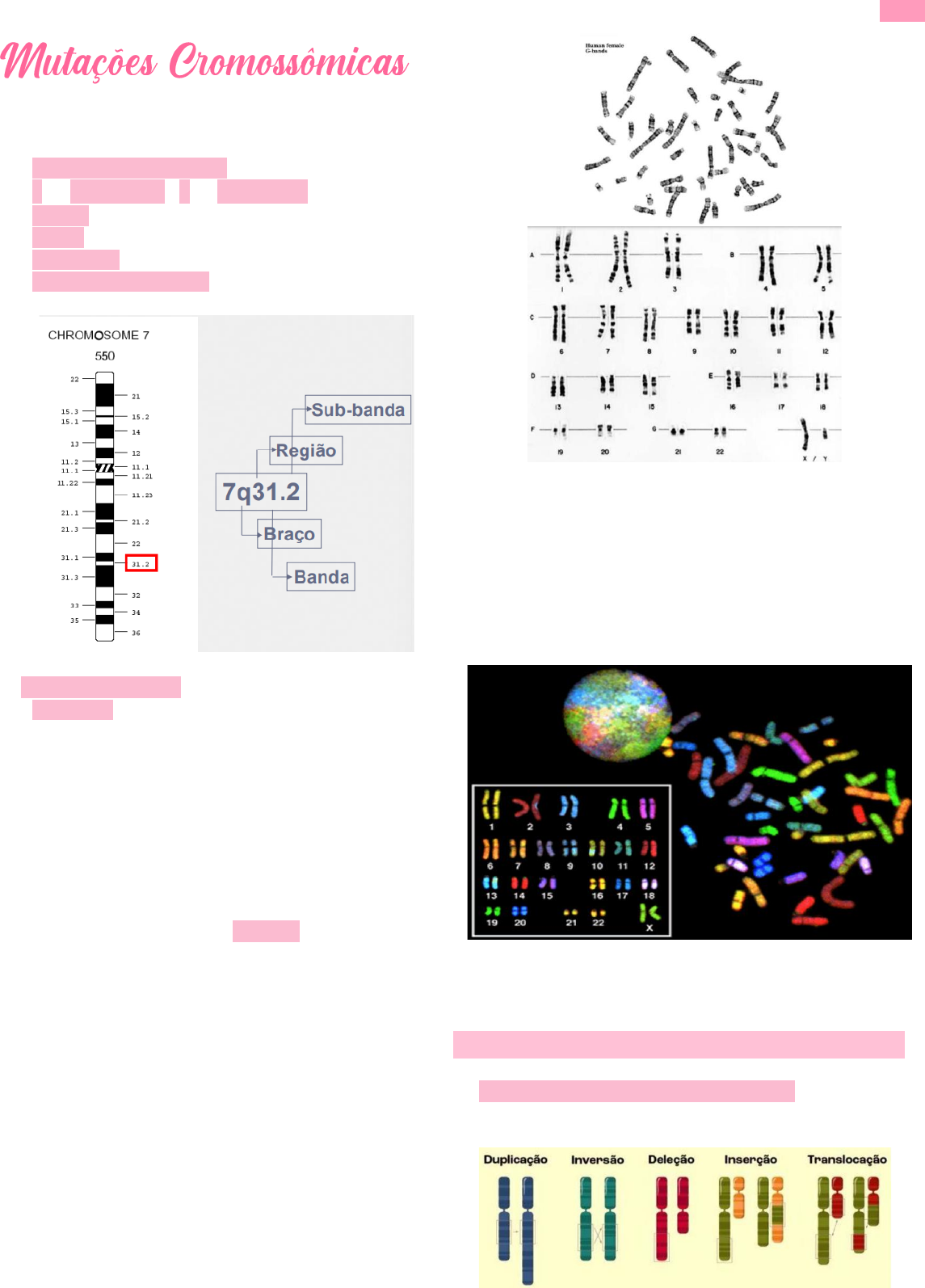 <p>Manoela Melo MEDPUC 89 – Monitoria Genética</p><p>1 Genoma Humano e Patologia Molecular</p><p>• Nomenclatura ISCN da região cromossômica</p><p>(citogenética clássica)</p><p>o Número do cromossomo</p><p>o q ➝ Braço longo / p ➝ Braço curto</p><p>o Região</p><p>o Banda</p><p>o Sub-banda</p><p>o Masculino ou feminino</p><p>• Imprinting genômico</p><p>o Inativação de regiões específicas nos</p><p>cromossomos de um dos pais</p><p>o Essas regiões não podem estar ativas nos 2</p><p>cromossomos (paterno e materno)</p><p>o Se as 2 estiverem ativas, o bebê é anormalmente</p><p>grande e morre ou mata a mãe (teoria do conflito</p><p>parental)</p><p>o Se os 2 estiverem inativos, o bebê é</p><p>anormalmente pequeno e morre</p><p>o +- 200 genes dos nossos 23.000 sofrem imprint</p><p>• Principais indicações para cariótipo</p><p>o Alterações de crescimento e desenvolvimento</p><p>▪ Atraso no desenvolvimento neuropsicomotor</p><p>▪ Face dismórfica</p><p>▪ Malformações</p><p>▪ Baixa estatura</p><p>▪ Deficiência mental</p><p>▪ Genitália ambígua</p><p>o Natimortos e óbito neonatal</p><p>o Infertilidade e abortos recorrentes</p><p>o Neoplasia</p><p>o História familiar positiva de cromossomopatia</p><p>o Gestação em mulher com idade avançada (>35</p><p>anos)</p><p>• Análise FISH (fluorescence in situ hybridization) ➝</p><p>Hibridização de sondas fluorescentes de DNA que</p><p>se ligam a regiões de complementariedade</p><p>específicas</p><p>o Facilita a organização do cariótipo e a</p><p>identificação de alterações cromossômicas</p><p>o Método caro</p><p>• Mutações cromossômicas = Alterações de partes</p><p>inteiras de cromossomos</p><p>Estruturais</p><p>• Alteração da sequência de genes em um</p><p>cromossomo</p><p>Manoela Melo MEDPUC 89 – Monitoria Genética</p><p>2 Genoma Humano e Patologia Molecular</p><p>➢ Rearranjos desbalanceados</p><p>• Modificam a "dosagem” gênica por perda ou</p><p>acréscimo de uma cópia extra</p><p>• Duplicação</p><p>o Cópia extra da região</p><p>o Duplicação em tandem ➝ Mantém a sequência</p><p>do cromossomo (a região duplicada fica junto com</p><p>a original)</p><p>o Duplicação insercional ➝ Ocorre inversão de</p><p>sequências (a parte duplicada se insere em outra</p><p>região do cromossomo)</p><p>o Síndrome de Down parcial ➝ Duplicação de uma</p><p>região do cromossomo 21</p><p>• Deleção</p><p>o Perda de parte de um braço cromossômico</p><p>o O fragmento acêntrico (sem o centrômero) é</p><p>perdido</p><p>o O efeito depende da extensão</p><p>o Intersticial (no meio do cromossomo) ou terminal</p><p>(nas extremidades dos cromossomos)</p><p>o Síndrome de Cri du Chat</p><p>▪ Aproximadamente 20 genes afetados</p><p>▪ Última porção do braço curto do cromossomo 5</p><p>▪ Face arredondada, choro característico (miado</p><p>de gatos), microcefalia, retardo</p><p>➢ Rearranjos balanceados</p><p>• Modificam a ordem dos genes no cromossomo</p><p>• Inversão</p><p>o Quebra, giro de 180° e reinserção</p><p>o Pericêntrica ➝ Inversão de um fragmento dentro</p><p>de um mesmo braço</p><p>o Paracêntrica ➝ Inversão de um fragmento que</p><p>abrange o centrômero</p><p>o Ocorre a formação de uma alça de inversão no</p><p>momento do pareamento entre cromossomos</p><p>homólogos</p><p>Manoela Melo MEDPUC 89 – Monitoria Genética</p><p>3 Genoma Humano e Patologia Molecular</p><p>o Síndrome da Inversão Pericêntrica do</p><p>Cromossomo 9</p><p>▪ Deficiência intelectual, malformações</p><p>congênitas (anomalias cardíacas, renais ou</p><p>craniofaciais), infertilidade</p><p>▪ Comum em casos de síndrome de Turner</p><p>• Translocação</p><p>o Recíproca ➝ Troca de fragmentos acêntricos</p><p>entre cromossomos por quebras simultâneas</p><p>▪ Pode gerar deleção ou duplicação</p><p>▪ Leucemia Mieloide Crônica</p><p>- Translocação recíproca entre os cromossomos</p><p>9 e 22</p><p>- Formação do cromossomo Filadélfia (Ph),</p><p>geralmente o 22</p><p>- Fusão do gene BCR (cromossomo 22) com o</p><p>ABL1 (cromossomo 9) ⇢ Criação de um novo</p><p>gene (BCR-ABL1) ⇢ Proteína oncogênica</p><p>o Não recíproca</p><p>▪ A parte do cromossomo A vai para o B, mas a</p><p>parte do B se perde (não vai para o A, sofre</p><p>deleção)</p><p>o Robertsoniana ➝ Ocorre entre cromossomos</p><p>acrocêntricos (centrômero na extremidade)</p><p>humanos (13, 14, 15, 21, 22)</p><p>▪ 2 cromossomos acrocêntricos quebram na</p><p>região do centrômero</p><p>▪ Ocorre a fusão cêntrica (fusão entre as 2 partes</p><p>com centrômero dos cromossomos quebrados)</p><p>- Forma-se um cromossomo dicêntrico,</p><p>estável na mitose</p><p>- Se for no 21 com 14, pode gerar síndrome</p><p>de Down</p><p>▪ Os 2 fragmentos acêntricos (sem centrômero,</p><p>menores) são perdidos</p><p>Manoela Melo MEDPUC 89 – Monitoria Genética</p><p>4 Genoma Humano e Patologia Molecular</p><p>▪ Pode ocorrer a fusão entre as porções</p><p>acrocêntricas dos 2 cromossomos de mesmo n°</p><p>(homólogos), formando um isocromossomo (Se</p><p>ocorrer no 21 de um dos gametas, pode gerar</p><p>síndrome de Down)</p><p>Numéricas</p><p>• Alteração no número de cromossomos</p><p>• Responsáveis por 50% dos abortamentos do 1°</p><p>trimestre</p><p>• A prevalência de muitas das síndromes apresenta</p><p>íntima relação com a idade materna</p><p>• É possível que uma síndrome ocorra por</p><p>responsabilidade paterna, mas é mais raro ➝</p><p>Espermatozoides alterados não saem do lugar (+</p><p>pesados, com problemas de mobilidade), portanto</p><p>não chegam à etapa da fertilização</p><p>• Euploidias</p><p>o Alteração do conteúdo genômico total (na ploidia,</p><p>conjuntos genômicos) do indivíduo (3n, 4n, ...)</p><p>o Levam geralmente ao aborto no 1° trimestre</p><p>o Sem influência da idade materna</p><p>o