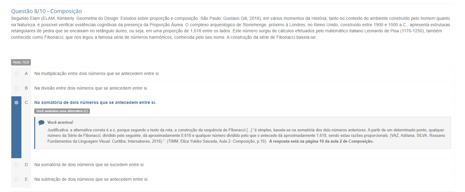 <p>Questão 8/10 - Composição Segundo Elam (ELAM, Kimberly. Geometria do Design: Estudos sobre proporção e São Paulo: Gustavo Gili, 2018), em vários momentos da tanto no contexto do ambiente construído pelo homem quanto na Natureza, é possível verificar evidências cognitivas da presença da Proporção complexo arqueológico de próximo à no Reino Unido, construído entre 1900 e 1500 a.C., apresenta estruturas retangulares de pedra que se encaixam no retângulo ou seja, em uma proporção de 1,618 entre os lados. Este surgiu de cálculos efetuados pelo matemático italiano Leonardo de Pisa (1170-1250), também conhecido como Fibonacci, que nos legou a famosa série de conhecida pelo seu A construção da série de Fibonacci Nota: 10.0 A Na multiplicação entre dois que se antecedem entre B Na divisão entre dois que se antecedem entre C Na somatória de dois números que se antecedem entre si. Você assinalou essa alternativa (C) Você acertou! Justificativa: a alternativa correta é a porque segundo 0 texto da a construção da sequência de Fibonacci simples, baseia-se na somatória dos dois números A partir de um determinado ponto, qualquer da Série de Fibonacci, dividido pelo seguinte, dá aproximadamente e qualquer número dividido pelo que antecede dá aproximadamente 1,618, sendo estas razões proporcionais. (VAZ, Adriana; Fundamentos da Linguagem Curitiba: Intersaberes, 2016) (TIMM, Eliza Yukiko Sawada, Aula 2- Composição, p.10). A resposta está na página 10 da aula 2 de Composição. D Na somatória de dois que se sucedem entre E Na subtração de dois que se antecedem entre</p>