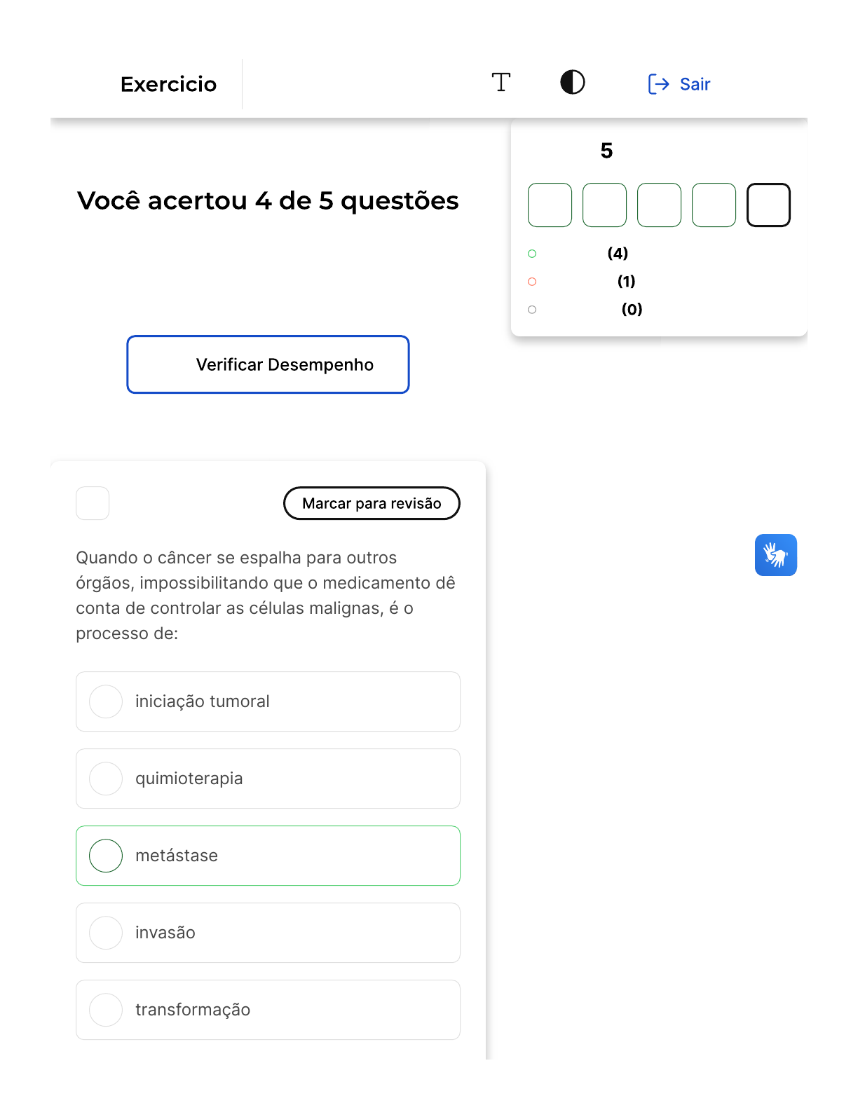 <p>Verifique o seu desempenho e continue</p><p>treinando! Você pode refazer o exercício</p><p>quantas vezes quiser.</p><p>A</p><p>B</p><p>C</p><p>D</p><p>E</p><p>1</p><p>Quando o câncer se espalha para outros</p><p>órgãos, impossibilitando que o medicamento dê</p><p>conta de controlar as células malignas, é o</p><p>processo de:</p><p>iniciação tumoral</p><p>quimioterapia</p><p>metástase</p><p>invasão</p><p>transformação</p><p>Questão de 5</p><p>Corretas</p><p>Incorretas</p><p>Em branco</p><p>1 2 3 4 5</p><p>Conteúdo</p><p>Firefox https://estacio.saladeavaliacoes.com.br/exercicio/662456c9139d33d914...</p><p>1 of 8 20/04/2024, 21:03</p><p>A</p><p>B</p><p>Parabéns, você selecionou a</p><p>alternativa correta. Confira o gabarito</p><p>comentado!</p><p>Quando se perde o controle da doença ou o</p><p>diagnóstico é muito tarde, pode ocorrer a</p><p>metátase que é quando o câncer se</p><p>espalha pelo organismo.</p><p>2</p><p>Para que a prática no hospital frente ao</p><p>paciente com câncer seja realizada, é preciso</p><p>conhecer as características da doença, de</p><p>forma que o psicólogo esteja preparado para</p><p>abordar o paciente e seus familiares. A respeito</p><p>do câncer podemos dizer que:</p><p>Geralmente, o paciente já vai ao</p><p>médico com dados sobre a doença,</p><p>devido as pesquisa que faz na internet,</p><p>o que contribui para que as crenças</p><p>positivas sejam instaladas.</p><p>É uma doença invasiva, que</p><p>compromete o físico e emocional do</p><p>paciente.</p><p>Firefox https://estacio.saladeavaliacoes.com.br/exercicio/662456c9139d33d914...</p><p>2 of 8 20/04/2024, 21:03</p><p>C</p><p>D</p><p>E</p><p>Adoece somente quem está com o</p><p>câncer.</p><p>As pesquisas indicam que os países</p><p>em desenvolvimento tem uma menor</p><p>probabilidade para o aumento do</p><p>índice do câncer em comparação aos</p><p>já desenvolvidos, devido aos hábitos</p><p>alimentares e a obesidade nesses</p><p>países.</p><p>O pensamento da morte surge quando</p><p>a doença já está em estágio avançado.</p><p>Parabéns, você selecionou a</p><p>alternativa correta. Confira o gabarito</p><p>comentado!</p><p>Um serviço de Psico-oncologia deve ser</p><p>capaz de não só atender as demandas</p><p>emocionais do paciente, mas também de</p><p>sua família que sofre junto com ele. Cabe</p><p>também ao profissional de psicologia dá</p><p>suporte emocional a equipe de saúde que</p><p>lida diariamente com situações limites. Não</p><p>podemos esquecer que pesquisas precisam</p><p>e devem ser desenvolvidas com a</p><p>finalidade de discutir a psicologia voltada</p><p>para a oncologia, construindo novos</p><p>conhecimentos e possibilidades de</p><p>intervenção.</p><p>Firefox https://estacio.saladeavaliacoes.com.br/exercicio/662456c9139d33d914...</p><p>3 of 8 20/04/2024, 21:03</p><p>A</p><p>B</p><p>C</p><p>D</p><p>E</p><p>3</p><p>Para que a prática no hospital frente ao</p><p>paciente com câncer seja realizada, é preciso</p><p>conhecer as características da doença, de</p><p>forma que o psicólogo esteja preparado para</p><p>abordar o paciente e seus familiares. A respeito</p><p>do câncer podemos dizer que:</p><p>Geralmente, o paciente já vai ao</p><p>médico com dados sobre a doença,</p><p>devido as pesquisa que faz na internet,</p><p>o que contribui para que as crenças</p><p>positivas sejam instaladas.</p><p>É uma doença invasiva, que</p><p>compromete o físico e emocional do</p><p>paciente.</p><p>Adoece somente quem está com o</p><p>câncer.</p><p>As pesquisas indicam que os países</p><p>em desenvolvimento tem uma menor</p><p>probabilidade para o aumento do</p><p>índice do câncer em comparação aos</p><p>já desenvolvidos, devido aos hábitos</p><p>alimentares e a obesidade nesses</p><p>países.</p><p>O pensamento da morte surge quando</p><p>a doença já está em estágio avançado.</p><p>Firefox https://estacio.saladeavaliacoes.com.br/exercicio/662456c9139d33d914...</p><p>4 of 8 20/04/2024, 21:03</p><p>A</p><p>B</p><p>C</p><p>D</p><p>Parabéns, você selecionou a</p><p>alternativa correta. Confira o gabarito</p><p>comentado!</p><p>O psicólogo quando atua na oncologia deve</p><p>conhecer o câncer como uma doença que</p><p>não só atinge o corpo, mas invade o</p><p>emocional do paciente. É uma doença, que</p><p>no imaginário popular, surge como uma</p><p>sentença de morte, é invasiva com</p><p>tratamento que agride e enfraquece o</p><p>paciente.</p><p>4</p><p>Dentre os fatores ambientais causadores do</p><p>câncer estão:</p><p>tabagismo, radiação, ionizante e</p><p>álcool.</p><p>tabagismo, envelhecimento, ionizante</p><p>e álcool.</p><p>tabagismo, radiação, obesidade e</p><p>álcool.</p><p>tabagismo, radiação, herança genética</p><p>e obesidade</p><p>Firefox https://estacio.saladeavaliacoes.com.br/exercicio/662456c9139d33d914...</p><p>5 of 8 20/04/2024, 21:03</p><p>E</p><p>A</p><p>B</p><p>envelhecimento, radiação, ionizante e</p><p>álcool</p><p>Parabéns, você selecionou a</p><p>alternativa correta. Confira o gabarito</p><p>comentado!</p><p>Sem dúvida, muitos fatores ambientais</p><p>podem contribuir para o aparecimento do</p><p>câncer, entre eles o tabagismo, radiação,</p><p>ionizante e álcool.</p><p>5</p><p>Para uma boa intervenção psicológica ao</p><p>tratamento do paciente com câncer é preciso</p><p>que as seguintes etapas sejam seguidas.</p><p>Primeiro � Triagem Psicológica,</p><p>Segundo � Atendimento à Família e</p><p>Terceiro � Atendimento Pós-óbito.</p><p>Primeiro � Atendimento Pós-óbito,</p><p>Segundo � Atendimento à Família e</p><p>Terceiro � Triagem Psicológica.</p><p>Firefox https://estacio.saladeavaliacoes.com.br/exercicio/662456c9139d33d914...</p><p>6 of 8 20/04/2024, 21:03</p><p>C</p><p>D</p><p>E</p><p>Primeiro � Atendimento Pós-óbito,</p><p>Segundo � Grupo de Orientação e</p><p>Terceiro � Triagem Psicológica.</p><p>Primeiro � Atendimento à