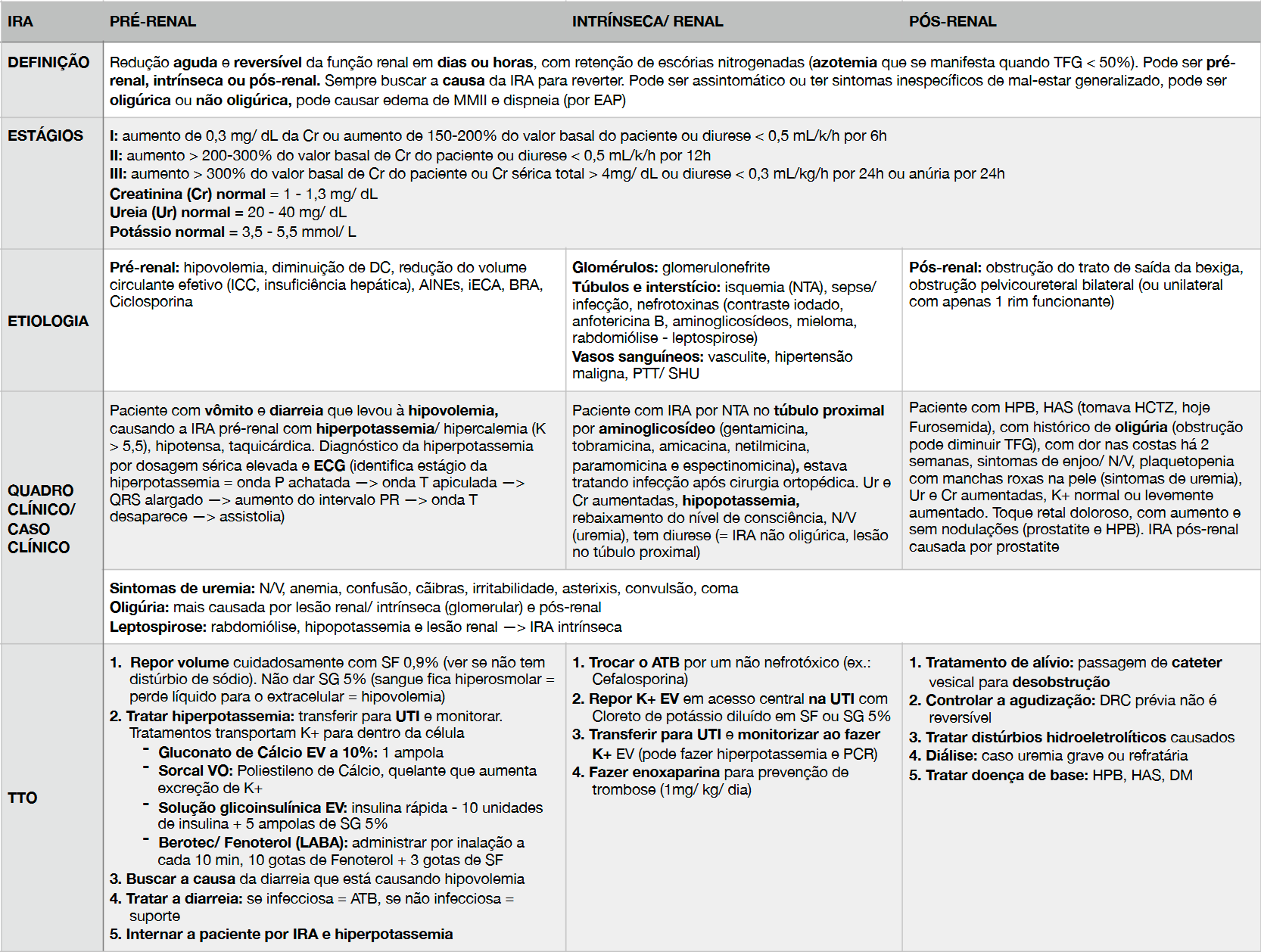 <p>IRA PRÉ-RENAL RENAL PÓS-RENAL DEFINIÇÃO Redução aguda e reversível da função renal em dias ou horas, com retenção de escórias nitrogenadas (azotemia que se manifesta quando TFG < 50%). Pode ser pré- renal, intrínseca ou pós-renal. Sempre buscar a causa da IRA para reverter. Pode ser assintomático ou ter sintomas inespecíficos de mal-estar generalizado, pode ser oligúrica ou não oligúrica, pode causar edema de MMII e dispneia (por EAP) ESTÁGIOS I: aumento de 0,3 mg/ dL da Cr ou aumento de 150-200% do valor basal do paciente ou diurese < 0,5 mL/k/h por 6h II: aumento > 200-300% do valor basal de Cr do paciente ou diurese < 0,5 mL/k/h por 12h III: aumento > 300% do valor basal de Cr do paciente ou Cr sérica total > 4mg/ dL ou diurese < 0,3 mL/kg/h por 24h ou anúria por 24h Creatinina (Cr) normal = 1 1,3 mg/ dL Ureia (Ur) normal = 20 40 mg/ dL Potássio normal = 3,5 5,5 mmol/ L Pré-renal: hipovolemia, diminuição de DC, redução do volume Glomérulos: glomerulonefrite Pós-renal: obstrução do trato de saída da bexiga, circulante efetivo (ICC, insuficiência hepática), AINEs, iECA, BRA, Túbulos e interstício: isquemia (NTA), sepse/ obstrução pelvicoureteral bilateral (ou unilateral Ciclosporina infecção, nefrotoxinas (contraste iodado, com apenas 1 rim funcionante) ETIOLOGIA anfotericina B, aminoglicosídeos, mieloma, rabdomiólise leptospirose) Vasos sanguíneos: vasculite, hipertensão maligna, PTT/ SHU Paciente com vômito e diarreia que levou à hipovolemia, Paciente com IRA por NTA no túbulo proximal Paciente com HPB, HAS (tomava HCTZ, hoje causando a IRA pré-renal com hiperpotassemia/ hipercalemia (K por aminoglicosídeo (gentamicina, Furosemida), com histórico de oligúria (obstrução > 5,5), hipotensa, taquicárdica. Diagnóstico da hiperpotassemia tobramicina, amicacina, netilmicina, pode diminuir TFG), com dor nas costas há 2 por dosagem sérica elevada e ECG (identifica estágio da paramomicina e espectinomicina), estava semanas, sintomas de enjoo/ N/V, plaquetopenia QUADRO hiperpotassemia = onda P achatada onda T apiculada tratando infecção após cirurgia ortopédica. e com manchas roxas na pele (sintomas de uremia), QRS alargado aumento do intervalo PR onda T Ur e Cr aumentadas, K+ normal ou levemente CLÍNICO/ Cr aumentadas, hipopotassemia, desaparece assistolia) rebaixamento do nível de consciência, N/V aumentado. Toque retal doloroso, com aumento e CASO (uremia), tem diurese (= IRA não oligúrica, lesão sem nodulações (prostatite e HPB). IRA pós-renal CLÍNICO no túbulo proximal) causada por prostatite Sintomas de uremia: N/V, anemia, confusão, irritabilidade, asterixis, convulsão, coma Oligúria: mais causada por lesão (glomerular) e pós-renal Leptospirose: rabdomiólise, hipopotassemia e lesão renal IRA intrínseca 1. Repor volume cuidadosamente com SF 0,9% (ver se não tem 1. Trocar o ATB por um não nefrotóxico (ex.: 1. Tratamento de alívio: passagem de cateter distúrbio de sódio). Não dar SG 5% (sangue fica hiperosmolar = Cefalosporina) vesical para desobstrução perde líquido para o extracelular = hipovolemia) 2. K+ EV em acesso central na UTI com 2. Controlar a agudização: DRC prévia não é 2. Tratar hiperpotassemia: transferir para UTI monitorar. Cloreto de potássio diluído em SF ou SG 5% reversível Tratamentos transportam K+ para dentro da célula 3. Transferir para UTI e monitorizar ao fazer 3. Tratar distúrbios hidroeletrolíticos causados Gluconato de Cálcio EV a 10%: 1 ampola K+ EV (pode fazer hiperpotassemia e PCR) 4. Diálise: caso uremia grave ou refratária Sorcal VO: Poliestileno de Cálcio, quelante que aumenta 4. Fazer enoxaparina para prevenção de 5. Tratar doença de base: HPB, HAS, DM excreção de K+ TTO trombose (1mg/kg/ dia) Solução glicoinsulínica EV: insulina rápida 10 unidades de insulina + 5 ampolas de SG 5% Berotec/ Fenoterol (LABA): administrar por inalação a cada 10 min, 10 gotas de Fenoterol + 3 gotas de SF 3. Buscar a causa da diarreia que está causando hipovolemia 4. Tratar a diarreia: se infecciosa = ATB, se não infecciosa = suporte 5. Internar a paciente por IRA e hiperpotassemia</p>
