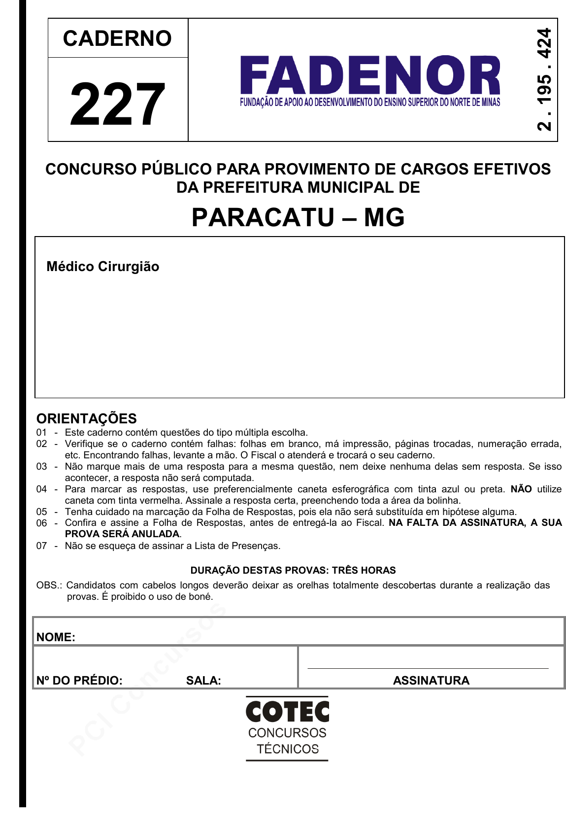 <p>pcimarkpci MjgwNDowMzg5OmIxNjM6NmRmMDowYzY2OjJjNzI6YmI3NDo4YmIz:TW9uLCAxNiBTZXAgMjAyNCAxMjo1NzoxNyAtMDMwMA==</p><p>www.pciconcursos.com.br</p><p>CONCURSO PÚBLICO PARA PROVIMENTO DE CARGOS EFETIVOS</p><p>DA PREFEITURA MUNICIPAL DE</p><p>PARACATU – MG</p><p>ORIENTAÇÕES</p><p>01 - Este caderno contém questões do tipo múltipla escolha.</p><p>02 - Verifique se o caderno contém falhas: folhas em branco, má impressão, páginas trocadas, numeração errada,</p><p>etc. Encontrando falhas, levante a mão. O Fiscal o atenderá e trocará o seu caderno.</p><p>03 - Não marque mais de uma resposta para a mesma questão, nem deixe nenhuma delas sem resposta. Se isso</p><p>acontecer, a resposta não será computada.</p><p>04 - Para marcar as respostas, use preferencialmente caneta esferográfica com tinta azul ou preta. NÃO utilize</p><p>caneta com tinta vermelha. Assinale a resposta certa, preenchendo toda a área da bolinha.</p><p>05 - Tenha cuidado na marcação da Folha de Respostas, pois ela não será substituída em hipótese alguma.</p><p>06 - Confira e assine a Folha de Respostas, antes de entregá-la ao Fiscal. NA FALTA DA ASSINATURA, A SUA</p><p>PROVA SERÁ ANULADA.</p><p>07 - Não se esqueça de assinar a Lista de Presenças.</p><p>DURAÇÃO DESTAS PROVAS: TRÊS HORAS</p><p>OBS.: Candidatos com cabelos longos deverão deixar as orelhas totalmente descobertas durante a realização das</p><p>provas. É proibido o uso de boné.</p><p>NOME:</p><p>Nº DO PRÉDIO: SALA:</p><p>ASSINATURA</p><p>CADERNO</p><p>227</p><p>Médico Cirurgião</p><p>2</p><p>.</p><p>1</p><p>9</p><p>5</p><p>.</p><p>4</p><p>2</p><p>4</p><p>pcimarkpci MjgwNDowMzg5OmIxNjM6NmRmMDowYzY2OjJjNzI6YmI3NDo4YmIz:TW9uLCAxNiBTZXAgMjAyNCAxMjo1NzoxNyAtMDMwMA==</p><p>www.pciconcursos.com.br</p><p>2</p><p>PROVA DE CONHECIMENTOS ESPECÍFICOS</p><p>QUESTÃO 01</p><p>Paciente de 30 anos, vítima de acidente automobilístico, é atendido na cena do trauma pela equipe de serviço móvel</p><p>de urgência. A primeira etapa a ser realizada é</p><p>A) iniciar manobras de ressuscitação, ao chegar na cena, imediatamente.</p><p>B) garantir a segurança do ambiente e da equipe de atendimento.</p><p>C) realizar o ABCDE, ao chegar na cena, e transportar o paciente.</p><p>D) puncionar dois acessos venosos e garantir a via área do paciente.</p><p>E) examinar se a vítima respira e tem pulso, para avaliar o transporte.</p><p>QUESTÃO 02</p><p>Paciente com diagnóstico de neoplasia gástrica em antro, 58 anos, com estadiamento pré-operatório cT2N1Mx. Após</p><p>discussão clínica, optou-se por abordagem cirúrgica. Marque a alternativa CORRETA.</p><p>A) A reconstrução a Billroth II não deve mais ser realizada em nenhum caso, devido a complicações pós-operatórias,</p><p>como a gastrite alcalina, a síndrome da alça eferente ou da alça aferente.</p><p>B) Os tratamentos adjuvantes, como a rádio e a quimioterapia, só são necessários em caso de ressecção tumoral</p><p>incompleta ou em caso de gastrectomia parcial.</p><p>C) O tratamento cirúrgico ideal é a gastrectomia com linfadenectomia a DII e a reconstrução em “y” de Roux,</p><p>podendo ser parcial ou total, a depender da topografia e histologia tumoral.</p><p>D) A laparoscopia para avaliação de extensão de doença não tem valor prognóstico e não deve mais ser realizada,</p><p>por retardar o tratamento final.</p><p>E) As fístulas e os sangramentos anastomóticos são as principais complicações pós-operatórias, necessitando</p><p>sempre de intervenção cirúrgica precoce.</p><p>QUESTÃO 03</p><p>Paciente, vítima de trauma abdominal contuso por acidente automobilístico, é admitido no hospital após transporte</p><p>adequado da equipe pré-hospitalar. Em relação ao atendimento hospitalar, assinale a alternativa CORRETA.</p><p>A) A tomografia computadorizada é o padrão-ouro para classificação do trauma abdominal contuso, mesmo quando</p><p>já existe indicação de laparotomia ou o paciente se encontra instável.</p><p>B) O lavado peritoneal diagnóstico, exame altamente sensível que independe de interpretação do examinador e</p><p>diagnostica até pequenas lesões viscerais, altera todas as avaliações futuras e não pode ser repetido.</p><p>C) O paciente com evisceração deve ser manejado apenas com fechamento das lesões de parede, inexistindo</p><p>indicação formal de laparotomia de urgência.</p><p>D) O ultrassom FAST é um exame não invasivo que pode ser repetido sempre que necessário, principalmente em</p><p>paciente instáveis hemodinamicamente, podendo ser um critério para a indicação de laparotomia.</p><p>E) A ausência de dor abdominal, no caso de trauma raquimedular, com o paciente estável hemodinamicamente e</p><p>consciente, é suficiente para descartar a necessidade de laparotomia.</p><p>QUESTÃO 04</p><p>Paciente de 45 anos, vítima de politrauma grave, é submetido à intervenção cirúrgica de urgência e seu estado</p><p>evolui com rabdomiólise no pós-operatório. Assinale a alternativa CORRETA.</p><p>A) O diagnóstico depende da dosagem de CK urinária.</p><p>B) A hemodiálise é indicada nesse diagnóstico, independentemente da função renal.</p><p>C) Os níveis séricos de potássio habitualmente não se alteram nesses casos.</p><p>D) O plasma fresco congelado é indicado em todos os casos, pois auxilia na depuração da mioglobulina, uma das</p><p>causas da lesão renal.</p><p>E) A terapia de suporte clínico com hidratação do paciente, na fase inicial, é o ideal a fim de prevenir a lesão renal</p><p>aguda.</p><p>QUESTÃO 05</p><p>O acidente por picada de escorpião é de grande importância na nossa região pela sua frequência e gravidade, em</p><p>especial na faixa etária pediátrica. Considerando esse assunto, assinale a alternativa CORRETA.</p><p>A) Na classificação moderada, estão presentes manifestações locais como por exemplo dores, e, ocasionalmente,</p><p>há vômitos, taquicardia e agit