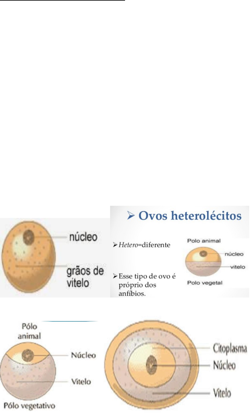 <p>07 - INTRODUÇÃO À EMBRIOLOGIA</p><p>- A EMBRIOLOGIA é o Ramo da biologia que estuda o</p><p>desenvolvimento embrionário. Esse desenvolvimento faz parte de um processo maior, chamado ontogenia ou ontogênese, que corresponde ao desenvolvimento do indivíduo desde o ovo até a fase adulta.</p><p>- (2) Zigoto ou célula-ovo ou simplesmente ovo é como é chamada a célula formada a partir da união de dois gametas.</p><p>TIPOS DE OVOS</p><p>- Os ovos dos animais são classificados de acordo com a quantidade e distribuição de</p><p>vitelo em seu citoplasma.</p><p>- Eles podem ser, oligolécitos, heterolécitos, telolécitos e centrolécitos.</p><p>- O vitelo é a substância nutritiva presente no ovo que ajuda no desenvolvimento inicial do embrião.</p><p>- O vitelo pode estar distribuído por todo o ovo, ou então concentrado em polos. O polo animal é aquele em que estão presentes o núcleo e as organelas. No polo vegetal,</p><p>observa-se apenas vitelo. O padrão de distribuição do vitelo está diretamente relacionado com a forma como a clivagem ocorre.</p><p>OVO OLIGOLÉCITO OVO HETEROLÉCITO</p><p>OVO TELOLÉCITO OVO CENTROLÉCITO</p><p>Oligolécitos</p><p>- forma esférica, pequena quantidade de vitelo distribuído de forma homogênia pelo citoplasma.</p><p>- Encontrados em poríferos, celenterados, equinodermas e alguns cordados</p><p>(protocordados e mamíferos).</p><p>- Nos mamíferos. É usual a designação especial de metalécito.</p><p>Heterolécitos</p><p>- Esféricos com uma quantidade média de vitelo distribuída de forma irregular e polarizada.</p><p>- Pequena quantidade no pólo animal e no pólo oposto (vegetativo) maior quantidade.</p><p>- Platelmintos, asquelmintos, anelídeos, moluscos (exceto cefalópodes) e alguns cordados (anfíbios)</p><p>- São representados por alguns invertebrados aquáticos : peixes, anfíbios.</p><p>Telolécitos com diferenciação polar completa ou megalécitos.</p><p>- Forma esférica, grande quantidade de vitelo, totalmente localizado no pólo vegetativo e bem</p><p>separado do pólo animal.</p><p>- Moluscos cefalópodes, peixes, répteis, aves e alguns raros mamíferos primitivos</p><p>(ornitorrincos e equidnas)</p><p>Centrolécito</p><p>- Forma elíptica, possui uma boa quantidade de vitelo, separando o citoplasma em parte central, ao redor do núcleo, e outra periférica, perto da membrana plasmática</p><p>- Artrópodes-Os artrópodes mais conhecidos são os insetos (formigas, cigarras, borboletas), mas esse filo também é composto pelos crustáceos (caranguejos, siris, camarões), aracnídeos (aranhas, escorpiões), quilópodes (lacraias) e diplópodes (piolho-de-cobra).</p><p>Fases do desenvolvimento embrionário</p><p>SEGMENTAÇÃO – GASTRULAÇÃO – ORGANOGÊNESE</p><p>Segmentação ou clivagem</p><p>- As divisões mitóticas que acontecem a partir da célula-ovo ou zigoto dão origem as várias células menores, chamadas, blastômeros.</p><p>- Ocorre aumento de número de células, mas praticamente não há aumento do volume total do embrião em relação ao volume do ovo.</p><p>- Isso acontece porque as divisões celulares são muito rápidas.</p><p>- No reino animal, a diferença na quantidade e na distribuição do</p><p>vitelo no ovo determina diferença na segmentação, pois a</p><p>quantidade de vitelo influi na velocidade de divisão da célula.</p><p>- Quanto maior a quantidade de vitelo, menor a velocidade de divisão.</p><p>Tipos de segmentação:</p><p>- Holoblástica- ocorre no ovo todo;</p><p>- Meroblástica: ocorre só em parte do ovo.</p><p>Segmentação holoblástica</p><p>Segmentação holoblástica igual e desigual</p><p>Segmentação holoblástica subigual</p><p>Segmentação meroblástica</p><p>Tipos</p><p>- Discoidal- as divisões ocorrem apenas na região da cicatrícula</p><p>(região da célula sem vitelo), formando-se um disco de células</p><p>sobre a massa do vitelo.</p><p>- Esse tipo de segmentação ocorre nos ovos telolécitos.</p><p>superficial ocorre nos ovos centrolécitos. As células embrionárias ficam dispostas na superfície do ovo.</p><p>Tipos de segmentação</p><p>FASES DA SEGMENTAÇÃO Holoblástica total (oligolécito)</p><p>- Primeira clivagem vertical</p><p>- Segunda clivagem vertical</p><p>- Terceira clivagem transversal</p><p>- Quarta clivagem vertical</p><p>- Quinta clivagem transversal = 32 blastômeros = Mórula</p><p>Segmentação especial do ovo miolécito (heterolécito) dos mamíferos</p><p>Gastrulação</p><p>- A forma mais simples de gastrulação é a que ocorre por embolia ou invaginação. Nesse tipo de gastrulação, em determinado local do polo vegetativo da blástula as células invaginam-se para o interior da blastocele.</p><p>- Forma-se assim, outra cavidade chamada de arquêntero ou intestino primitivo, que se comunica com o exterior por um orificio chamado de blastóporo. Este corresponde ao local onde ocorreu a invaginação.</p><p>- O blastóporo pode dar origem a boca ou ao ânus, e em função do destino do blastóporo os animais são classificados em:</p><p>* Protostômios: o blastóporo dará origem à boca, e em alguns casos à boca e o ânus. Ex: platelmintos, nematódeos, moluscos, anelídeos e artrópodes.</p><p>* Deuterostômios- o blastóporo dará origem ao ânus. É o caso dos equinodermas( estrela do</p><p>mar) e cordados.</p><p>- Ocorre também a diferenciação dos folhetos germinativos, que na organogênese darão origem aos tecidos e órgãos.</p><p>Folhetos germinativos</p><p>Organogênese</p><p>- A organogênese tem inicio com a diferenciação de tecidos a partir dos folhetos germinativos e, na maioria dos grupos animais, a diferenciação dos órgãos e sistemas a partir da interação de tecidos distintos.</p><p>- Vamos estudar a organogênese dos cordados, grupo animal que tem uma característica básicas : a presença da notocorda.</p><p>Embriogênese do anfioxo</p><p>- É um exemplo de cordado primitivo , possui ovo do tip