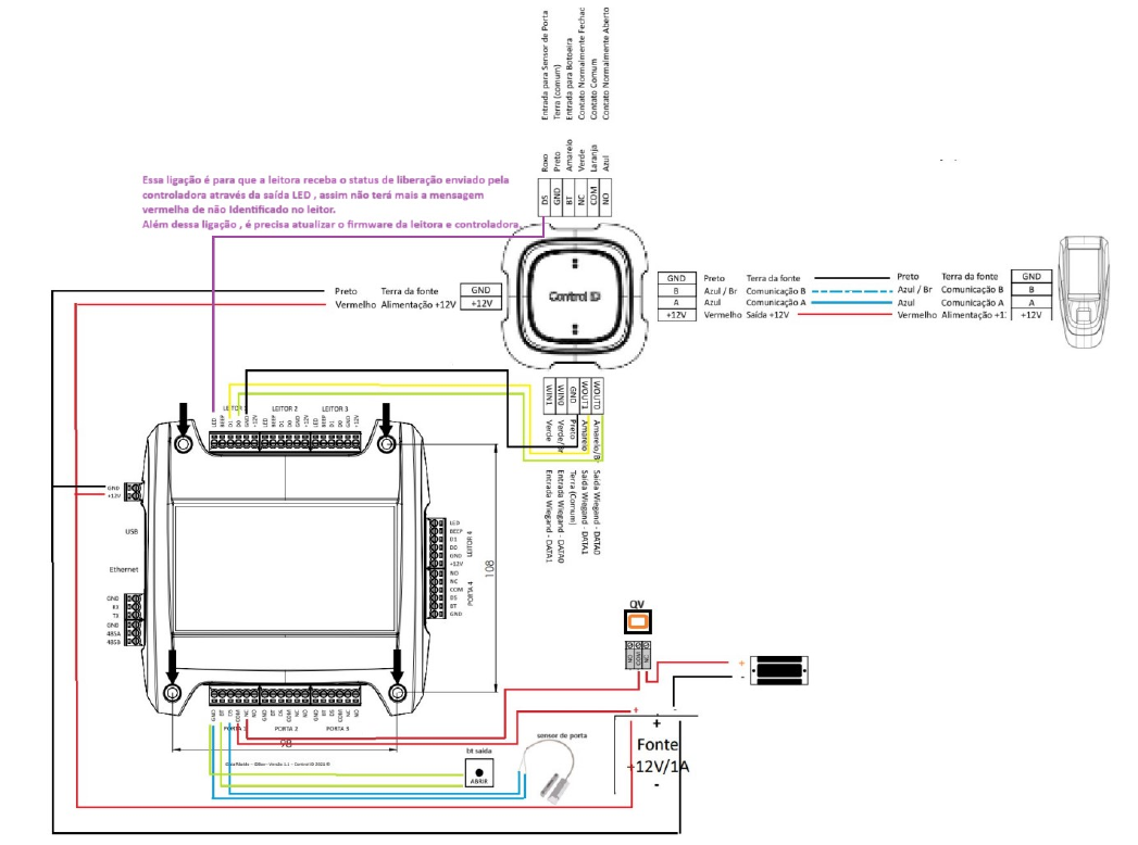 <p>de Essa ligação é para que a leitora receba o status de liberação enviado pela controladora através da saída LED assim não terá mais a mensagem vermelha de não Identificado no leitor. Além dessa ligação é precisa atualizar o firmware da leitora e controladora : GND Preto Terra fonte Preto Terra da fonte GND Preto GND B Azul Br Comunicação E Azul Br Comunicação B B Control D Vermelho Alimentação +12V +12V A Azul Comunicação A Azul Comunicação A A +12V Vermelho Vermelho Alimentação +1 +12V LEITOR Verde Verde G GND LED USB Ethernet 08 GND COM QV GND TX + PORTA: PORTA 3 Fonte</p>