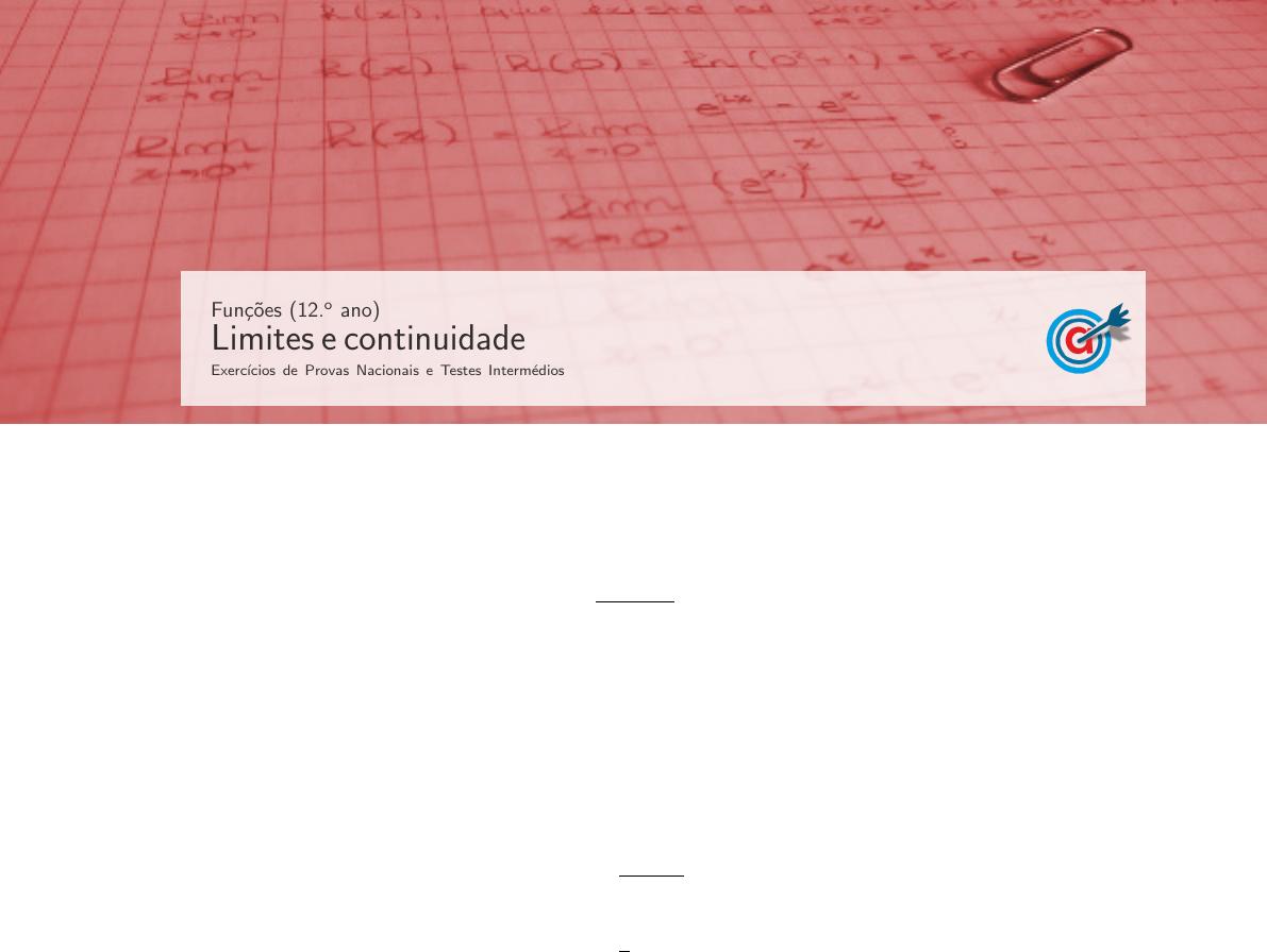 <p>Funções (12.o ano)</p><p>Limites e continuidade</p><p>Exerćıcios de Provas Nacionais e Testes Intermédios</p><p>1. Considere a função g , de domı́nio R, definida por</p><p>g(x) =</p><p></p><p>4x− 4</p><p>ex−1 − 1</p><p>se x < 1</p><p>7× 3x−1 − 3 se x ≥ 0</p><p>Averigue, sem recorrer à calculadora, se a função g é cont́ınua em x = 1 .</p><p>Exame – 2023, 1.a Fase</p><p>2. Seja f a função, de domı́nio R, definida por</p><p>f(x) =</p><p></p><p>3x</p><p>e5x − 1</p><p>se x 6= 0</p><p>3</p><p>5</p><p>se x = 0</p><p>Averigue, sem recorrer à calculadora, se a função f é cont́ınua em x = 0 .</p><p>Exame – 2022, Ép. especial</p><p>3. Para conhecer a variação do número de bactérias de uma determinada estirpe, colocou-se num tubo de</p><p>ensaio fechado, com alguns nutrientes, um certo número de bactérias dessa estirpe.</p><p>Admita que, nessas condições, o número, N , em milhares, de bactérias vivas existentes no tubo, t horas</p><p>após a sua colocação nesse tubo, é dado por</p><p>N(t) = N0e</p><p>1,08t−0,3t2</p><p>em que N0 representa a dimensão, em milhares, da população inicial.</p><p>Com o decorrer do tempo, para que tende o número de bactérias vivas existentes no tubo?</p><p>(A) +∞ (B) 0,78N0 (C) N0 (D) 0</p><p>Exame – 2021, Ép. especial</p><p>mat.absolutamente.net</p><p>4. Resolva este item sem recorrer à calculadora.</p><p>Considere, para um certo número real k, a função g, de domı́nio R \ {0}, definida por</p><p>g(x) =</p><p></p><p>x3 − x</p><p>x2 − x</p><p>+ k se x < 0</p><p>2 + x lnx se x > 0</p><p>Sabe-se que existe lim</p><p>x→0</p><p>g(x)</p><p>Determine o valor de k</p><p>Exame – 2021, 2.a Fase</p><p>5. Seja f a função, de domı́nio ]0,+∞[, definida por</p><p>f(x) =</p><p></p><p>−x2(1 + 2 lnx) se 0 < x ≤ 1</p><p>5− 5ex−1</p><p>x2 + 3x− 4</p><p>se x > 1</p><p>Averigue. sem recorrer à calculadora, se a função f é cont́ınua em x = 1</p><p>Exame – 2021, 1.a Fase</p><p>6. Para um certo número real k , seja g a função, de domı́nio R, definida por</p><p>g(x) =</p><p></p><p>x2 − x</p><p>k − kx</p><p>se x < 1</p><p>x2 − 10 + 8 lnx se x ≥ 1</p><p>Sabe-se que g é cont́ınua no ponto 1</p><p>Qual é o valor de k?</p><p>(A)</p><p>1</p><p>6</p><p>(B)</p><p>1</p><p>7</p><p>(C)</p><p>1</p><p>8</p><p>(D)</p><p>1</p><p>9</p><p>Exame – 2020, Ép. especial</p><p>7. Para um certo número real k, é cont́ınua em R a função f , definida por</p><p>f(x) =</p><p></p><p>x− 1</p><p>x2 + x− 2</p><p>se x > 1</p><p>k se x ≤ 1</p><p>Qual é o valor de k?</p><p>(A) 2 (B) 3 (C)</p><p>1</p><p>3</p><p>(D)</p><p>1</p><p>2</p><p>Exame – 2019, Ép. especial</p><p>2/15</p><p>https://mat.absolutamente.net/joomla/index.php/recursos/fichas-de-trabalho/matematica-a#fun%C3%A7%C3%B5es-2</p><p>mat.absolutamente.net</p><p>8. Para um certo número real k, é cont́ınua em R a função f , definida por</p><p>f(x) =</p><p></p><p>log3 k se x = 1</p><p>x2 − 1</p><p>x− 1</p><p>se x 6= 1</p><p>Qual é o valor de k ?</p><p>(A) 5 (B) 6 (C) 8 (D) 9</p><p>Exame – 2019, 2.a Fase</p><p>9. Considere a função f , de domı́nio R+, definida por f(x) = lnx</p><p>Considere a sucessão de termo geral un =</p><p>n</p><p>en</p><p>Qual é o valor de lim f(un)?</p><p>(A) −∞ (B) 0 (C) e (D) +∞</p><p>Exame – 2016, 2.a Fase</p><p>10. O José e o António são estudantes de Economia. O José pediu emprestados 600 euros ao António para</p><p>comprar um computador, tendo-se comprometido a pagar o empréstimo em prestações mensais sujeitas</p><p>a um certo juro.</p><p>Para encontrarem as condições de pagamento do empréstimo, os dois colegas adaptaram uma fórmula</p><p>que tinham estudado e estabeleceram um contrato.</p><p>Nesse contrato, a prestação mensal p, em euros, que o José tem de pagar ao António é dada por</p><p>p =</p><p>600x</p><p>1− e−nx</p><p>em que n é o número de meses em que o empréstimo será pago e x é a taxa de juro mensal.</p><p>Determine, recorrendo a métodos anaĺıticos, lim</p><p>x→0</p><p>600x</p><p>1− e−nx</p><p>, em função de n, e interprete o resultado no</p><p>contexto da situação descrita.</p><p>Exame – 2016, 2.a Fase</p><p>11. Seja a um número real diferente de 0</p><p>Qual é o valor de lim</p><p>x→a</p><p>aex−a − a</p><p>x2 − a2</p><p>?</p><p>(A)</p><p>1</p><p>4</p><p>(B)</p><p>1</p><p>2</p><p>(C) 1 (D) 2</p><p>Exame – 2016, 1.a Fase</p><p>3/15</p><p>https://mat.absolutamente.net/joomla/index.php/recursos/fichas-de-trabalho/matematica-a#fun%C3%A7%C3%B5es-2</p><p>mat.absolutamente.net</p><p>12. Para um certo número real k, é cont́ınua em R a função f definida por</p><p>f(x) =</p><p></p><p>2 + ex+k se x ≤ 0</p><p>2x+ ln(x+ 1)</p><p>x</p><p>se x > 0</p><p>Qual é o valor de k ?</p><p>(A) 0 (B) 1 (C) ln 2 (D) ln 3</p><p>Exame – 2015, 2.a Fase</p><p>13. Considere a função f , de domı́nio R+, definida por f(x) =</p><p>1 + lnx</p><p>x</p><p>Considere a sucessão de termo geral un = n2</p><p>Qual é o valor de lim f(un) ?</p><p>(A) 0 (B) 1 (C) e (D) −∞</p><p>Exame – 2015, 1.a fase</p><p>14. Considere a função f , de domı́nio R, definida por</p><p>f(x) =</p><p></p><p>ex−4 − 3x+ 11</p><p>4− x</p><p>se x < 4</p><p>ln(2ex − e4) se x ≥ 4</p><p>Recorrendo a métodos anaĺıticos, sem utilizar a calculadora, averigue se a função f é cont́ınua em x = 4</p><p>Exame – 2014, 1.a Fase</p><p>15. Considere, para um certo número real k positivo, a função f , de domı́nio R, definida por</p><p>f(x) =</p><p></p><p>3x</p><p>1− e2x</p><p>se x < 0</p><p>ln k se x = 0</p><p>x</p><p>2</p><p>− ln</p><p>(</p><p>6x</p><p>x+ 1</p><p>)</p><p>se x > 0</p><p>Determine k de modo que lim</p><p>x→0−</p><p>f(x) = f(0), recorrendo a métodos anaĺıticos, sem utilizar a calculadora.</p><p>Exame – 2013, Ép. especial</p><p>4/15</p><p>https://mat.absolutamente.net/joomla/index.php/recursos/fichas-de-trabalho/matematica-a