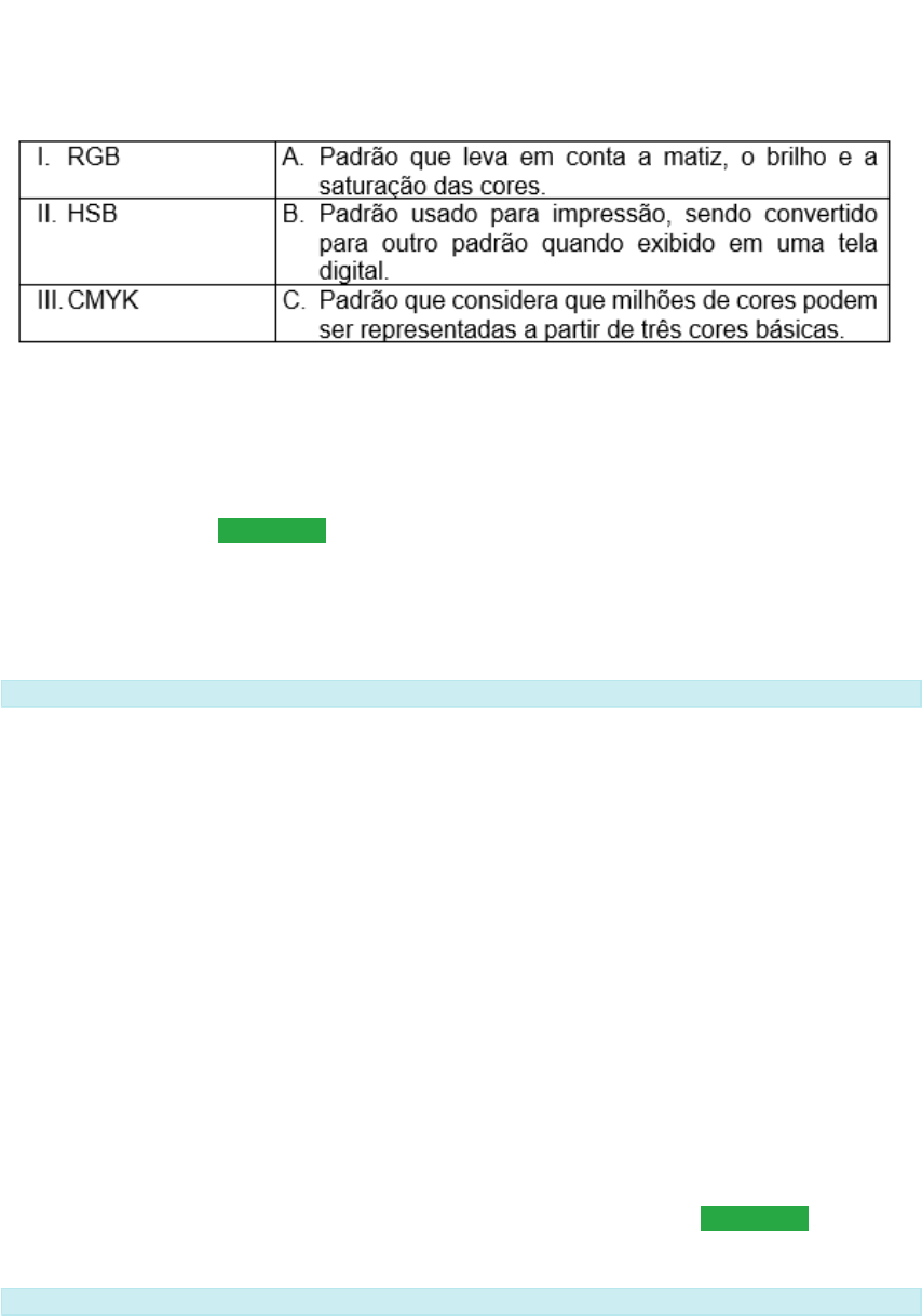 <p>Disciplina - Animações e ferramentas virtuais</p><p>1) Leia e associe as duas colunas a seguir.</p><p>Assinale a alternativa que traz a associação correta entre as duas colunas:</p><p>Alternativas:</p><p>· I-C; II-A; III-B. CORRETO</p><p>· I-A; II-C; III-B.</p><p>· I-C; II-B; III-A.</p><p>· I-B; II-A; III-C.</p><p>· I-B; II-C; III-A.</p><p>Resolução comentada:</p><p>O padrão RGB parte da ideia de que milhões de cores podem ser reproduzidas a partir de um valor de intensidade para três cores primárias: vermelho, verde e azul. Já o HSB parte de valores para matiz, saturação e brilho em uma cor. Por fim, o CMYK trabalha com quatro valores de cor, sendo voltado para impressão de arquivos. Como não é possível mostrar a cor do cartucho de tinta na tela de um computador, as cores são convertidas para as mais próximas no padrão RGB.</p><p>Código da questão: 61555</p><p>2) As técnicas de interpolação permitem com que vários efeitos sejam conseguidos a partir de pequenas mudanças nas configurações. A respeito disso, assinale a única alternativa correta.</p><p>Alternativas:</p><p>· A mudança de velocidade é feita apenas por meio de código.</p><p>· Na interpolação clássica, as movimentações são apenas retas.</p><p>· A interpolação de forma funciona apenas com formas regulares.</p><p>· A interpolação clássica pode alterar a escala do objeto utilizado. CORRETO</p><p>· A interpolação de movimento não pode ser usada para filtros visuais.</p><p>Resolução comentada:</p><p>É possível criar movimentações de todas as maneiras e não apenas retas na interpolação clássica. Existem várias opções na interface para mudar a velocidade das movimentações. A interpolação de forma funciona com qualquer traçado, não apenas formas regulares. A interpolação de movimento pode ser usada em filtros como desfoque.</p><p>Código da questão: 61559</p><p>3) Conceitos de _______ são fundamentais para se trabalhar com interação, embora haja ferramentas no Adobe Animate que facilitam o trabalho, como é o caso do painel _______, que possui opções já pré-montadas de _______, bastando modificar conforme o que queremos colocar no projeto.</p><p>Assinale a alternativa que completa adequadamente as lacunas:</p><p>Alternativas:</p><p>· Programação; Snippets; Código.CORRETO</p><p>· Programação; Snippets; Personagens.</p><p>· Desenho; Assets; Personagens.</p><p>· Desenho; Assets; Código.</p><p>· Desenho; Personagens; Código.</p><p>Resolução comentada:</p><p>O painel de snippets traz diversos blocos de código pré-estabelecidos, bastando modificá-los conforme o projeto. Para isso, é importante ter conhecimentos básicos em programação para entender o que está acontecendo no código.</p><p>Código da questão: 61567</p><p>4) Existem vários formatos que podem ser utilizados em projetos com imagens, inclusive alguns formatos que trabalham com recursos de animação. A respeito disso, assinale a única alternativa correta.</p><p>Alternativas:</p><p>· O formato GIF não aceita animação nem transparência.</p><p>· O formato JPG aceita tanto animações quanto transparência.</p><p>· PNG é o formato mais popular para animações na web.</p><p>· JPG é o formato mais popular para animações na web.</p><p>· Os formatos GIF e PNG aceitam transparência em níveis diferentes.CORRETO</p><p>Resolução comentada:</p><p>A alternativa correta é “Os formatos GIF e PNG aceitam transparência em níveis diferentes”. JPG e PNG não aceitam animação, e o formato JPG não aceita nem animação nem transparência.</p><p>Código da questão: 61545</p><p>5) O Adobe Animate é um software utilizado na criação de projetos digitais variados, como jogos, aplicativos, animações, entre outros. Possui diversos recursos para isso, possibilitando a criação de peças interativas ou não. A respeito desse contexto, assinale a única alternativa correta.</p><p>Alternativas:</p><p>· O melhor formato para se exportar arquivos é o SWF, por ser um formato lido por qualquer computador, sem o uso de plugins.</p><p>· Os recursos de interação necessitam de conhecimentos profundos em programação para serem usados, até os mais simples.</p><p>· Não possui relação com o extinto software Adobe Flash, o qual foi de grande importância para a evolução da web.</p><p>· Ao inserir um código, cada linha deve estar em um quadro-chave próprio, ou o código não funcionará corretamente.</p><p>· Os elementos na tela podem ser organizados em camadas, sendo que uma camada pode ter mais de um elemento diferente. CORRETO</p><p>Resolução comentada:</p><p>A alternativa correta é “Os elementos na tela podem ser organizados em camadas, sendo que uma camada pode ter mais de um elemento diferente”. O Animate é o nome dado ao Flash depois deste ter sido aprimorado pela Adobe, mantendo as funcionalidades e interface. O formato SWF necessita de um plugin, o Flash Player, o qual foi oficialmente desativado no início do ano 2021. Há vários recursos de interação quase prontos para uso, não sendo necessário elaborá-los por inteiro. Por fim, os códigos usados não dependem da quantidade de quadros-chave.</p><p>Código da questão: 61566</p><p>6) Ao criar interações por meio de um código, é necessário trabalhar com o conceito de instância. A respeito de tal conceito, assinale a única alternativa correta.</p><p>Alternativas:</p><p>· Todo elemento gráfico criado no Animate possui automaticamente um nome diferente de instância.</p><p>· Várias instâncias podem ter o mesmo nome, não trazendo problemas à execução do código.</p><p>· A instância é útil para interagir com um elemento específico do projeto por meio de código. CORRETO</p><p>· Apenas símbolos do tipo botão podem possuir instâncias, por conta do seu uso em telas.</p><p>· Ao inserirmos um código, devemos ter ao menos o nome de duas instâncias dentro do projeto.</p><p>R