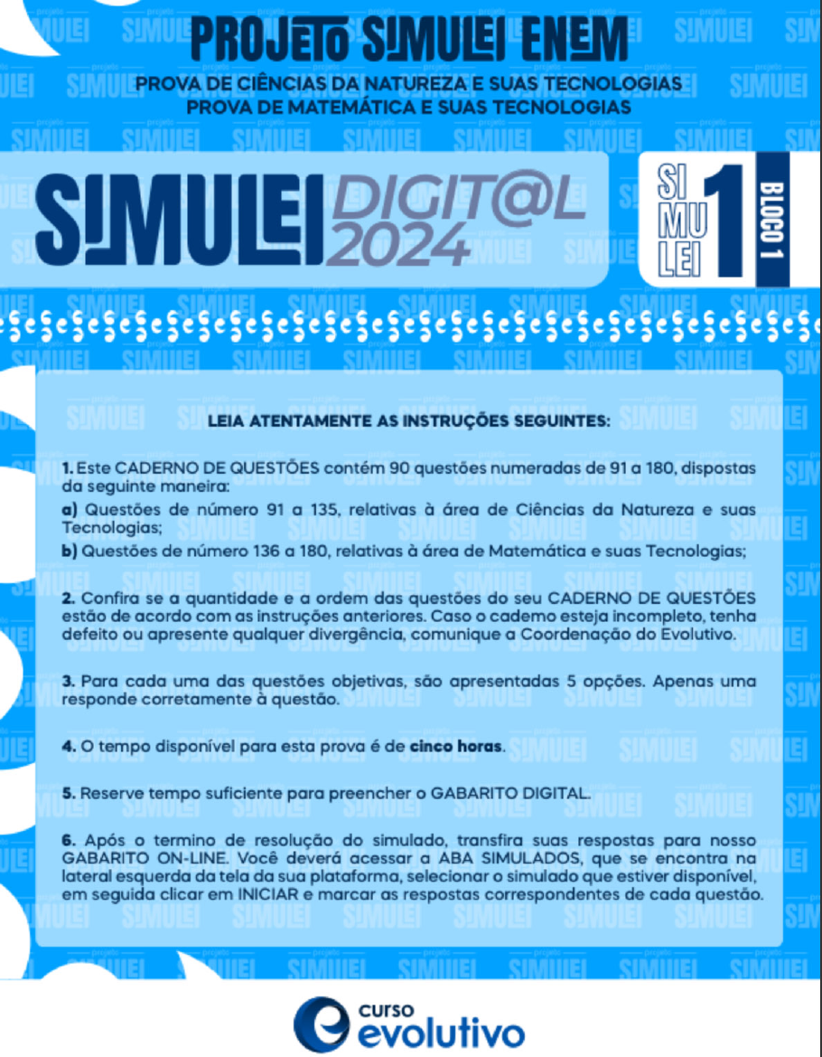 <p>SIMUL PROJETO SIMULE ENEM SIMULEI SUN PROVA DE CIÊNCIAS DA NATUREZA E SUAS TECNOLOGIAS SIMULEI PROVA DE MATEMÁTICA E SUAS TECNOLOGIAS SIMULE S LEIA ATENTAMENTE AS INSTRUÇÕES SEGUINTES: E 1. Este CADERNO DE QUESTÕES contém 90 questões numeradas de 91 a 180, dispostas da seguinte maneira: a) Questões de número 91 a relativas à área de Ciências da Natureza e suas b) Questões de número 136 a 180, relativas à área de Matemática e suas Tecnologias; 2. Confira se a quantidade e a ordem das questões do seu CADERNO DE QUESTÕES estão de acordo com as instruções anteriores. Caso cademo esteja incompleto, tenha defeito ou apresente qualquer divergência, comunique a Coordenação do Evolutivo. 3. Para cada uma das questões objetivas, são apresentadas 5 opções. Apenas uma responde corretamente à questão. 4. tempo disponível para esta prova é de cinco horas. 5. Reserve tempo suficiente para preencher GABARITO 6. Após termino de resolução do simulado, transfira suas respostas para nosso GABARITO Você deverá acessar a ABA SIMULADOS, que se encontra na lateral esquerda da tela da sua plataforma, selecionar simulado que estiver disponível, em seguida clicar em INICIAR e marcar as respostas correspondentes de cada questão. curso evolutivo</p><p>CIÊNCIAS DA NATUREZA Questão 93 E SUAS TECNOLOGIAS Em um estudo sobre processamento de células de cultura de tecido foram expostas a um precursor radioativo de Questão 91 RNA e subsequentemente transferidas para um meio sem essa A distribuição do precursor dentro das Em um aeroporto as malas são despachadas no balcão de células foi analisada em tempos distintos após a check-in, onde são etiquetadas com informações de destino e transferência: 3. 15 e 90 minutos. Os esquemas ilustram as rastreamento. As malas são transportadas dos balcões para a células em cada uma dessas etapas, mostrando a localização área de carga do avião, onde são carregadas nos do precursor radioativo. compartimentos de carga antes da decolagem. Neste processo de colocar as malas nos um Citoplasma operador lança uma mala sobre piso horizontal com velocidade inicial de 2,00 m/s. Devido ao atrito com o a mala atinge repouso após percorrerem 1,60 m. Nessas condições, considerando a gravidade local 10 coeficiente de atrito cinético entre a mala e piso vale: 3 15 90 incorporação aperas precursores indicação de rado- no ativos se espalham atividade a) 0,125 mente no pelo do núcleo e se apre- b) 0,500 cando a no senta no c) 0,200 d) 0,300 e) 0,840 Com base na figura e no procedimento descrito, indique qual alternativa representa corretamente processo que está Questão 92 sendo observado: A cromagem ou cromação é um processo de aplicação de a) Após 3 minutos, precursor no citoplasma indica que o cromo sobre um metal (ou outro material). através de um RNA é sintetizado tanto no núcleo quanto no citoplasma. processo a fim de torná-lo mais resistente à b) A concentração do precursor no núcleo e posteriormente para alterar suas propriedades elétricas ou no citoplasma sugere que a tradução se inicia no núcleo. aumentar a resistência ao desgaste (cromação dura) ou c) A presença do precursor no núcleo seguido pela sua apenas por motivos estéticos (cromagem decorativa). [...] aparição no citoplasma demonstra processo de transcrição Geralmente este processo se realiza depois do processo de no núcleo e a exportação subsequente do RNA maduro para niquelagem. Uma das aplicações da cromagem é citoplasma. recobrimento de ferramentas, ou peças, como a representada d) A ausência do precursor no núcleo após 90 minutos indica na Figura 2. com intuito de aumentar sua vida útil, devido ao uma falha no mecanismo de sugerindo que alto custo dos componentes de reposição. Sua elevada dureza processamento do RNA ocorre no citoplasma. superficial pode favorecer origem de que pode e) precursor é para citoplasma ao longo do comprometer revestimento pela degradação tempo em resposta a um desequilibrio osmótico entre a célula além de sua fragilização causada pelo que e o ambiente de cultura. influenciam na sua qualidade. Questão 94 Figura 2. Misturador para de mesa cromado. Na cidade do Recife, um de 80 metros de altura está em construção praticamente pronto, faltando apenas detalhes no acabamento. Numa construção, acidentes podem ocorrer com lançamento horizontal de materiais, como sobras ou blocos de concreto que, além de atingirem solo com alta ainda se afastam do edifício atingindo certo alcance. Em um cenário possível um objeto é lançado horizontalmente de forma acidental, do topo do edifício com velocidade de 2m/s. Qual a distância horizontal que objeto alcança tendo a vertical do edifício como a origem? Fonte: Autores Despreze a resistência do ar e considere g = 10 em a) 80m em 15 de Jul 2024 b) 4m Considere que em um processo de cromação foi utilizado em c) 8m solução de sulfato de cromo III para recobrimento de uma d) 20m peça metálica para ornamentação. Qual a massa de e) 1m formada em um processo que durou 2 horas com a utilização de uma corrente de 6A? Questão 95 Dados: M(Cr) = 52 constante de Faraday (F) = 96500 A intensificação de práticas com uso de C/mol fertilizantes químicos, incremento de atividades industriais e das emissões por motores de combustão interna, em muitas a) 3,9 regiões do mundo, tem modificado substancialmente o ciclo do b) nitrogênio, resultando em poluição do ar e da água por ácido c) nítrico e nitratos e a deposição de nos ecossistemas d) terrestres. A remoção de espécies químicas da e) 23,3 g pode ocorrer por deposição seca (sem a participação da fase ou deposição úmida. No caso de espécies de enxofre evolutivo</p><p>e tais processos estão relacionados com possíveis Questão 98 danos para ambiente como os resultantes da formação do ácido sulfúrico e do ácido nítrico principais Embora vários elementos sejam neces