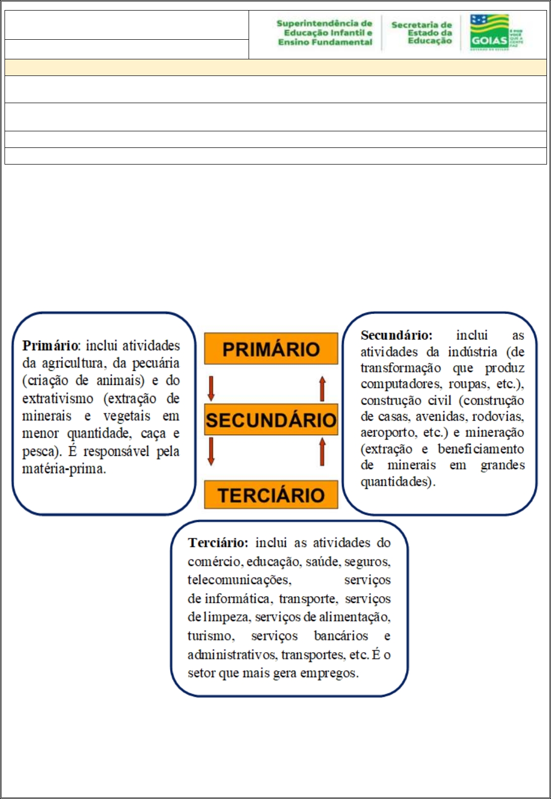 <p>5º ANO</p><p>GEOGRAFIA / HISTÓRIA</p><p>ATIVIDADE 8</p><p>Tema: - Setores de atividades econômicas - Cidadania, diversidade cultural e respeito às diferenças sociais, culturais e</p><p>históricas</p><p>Habilidades Essenciais: (EF05GE05-A) Conhecer os setores de atividades econômicas; (EF05HI04) Associar</p><p>a noção de cidadania com os princípios de respeito à diversidade, à pluralidade e aos direitos humanos.</p><p>NOME:</p><p>UNIDADE ESCOLAR:</p><p>OS SETORES DA ECONOMIA</p><p>Os setores econômicos podem mostrar o grau de desenvolvimento de um país ou região.</p><p>Todas as atividades desenvolvidas pelo ser humano para aquisição de um produto, bens, e</p><p>serviços destinados a atender às necessidades e desejos da sociedade são atividades econômicas.</p><p>A economia tem como base a produção, distribuição, e consumo de bens e serviços. As atividades</p><p>econômicas realizadas pelas pessoas costumam ser divididas em setores:</p><p>Disponível em: http://robertosociologo.blogspot.com/2015/09/setores-da-economia.html. Acesso em 14 de abr. de 2021</p><p>Disponível em: https://www.goiania.go.gov.br/sobre-goiania/. Acesso em 12 de abr. de 2021.</p><p>Disponível em: https://pt.slideshare.net/esbordonhos/setores-de-atividade-ppt> Acesso em 14 de abr. de 2021.</p><p>Disponível em: https://pt.scribd.com/document/423693686/Prova-de-Geografia-Agosto-19. Acesso em 14 de abr. de 201.</p><p>1. Após a leitura do texto, responda.</p><p>A) O que são atividades econômicas?</p><p>___________________________________________________________________________</p><p>___________________________________________________________________________</p><p>B) O que são os setores da economia?</p><p>___________________________________________________________________________</p><p>___________________________________________________________________________</p><p>C) Quais são os setores da economia?</p><p>___________________________________________________________________________</p><p>___________________________________________________________________________</p><p>D) Escreva 3 (três) atividades do Setor Primário da economia.</p><p>___________________________________________________________________________</p><p>___________________________________________________________________________</p><p>___________________________________________________________________________</p><p>E) Cite uma atividade do Setor Secundário da economia.</p><p>___________________________________________________________________________</p><p>___________________________________________________________________________</p><p>F) Quais atividades são desenvolvidas no Setor Terciário da economia?</p><p>____________________________________________________________________________</p><p>2. Observe as imagens, leia as informações e faça um (X) na alternativa correta.</p><p>1- Agricultor ou Pecuarista 2 - Indústria 3 - Prestação de serviço</p><p>1 -</p><p>2-</p><p>3-</p><p>Disponível em: https://br.pinterest.com/pin/466826317615482591/. Acesso em 15 de 2021.</p><p>(A) A imagem 2 representa o setor primário.</p><p>(B) A imagens 1 representa o setor secundário.</p><p>(C) A imagem 3 indica o setor terciário.</p><p>(D) A imagem 2 representa o setor terciário.</p><p>3. Escreva qual o setor da economia que representa a agropecuária e o extrativismo.</p><p>__________________________________________________________________________</p><p>__________________________________________________________________________</p><p>4. Encontre no caça-palavras nomes relacionados aos setores da economia</p><p>Disponível em: https://suportegeografico77.blogspot.com/2018/03/caca-palavras-setores-economicos.html. Acesso de 15 de abr. de 2021.</p><p>5. Marque (V) verdadeiro ou (F) falso para as seguintes afirmativas.</p><p>A) ( ) A agropecuária e o extrativismo pertencem ao setor terciário da economia.</p><p>B) ( ) A indústria e a construção civil pertencem a setor primário.</p><p>C) ( ) A agropecuária e o extrativismo pertencem ao setor informal.</p><p>D) ( ) É o conjunto de atividades econômicas responsável por extrair ou produzir as matérias-</p><p>primas sobre o meio natural é a do setor primário.</p><p>E) ( ) O setor terciário envolve atividades econômicas praticadas na sociedade referentes aos</p><p>serviços, comércio, educação, turismo e lazer.</p><p>Primário- Secundário-Terciário- Comércio- Indústria -Prestação de Serviço-</p><p>Pesca- Pecuária- Construção Civil- Pecuária- Extrativismo- Silvicultura</p><p>6. Leia o texto sobre cidadania e responda.</p><p>A) O que é cidadania?</p><p>___________________________________________________________________________</p><p>___________________________________________________________________________</p><p>B) O que é direito? Cite alguns exemplos.</p><p>___________________________________________________________________________</p><p>___________________________________________________________________________</p><p>___________________________________________________________________________</p><p>C) O que é dever? Cite alguns exemplos.</p><p>___________________________________________________________________________</p><p>___________________________________________________________________________</p><p>___________________________________________________________________________</p><p>7. Pesquise e responda o que é um cidadão?</p><p>___________________________________________________________________________</p><p>___________________________________________________________________________</p><p>___________________________________________________________________________</p><p>___________________________________________________________________________</p><p>8. Assim como os adultos, você acha que as crianças também têm seus direitos e deveres? Ex-</p><p>plique com suas palavras.</p><p>_______________________________________________________________________