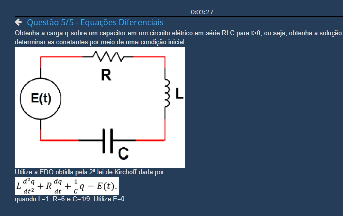 <p>0:03:27 Questão 5/5 - Equações Diferenciais Obtenha a carga q sobre um capacitor em um circuito elétrico em série RLC para ou seja, obtenha a soluçã determinar as constantes por meio de uma condição inicial. R E(t) L C Utilize a EDO obtida pela lei de Kirchoff dada por dt2 + R dq dt + - q = E(t). 1 L quando L=1, R=6 e C=1/9. Utilize E=0.</p>