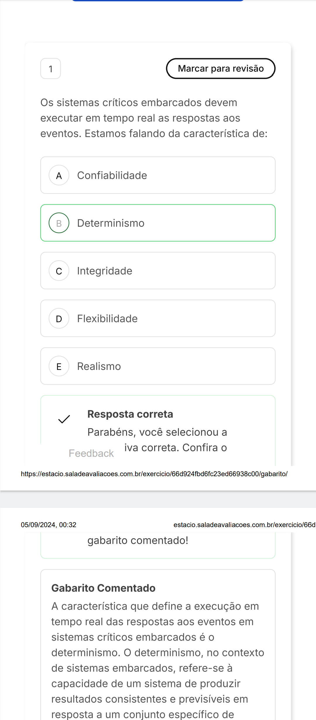 <p>1 Marcar para revisão Os sistemas críticos embarcados devem executar em tempo real as respostas aos eventos. Estamos falando da característica de: A Confiabilidade B Determinismo C Integridade D Flexibilidade E Realismo Resposta correta Parabéns, você selecionou a iva correta. Confira o Feedback 05/09/2024, 00:32 gabarito comentado! Gabarito Comentado A característica que define a execução em tempo real das respostas aos eventos em sistemas críticos embarcados é o determinismo. determinismo, no contexto de sistemas embarcados, refere-se à capacidade de um sistema de produzir resultados consistentes e previsíveis em resposta a um conjunto específico de</p>