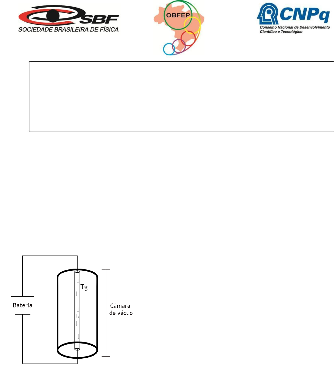 <p>OLIMPÍADA BRASILEIRA DE FÍSICA DAS ESCOLAS PÚBLICAS 2021</p><p>2</p><p>a</p><p>FASE –PROVA EXPERIMENTAL</p><p>NÍVEL C (alunos(as) da 3ª e 4ª séries – Ensino Médio e Técnico)</p><p>• Efeito Termiônico</p><p>O Efeito Termiônico pode ser descrito como a emissão de elétrons provenientes de uma determinada superfície</p><p>metálica aquecida a temperaturas elevadas (da ordem de 2.000K, 3.000K ) no interior de uma câmara de vácuo cilíndrica</p><p>com parede metálica. Em 1880, Thomas Edison observou o fenômeno quando tentava desvendar o motivo da ruptura</p><p>de filamentos da lâmpada incandescente. O efeito também foi investigado por Owen W. Richardson que, em 1928,</p><p>recebeu o Prêmio Nobel de física por descobertas na área. O Efeito Termiônico foi central para o desenvolvimento da</p><p>eletrônica, contribuindo para a criação de válvulas e, posteriormente, de diodos e transistores.</p><p>• Procedimento Experimental</p><p>Figura 1 – Arranjo Experimental</p><p>Uma corrente elétrica é aplicada a um filamento de tungstênio aquecido</p><p>entre 600K e 3000K no interior de uma câmara de vácuo cilíndrica. O</p><p>Efeito Termiônico acarretará a “soltura” dos elétrons provenientes do</p><p>filamento em função da temperatura.</p><p>Entre o filamento e a superfície interna da câmara cilíndrica é induzida</p><p>uma diferença de potencial, de tal forma que a superfície interna do</p><p>cilindro é positiva.</p><p>NOTE: existem duas correntes elétricas no experimento: a corrente no</p><p>filamento (exibida na figura acima), que é responsável por aquecer o</p><p>filamento; e a corrente entre o filamento e o cilindro (não exibida na</p><p>figura acima), que surge quando aplicamos uma diferença de potencial,</p><p>justamente em função dos elétrons emitidos pelo efeito termiônico.</p><p>1-A corrente elétrica, ao atravessar um condutor, aquece o material. Qual o nome desse efeito?</p><p>Na medida em que aumentamos a temperatura do filamento, é possível identificar variação na sua resistividade em função</p><p>do reordenamento interno da estrutura do tungstênio. Quanto maior a temperatura, mais resistivo se torna o filamento.</p><p>LEIA ATENTAMENTE AS INSTRUÇÕES A SEGUIR:</p><p>01 –Esta prova experimental destina-se exclusivamente aos(às) alunos(as) da 3ª e 4ª séries do Ensino Médio e</p><p>Técnico</p><p>02 –O Caderno de Resoluções possui instruções que devem ser lidas cuidadosamente antes do início da prova.</p><p>As resoluções devem ser transcritas no local indicado no Caderno de Resoluções. Respostas fora do local</p><p>indicado não serão consideradas.</p><p>03 – Leia com atenção todas as questões da prova antes de iniciá-la.</p><p>04 – Todos os resultados numéricos de medidas e cálculos devem ser expressos de acordo com as</p><p>instruções específicas</p><p>2- A temperatura do filamento é uma função da resistividade do filamento. Variando a corrente, variamos sua</p><p>resistividade e, consequentemente, a temperatura do filamento se altera. Abaixo está o gráfico com a relação entre as</p><p>altas temperaturas e a resistência.</p><p>• Considerando a figura acima trace, no gráfico reproduzido no Caderno de Resoluções, a reta média, ou seja, a reta</p><p>que melhor se ajusta a todos os pontos.</p><p>3- Tendo a reta média, encontre a função da temperatura, 𝑇 = 𝑓(𝑅) = 𝑎𝑅 + 𝑏.</p><p>Dica: 𝑎 é a taxa de variação da temperatura em relação à resistência.</p><p>Uma vez que o filamento chega a altas temperaturas, inicia-se a emissão de elétrons. O filamento adquire carga</p><p>positiva e, só então, o ligamos à DDP na superfície da câmara de vácuo para atrair os elétrons. Lembre-se: elétrons em</p><p>movimento são uma corrente elétrica.</p><p>4- Considere a Figura 2 reproduzida na página 4 do Caderno de Resoluções. Desenhe as linhas de campo elétrico do</p><p>filamento na superfície do cilindro, indicando tanto seu sentido quanto as polaridades do fio e da superfície da</p><p>câmara de vácuo. Dica: a corrente entre o filamento e o cilindro vai seguir essas linhas de campo.</p><p>Figura 2 – Seção transversal da câmara de vácuo. Ao centro, o filamento de tungstênio</p><p>5- Variando a diferença de potencial entre o filamento e a superfície interna do cilindro, a corrente presente entre o</p><p>filamento e a superfície do cilindro varia conforme o seguinte gráfico:</p><p>a. Perceba que há uma DDP mínima para que haja corrente elétrica entre o filamento e o cilindro. Por que</p><p>isso acontece? O que acontece em volta do filamento quando a DDP é inferior a esse mínimo?</p><p>(Dica: pense nos elétrons)</p><p>b. Depois dos 30 𝑉 de DDP a corrente não cresce como antes. Por que isso acontece?</p>