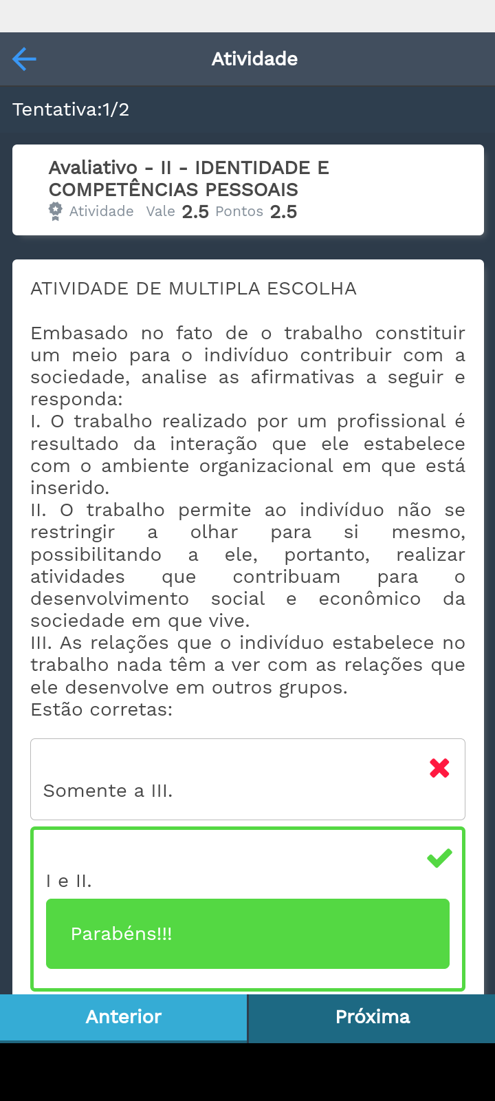 <p>Atividade Tentativa:1/2 Avaliativo - II - IDENTIDADE E COMPETÊNCIAS PESSOAIS Atividade Vale 2.5 Pontos 2.5 ATIVIDADE DE MULTIPLA ESCOLHA Embasado no fato de o trabalho constituir um meio para o indivíduo contribuir com a sociedade, analise as afirmativas a seguir e responda: I. trabalho realizado por um profissional é resultado da interação que ele estabelece com o ambiente organizacional em que está inserido. II. trabalho permite ao indivíduo não se restringir a olhar para si mesmo, possibilitando a ele, portanto, realizar atividades que contribuam para o desenvolvimento social e econômico da sociedade em que vive. III. As relações que o indivíduo estabelece no trabalho nada têm a ver com as relações que ele desenvolve em outros grupos. Estão corretas: x Somente a III. e II. Parabéns!!! Anterior Próxima</p>