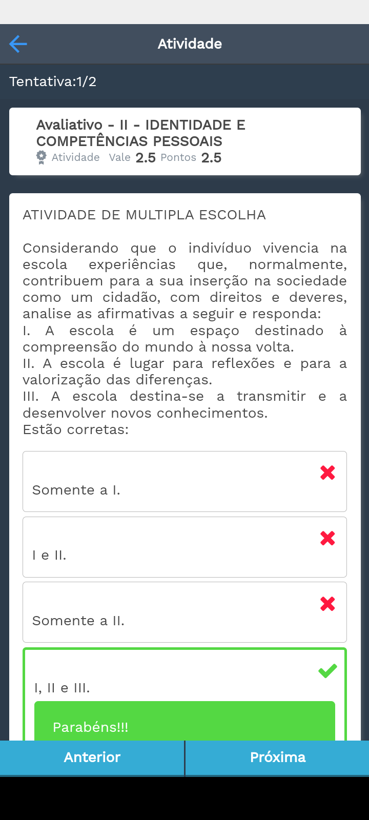 <p>Atividade Tentativa:1/2 Avaliativo - II - IDENTIDADE E COMPETÊNCIAS PESSOAIS Atividade Vale 2.5 Pontos 2.5 ATIVIDADE DE MULTIPLA ESCOLHA Considerando que indivíduo vivencia na escola experiências que, normalmente, contribuem para a sua inserção na sociedade como um cidadão, com direitos e deveres, analise as afirmativas a seguir e responda: A escola é um espaço destinado à compreensão do mundo à nossa volta. II. A escola é lugar para reflexões e para a valorização das diferenças. III. A escola destina-se a transmitir e a desenvolver novos Estão corretas: x Somente a I. x e II. x Somente a II. I, II e III. Parabens!!! Anterior Próxima</p>