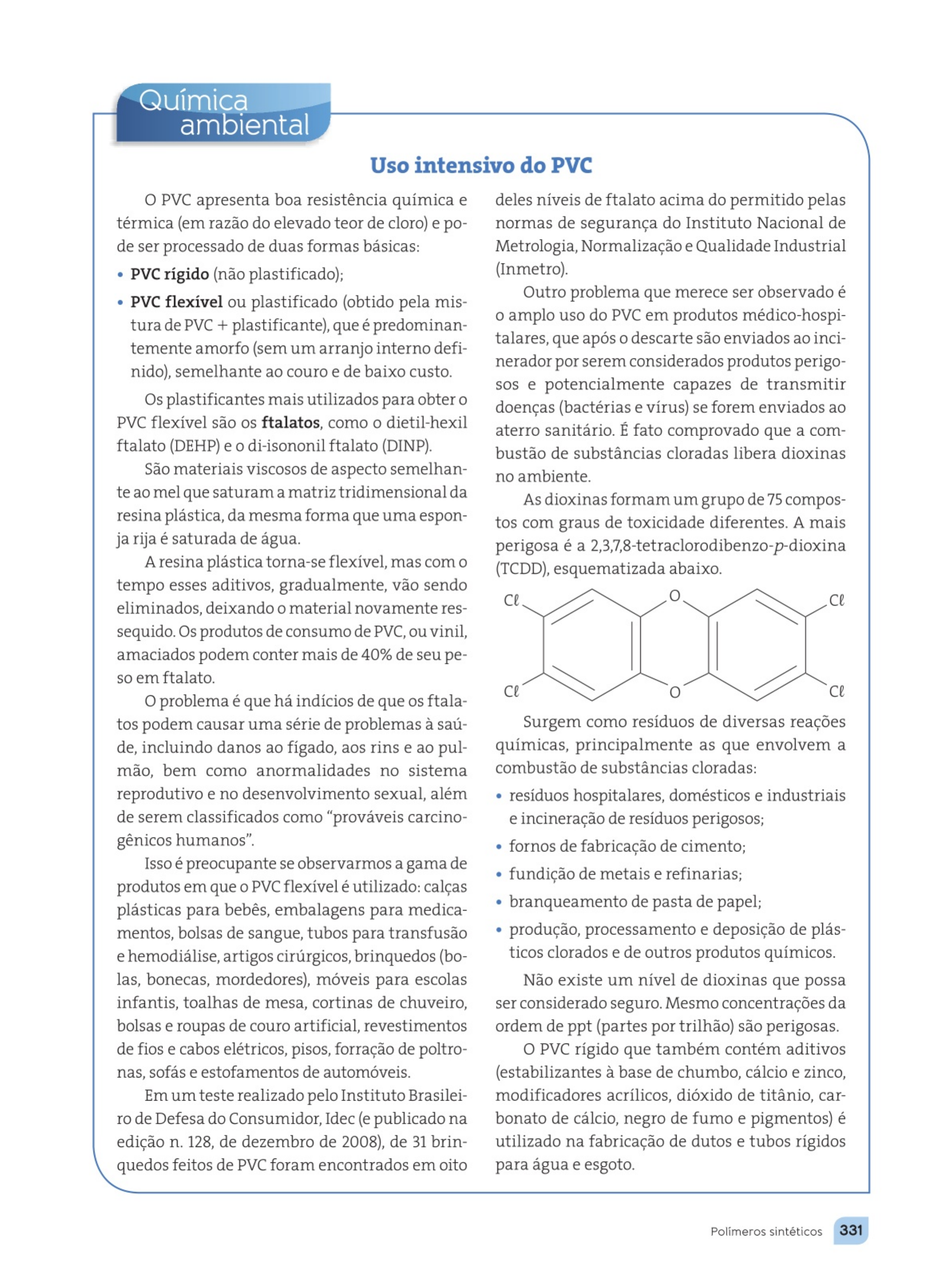 <p>~Quírili1ica</p><p>ambiental</p><p>·,.,;,,</p><p>Uso intensivo do PVC</p><p>O PVC apresent a boa resistência química e</p><p>térmica (em razão do elevado teor de cloro) e po</p><p>de ser processado de duas formas básicas:</p><p>• PVC rígido (não plastificado);</p><p>• PVC flexível ou plastificado {obtido pela m is</p><p>tura de PVC + plastif icante), que é predominan</p><p>temente amorfo (sem um arranjo interno defi</p><p>nido), semelhante ao couro e de baixo custo.</p><p>Os plastificantes mais utilizados para obter o</p><p>PVC flexível são os ftalatos, como o dietil-hexil</p><p>ftalato (DEHP) e o di-isononil ftalato (DINP).</p><p>São materiais viscosos de aspecto semelhan</p><p>te ao mel que saturam a matriz tridimensional da</p><p>resina plástica, da mesma forma que uma espon</p><p>ja rija é saturada de água.</p><p>A resina plástica torna-se flexível, mas com o</p><p>tempo esses aditivos, gradualmente, vão sendo</p><p>eliminados, deixando o material novamente res</p><p>sequido. Os produtos de consumo de PVC, ou vinil,</p><p>amaciados podem conter mais de 40% de seu pe</p><p>so em ftalato.</p><p>O problema é que há ind ícios de que os ftala</p><p>tos podem causar uma série de problemas à saú</p><p>de, incluindo danos ao fígado, aos rins e ao pul</p><p>mão, bem como anormalidades no sistema</p><p>reprodutivo e no desenvolvimento sexual, além</p><p>de serem classificados como "prováveis carcino</p><p>gênicos humanos".</p><p>Isso é preocupante se observarmos a gama de</p><p>produtos em que o PVC flexível é utilizado: calças</p><p>plásticas para bebês, embalagens para medica</p><p>mentos, bolsas de sangue, tubos para transfusão</p><p>e hemodiálise, artigos cirúrgicos, brinquedos (bo</p><p>las, bonecas, mordedores), móveis para escolas</p><p>infantis, toalhas de mesa, cortinas de chuveiro,</p><p>bolsas e roupas de couro artificial, revestimentos</p><p>de fios e cabos elétricos, pisos, forração de poltro</p><p>nas, sofás e estofamentos de automóveis.</p><p>Em um teste realizado pelo Instituto Brasilei</p><p>ro de Defesa do Consumidor, Idec (e publicado na</p><p>edição n. 128, de dezembro de 2008), de 31 brin</p><p>quedos feitos de PVC foram encontrados em oito</p><p>deles níveis de ftalato acima do permitido pelas</p><p>normas de segurança do Instituto Nacional de</p><p>Metrologia, Normalização e Qualidade Industrial</p><p>(Inmetro).</p><p>Outro problema que merece ser observado é</p><p>o amplo uso do PVC em produtos médico-hospi</p><p>talares, que após o descarte são enviados ao inci</p><p>nerador por serem considerados produtos perigo</p><p>sos e potencialmente capazes de t ransmitir</p><p>doenças (bactérias e vírus) se forem enviados ao</p><p>aterro sanitário. É fato comprovado que a com</p><p>bustão de substâncias cloradas libera dioxinas</p><p>no ambiente.</p><p>As dioxinas formam um grupo de 75 compos</p><p>tos com graus de toxicidade diferentes. A mais</p><p>perigosa é a 2,3,7,8-tetraclorodibenzo-p-dioxina</p><p>(TCDD), esquematizada abaixo.</p><p>ce o ce</p><p>ce o ce</p><p>Surgem corno resíduos de diversas reações</p><p>químicas, principalmente as que envolvem a</p><p>combustão de substâncias cloradas:</p><p>• resíduos hospitalares, domésticos e industriais</p><p>e incineração de resíduos perigosos;</p><p>• fornos de fabricação de cimento;</p><p>• fundição de metais e refinarias;</p><p>• branqueamento de pasta de papel;</p><p>• produção, processamento e deposição de plás</p><p>ticos clorados e de outros produtos químicos.</p><p>Não existe um nível de dioxinas que possa</p><p>ser considerado seguro. Mesmo concentrações da</p><p>ordem de ppt (partes por trilhão) são perigosas.</p><p>O PVC rígido que também contém aditivos</p><p>(estabilizantes à base de chumbo, cálcio e zinco,</p><p>modificadores acrílicos, dióxido de titânio, car</p><p>bonato de cálcio, negro de fumo e pigmentos) é</p><p>utilizado na fabricação de dutos e tubos rígidos</p><p>para água e esgoto.</p><p>Polímeros sintéticos 331</p><p>Química</p><p>e sociedade</p><p>Sacolinhas plásticas</p><p>As sacolas plásticas podem ser:</p><p>• Comuns, de polietileno de baixa densidade</p><p>Feitas de matéria-prima derivada do petróleo.</p><p>Segundo o especialista professor da Universida</p><p>de Estadual de Campinas Marco Aurélio De Pao</p><p>li, esse tipo de sacolinha, quando exposta ao meio</p><p>ambiente (luz, calor e umidade), sofre degradação</p><p>em cerca de dez anos.</p><p>Sabemos, porém, que essas condições não se ve</p><p>rificam nos lixões, aterros sanitários e oceanos</p><p>(os destinos mais comuns).</p><p>• Feitas de "polietileno verde"</p><p>Feitas de matéria-prima derivada da cana-de</p><p>-açúcar. O polietileno assim obtido é idêntico ao</p><p>que é obtido a partir do petróleo.</p><p>• Biodegradável</p><p>É um tipo de plástico que serve de nut riente para</p><p>m icrorganismos (bactérias ou fungos) existentes</p><p>no meio ambiente. Pode ser feito de m ilho, man</p><p>d ioca ou bagaço de cana-de-açúcar.</p><p>Para que a biodegradação ocorra (ent re 90 e 180</p><p>dias) é necessário que haja condições para a proli</p><p>feração desses microrganismos, corno: temperatu</p><p>ra, pH, umidade e presença de oxigênio. Novamen</p><p>te, isso não ocorre em lixões e aterros sanitários.</p><p>• Com carga biodegradável</p><p>São sacolinhas de polietileno que contêm em sua</p><p>formulação uma "carga" de componente biode</p><p>gradável como, por exemplo, o amido.</p><p>Somente o componente biodegradável sofre a</p><p>ação dos microrganismos. De qualquer forma, a</p><p>quantidade do componente não degradável nes</p><p>sas sacolas é menor.</p><p>• Compostável</p><p>São sacolas feitas de um tipo de plástico que se</p><p>degrada quando enterrado em determinadas</p><p>condições de temperatura e umidade.</p><p>Por exemplo: termoplásticos de amido