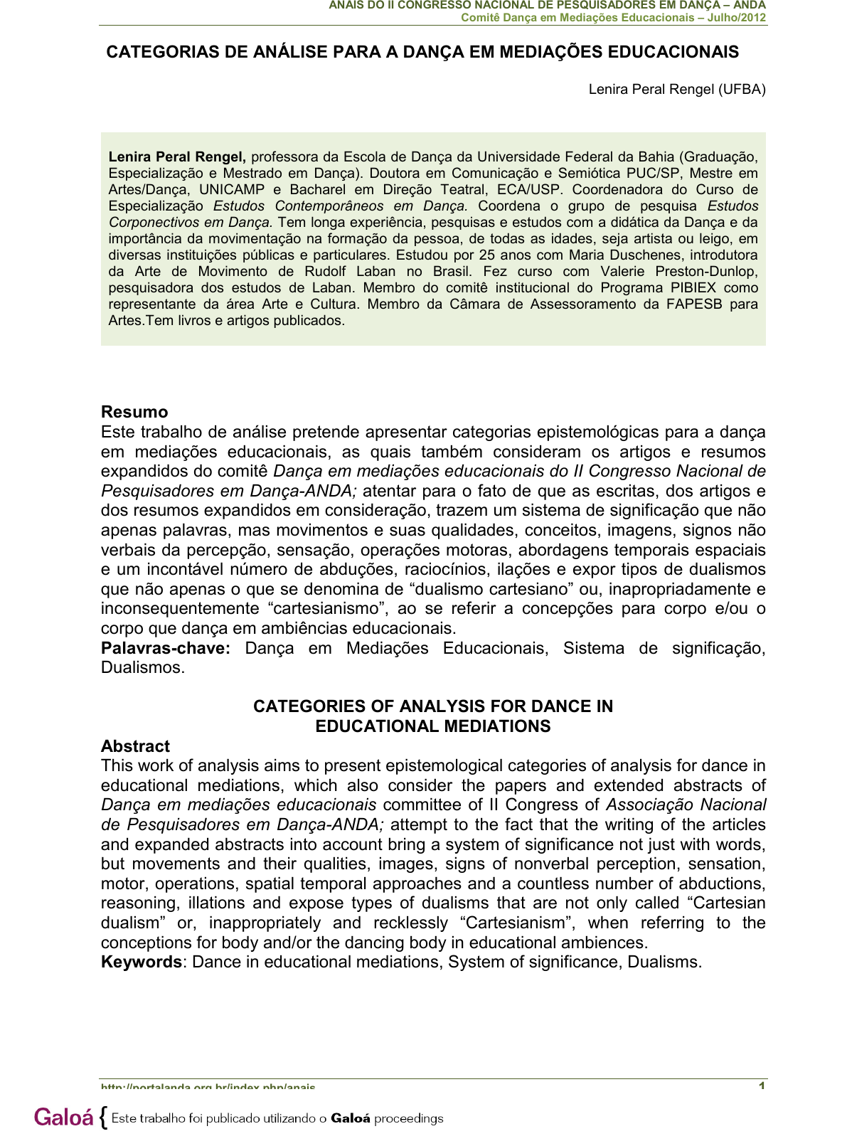 <p>ANAIS DO II CONGRESSO NACIONAL DE PESQUISADORES EM DANÇA – ANDA</p><p>Comitê Dança em Mediações Educacionais – Julho/2012</p><p>http://portalanda.org.br/index.php/anais 1</p><p>CATEGORIAS DE ANÁLISE PARA A DANÇA EM MEDIAÇÕES EDUCACIONAIS</p><p>Lenira Peral Rengel (UFBA)</p><p>Lenira Peral Rengel, professora da Escola de Dança da Universidade Federal da Bahia (Graduação,</p><p>Especialização e Mestrado em Dança). Doutora em Comunicação e Semiótica PUC/SP, Mestre em</p><p>Artes/Dança, UNICAMP e Bacharel em Direção Teatral, ECA/USP. Coordenadora do Curso de</p><p>Especialização Estudos Contemporâneos em Dança. Coordena o grupo de pesquisa Estudos</p><p>Corponectivos em Dança. Tem longa experiência, pesquisas e estudos com a didática da Dança e da</p><p>importância da movimentação na formação da pessoa, de todas as idades, seja artista ou leigo, em</p><p>diversas instituições públicas e particulares. Estudou por 25 anos com Maria Duschenes, introdutora</p><p>da Arte de Movimento de Rudolf Laban no Brasil. Fez curso com Valerie Preston-Dunlop,</p><p>pesquisadora dos estudos de Laban. Membro do comitê institucional do Programa PIBIEX como</p><p>representante da área Arte e Cultura. Membro da Câmara de Assessoramento da FAPESB para</p><p>Artes.Tem livros e artigos publicados.</p><p>Resumo</p><p>Este trabalho de análise pretende apresentar categorias epistemológicas para a dança</p><p>em mediações educacionais, as quais também consideram os artigos e resumos</p><p>expandidos do comitê Dança em mediações educacionais do II Congresso Nacional de</p><p>Pesquisadores em Dança-ANDA; atentar para o fato de que as escritas, dos artigos e</p><p>dos resumos expandidos em consideração, trazem um sistema de significação que não</p><p>apenas palavras, mas movimentos e suas qualidades, conceitos, imagens, signos não</p><p>verbais da percepção, sensação, operações motoras, abordagens temporais espaciais</p><p>e um incontável número de abduções, raciocínios, ilações e expor tipos de dualismos</p><p>que não apenas o que se denomina de “dualismo cartesiano” ou, inapropriadamente e</p><p>inconsequentemente “cartesianismo”, ao se referir a concepções para corpo e/ou o</p><p>corpo que dança em ambiências educacionais.</p><p>Palavras-chave: Dança em Mediações Educacionais, Sistema de significação,</p><p>Dualismos.</p><p>CATEGORIES OF ANALYSIS FOR DANCE IN</p><p>EDUCATIONAL MEDIATIONS</p><p>Abstract</p><p>This work of analysis aims to present epistemological categories of analysis for dance in</p><p>educational mediations, which also consider the papers and extended abstracts of</p><p>Dança em mediações educacionais committee of II Congress of Associação Nacional</p><p>de Pesquisadores em Dança-ANDA; attempt to the fact that the writing of the articles</p><p>and expanded abstracts into account bring a system of significance not just with words,</p><p>but movements and their qualities, images, signs of nonverbal perception, sensation,</p><p>motor, operations, spatial temporal approaches and a countless number of abductions,</p><p>reasoning, illations and expose types of dualisms that are not only called “Cartesian</p><p>dualism” or, inappropriately and recklessly “Cartesianism”, when referring to the</p><p>conceptions for body and/or the dancing body in educational ambiences.</p><p>Keywords: Dance in educational mediations, System of significance, Dualisms.</p><p>ANAIS DO II CONGRESSO NACIONAL DE PESQUISADORES EM DANÇA – ANDA</p><p>Comitê Dança em Mediações Educacionais – Julho/2012</p><p>http://portalanda.org.br/index.php/anais 2</p><p>Apresentação</p><p>Produção de conhecimento em Dança, em modos de escrita e, sobretudo,</p><p>disponível. Com convicção há que se saudar os vinte e cinco artigos e sete resumos</p><p>expandidos do comitê Dança em mediações educacionais do II Congresso Nacional de</p><p>Pesquisadores em Dança-ANDA, em suas proficuidades de temas. Há assunções</p><p>generalizantes, reflexões, análises, procedimentos, prospecções de naturezas</p><p>variadas: o que é dança contemporânea; o que é uma educação sensível; formação do</p><p>professor; formação do artista; dança na escola; dança e inserção social de diferentes</p><p>segmentos; Laban, balé; perfil do estudante para ser professor.</p><p>Professoras e professores, pesquisadores artistas dedicados ao ofício, aos</p><p>estudos e pesquisas apresentam procedimentos metodológicos para aulas, relatos de</p><p>projetos, reflexões, análises, pesquisas em ações pedagógicas em Dança. Tratam de</p><p>modo geral, mesmo que não empreguem esse termo, de mediação. Da relação aluno,</p><p>professor, sociedade/mundo, conhecimento. Muitos de nós fomos formados</p><p>inicialmente em serviço, ou seja no próprio fazer do trabalho da ação pedagógico-</p><p>artística ou artística. Os artigos e resumos expandidos demonstram que o ambiente</p><p>acadêmico proporciona a formação específica, sem contudo, ou não deveria, nos</p><p>apartar da sociedade a qual pertencemos, a qual pertence a Universidade, a academia.</p><p>Algumas interpretações teóricas, em forma de eixos categoriais, são</p><p>apresentadas. A intenção é a de que, a partir deles, se possam efetuar argumentações</p><p>referentes a aspectos dos artigos e resumos expandidos do comitê Dança em</p><p>mediações educacionais do II Congresso Nacional de Pesquisadores em Dança-ANDA,</p><p>ao mesmo tempo em que busco expor uma tessitura epistemológica para trabalhar,</p><p>pesquisar, fazer, lecionar Dança.</p><p>Esses eixos categorias são estruturas panorâmicas e amplas para tentar abarcar,</p><p>a também ampla gama de assuntos e aspectos da dança que estão disponíveis para</p><p>leitura. Portanto, há sem dúvida uma tentativa de apresentar e explanar os eixos</p><p>categoriais, mas não um desenvolvimento maior de cada 