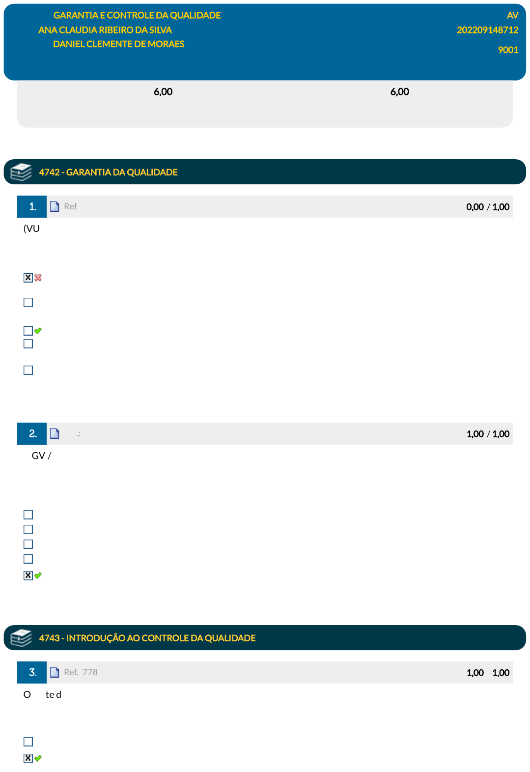 <p>Disciplina: GARANTIA E CONTROLE DA QUALIDADE AV</p><p>Aluno: ANA CLAUDIA RIBEIRO DA SILVA 202209148712</p><p>Professor: DANIEL CLEMENTE DE MORAES</p><p>Turma: 9001</p><p>SDE4534_AV_202209148712 (AG) 20/11/2023 10:59:17 (F)</p><p>Avaliação: 6,00 pts Nota SIA: 6,00 pts</p><p>Dispositivo liberado pela Matrícula 202209148712 com o token 159934 em 20/11/2023 10:58:53.</p><p>4742 - GARANTIA DA QUALIDADE</p><p>1. Ref.: 7704163 Pontos: 0,00 / 1,00</p><p>(VUNESP / 2020- Adaptada) Para obter analises seguras que não possam impactar os resultados da organização do</p><p>laboratório, são ultilizadas as ferramentas de gestão. Fluxograma, Diagrama de Ishikawa e Diagrama de Pareto são</p><p>ferramentas para a gestão da qualidade. Cada uma delas corresponde, respectivamente, a</p><p>Representação em �guras geométricas de processos, melhoria contínua de processos e meio de detecção de</p><p>falhas e variáveis.</p><p>Identi�cação de falhas e variáveis, relacionamento de eventos com variáveis e busca de satisfação de</p><p>clientes.</p><p>Identi�cação de etapas do trabalho, relações de causa e efeito e determinação de principais problemas.</p><p>Tabelas ou planilhas de coleta de informações, instrumento de melhoria de processos e relacionamento</p><p>estatístico de eventos.</p><p>Análise de comportamento de variáveis, relacionamento de falhas e eventos e levantamento grá�co de</p><p>processos.</p><p>2. Ref.: 7704255 Pontos: 1,00 / 1,00</p><p>(FGV /2021- Adaptada) Um gestor da IMBEL utiliza a ferramenta conhecida por Diagrama de Pareto na gestão de</p><p>qualidade de seu setor, obtendo grande sucesso com essa abordagem. Em vista disso, o Diretor-Presidente solicita</p><p>maiores informações do gestor sobre essa abordagem, considerando a possibilidade de expandir seu uso para outras</p><p>áreas de empresa. Assinale a opção que indica um aspecto positivo do Diagrama de Pareto.</p><p>A conscientização dos colaboradores para melhorar a organização e a disciplina no ambiente de trabalho.</p><p>O estudo das melhores práticas utilizadas no mercado para o aprimoramento da organização.</p><p>A compreensão da relação entre duas variáveis.</p><p>A separação dos dados de diferentes fontes em conjuntos mais adequados para análise.</p><p>A identi�cação das causas prioritárias dos problemas.</p><p>4743 - INTRODUÇÃO AO CONTROLE DA QUALIDADE</p><p>3. Ref.: 7787878 Pontos: 1,00 / 1,00</p><p>O teste de determinação de peso médio para formas sólidas e semissólidas consiste basicamente em pesar os</p><p>comprimidos ou a embalagem do produto �nal para conhecermos o peso do conteúdo, sempre em balança de</p><p>sensibilidade adequada. Podemos classi�car esse teste como:</p><p>Químico.</p><p>Físico.</p><p>javascript:alert('C%C3%B3digo da quest%C3%A3o: 7704163.');</p><p>javascript:alert('C%C3%B3digo da quest%C3%A3o: 7704163.');</p><p>javascript:alert('C%C3%B3digo da quest%C3%A3o: 7704255.');</p><p>javascript:alert('C%C3%B3digo da quest%C3%A3o: 7787878.');</p><p>javascript:alert('C%C3%B3digo da quest%C3%A3o: 7787878.');</p><p>Microbiológico.</p><p>Toxicológico.</p><p>Farmacológico.</p><p>4. Ref.: 7787877 Pontos: 1,00 / 1,00</p><p>A determinação do tamanho do lote é um parâmetro de extrema importância para o sucesso da análise e após esta</p><p>etapa é necessário realizar a amostragem. Quando nem todos os indivíduos possuem a mesma chance de serem</p><p>escolhidos e ainda por cima ocorre uma exclusão por um julgamento pré-determinado por parte do analista, esta</p><p>técnica de amostragem é chamada de:</p><p>Amostragem Probabilística Sistemática.</p><p>Amostragem Probabilística Aleatória.</p><p>Amostragem Probabilística por Estrati�cação.</p><p>Amostragem Não-Probabilística Intencional.</p><p>Amostragem Não-probabilística Não-Intencional.</p><p>4744 - CONTROLE DA QUALIDADE DE PRODUTOS SÓLIDOS, SEMISSÓLIDOS E LÍQUIDOS</p><p>5. Ref.: 7790034 Pontos: 0,00 / 1,00</p><p>Os estudos de estabilidade de longa duração, de acompanhamento e o acelerado para medicamentos devem ser</p><p>realizados nas condições estabelecidas na RDC 318/2019. Sobre esse assunto analise a situação hipotética a seguir:</p><p>"João, farmacêutico que trabalha em um laboratório de controle de qualidade, precisa estabelecer o prazo de</p><p>validade de�nitivo de um medicamento de base aquosa que �cará armazenado na temperatura ambiente (15°-30°C).</p><p>Para isso, realizou os testes nas seguintes condições 30°C ±2° C/75%UR ± 5%UR."</p><p>Os ensaios realizados para de�nir o prazo de validade de�nitivos, estão:</p><p>Errados, pois as condições para avaliar os estudos de estabilidade acelerado são: 30°C ± 2°C/ 35%UR ±5</p><p>%UR.</p><p>Certos, pois as condições empregadas são as preconizadas para estudos de estabilidade de longa duração.</p><p>Certos, pois as condições empregadas são as preconizadas para estudos de estabilidade de</p><p>acompanhamento.</p><p>Errados, pois as condições para avaliar os estudos de estabilidade de longa duração são: 30°C ± 2°C/ 35%UR</p><p>±5 %UR.</p><p>Errado, pois devido a condição de armazenamento (15°C-30°C), estudos de estabilidade acelerados não são</p><p>necessários.</p><p>6. Ref.: 7790036 Pontos: 1,00 / 1,00</p><p>(Adaptado de ENADE 2007)</p><p>A Farmácia Joãozinho produz 6.000 cápsulas de minoxidil de 5mg. Seu teor é determinado por espectrofotometria</p><p>no ultravioletata, utilizando a curva de calibração abaixo, cujo coe�ciente de correlação determinado foi r=0,99265.</p><p>javascript:alert('C%C3%B3digo da quest%C3%A3o: 7787877.');</p><p>javascript:alert('C%C3%B3digo da quest%C3%A3o: 7787877.');</p><p>javascript:alert('C%C3%B3digo da quest%C3%A3o: 7790034.');</p><p>javascript:alert('C%C3%B3digo da quest%C3%A3o: 7790034.');</p><p>javascript:alert('C%C3%B3digo da quest%C3%A3o: 7790036.');</p><p>javascript:alert('C%C3%B3digo da quest%C3%A3o: 779003