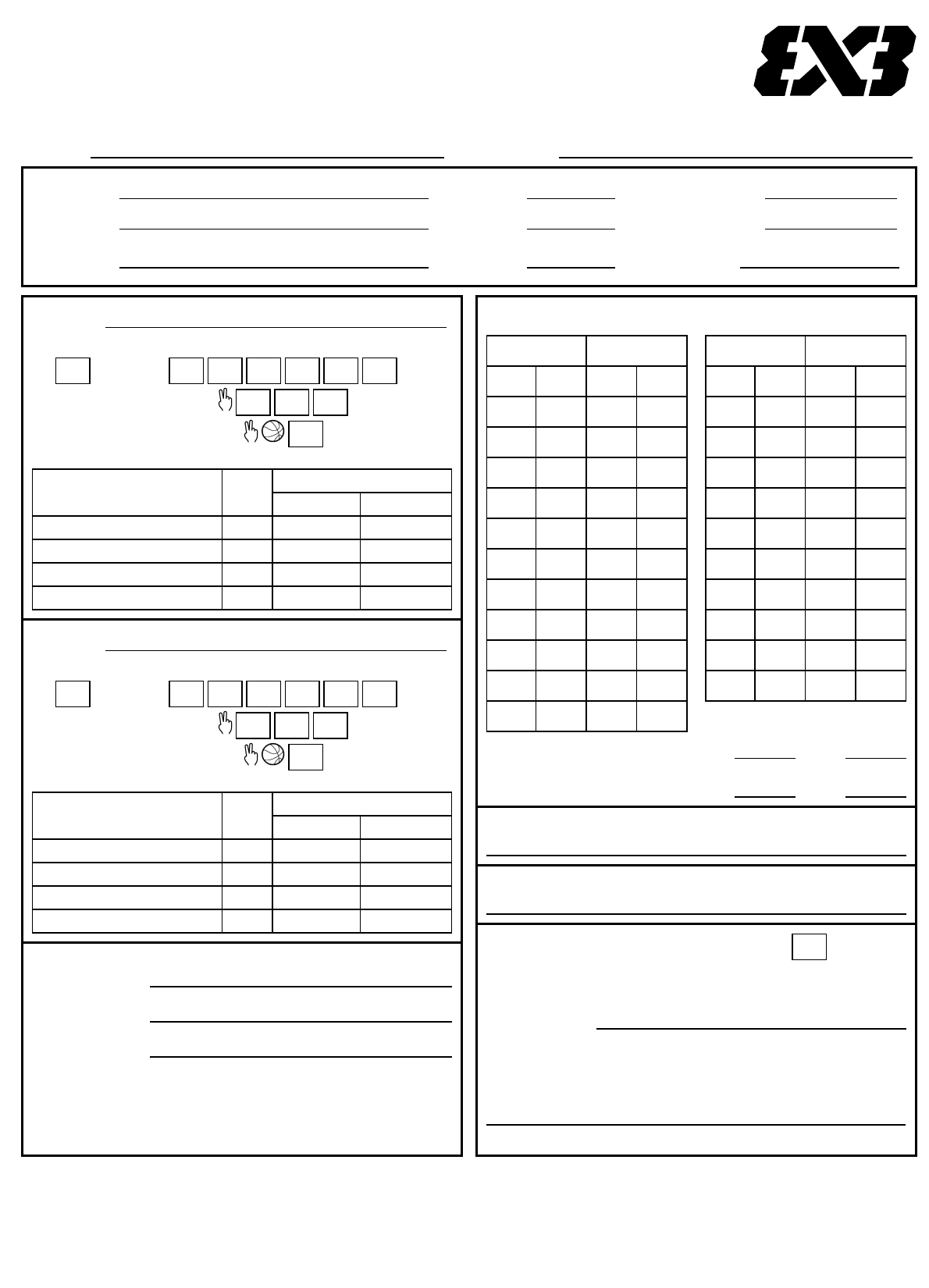 <p>Team A</p><p>Time out</p><p>Team fouls</p><p>1 2 3 4 5 6</p><p>7 8 9</p><p>10+</p><p>Players No.</p><p>Unsportsmanlike</p><p>1 2</p><p>Team B</p><p>Time out</p><p>Team fouls</p><p>1 2 3 4 5 6</p><p>7 8 9</p><p>10+</p><p>Players No.</p><p>Unsportsmanlike</p><p>1 2</p><p>Scorer</p><p>Timer</p><p>Shot Clock</p><p>Operator</p><p>Team A Team B</p><p>Competition Date Referees #1</p><p>#2 Category Time</p><p>Game No. Court Supervisor</p><p>FEDERATION INTERNATIONALE DE BASKETBALL</p><p>INTERNATIONAL BASKETBALL FEDERATION</p><p>FIBA 3X3 SCORESHEET</p><p>A B</p><p>1 1</p><p>2 2</p><p>3 3</p><p>4 4</p><p>5 5</p><p>6 6</p><p>7 7</p><p>8 8</p><p>9 9</p><p>10 10</p><p>11 11</p><p>12 12</p><p>A B</p><p>13 13</p><p>14 14</p><p>15 15</p><p>16 16</p><p>17 17</p><p>18 18</p><p>19 19</p><p>20 20</p><p>21 21</p><p>22 22</p><p>23 23</p><p>Running score</p><p>Score (after regular time) A B</p><p>Score (after overtime) A B</p><p>Referee's Signature</p><p>Sports Supervisor's Signature</p><p>Game protest requested: Yes</p><p>Team's Name:</p><p>(Player's signature)</p>