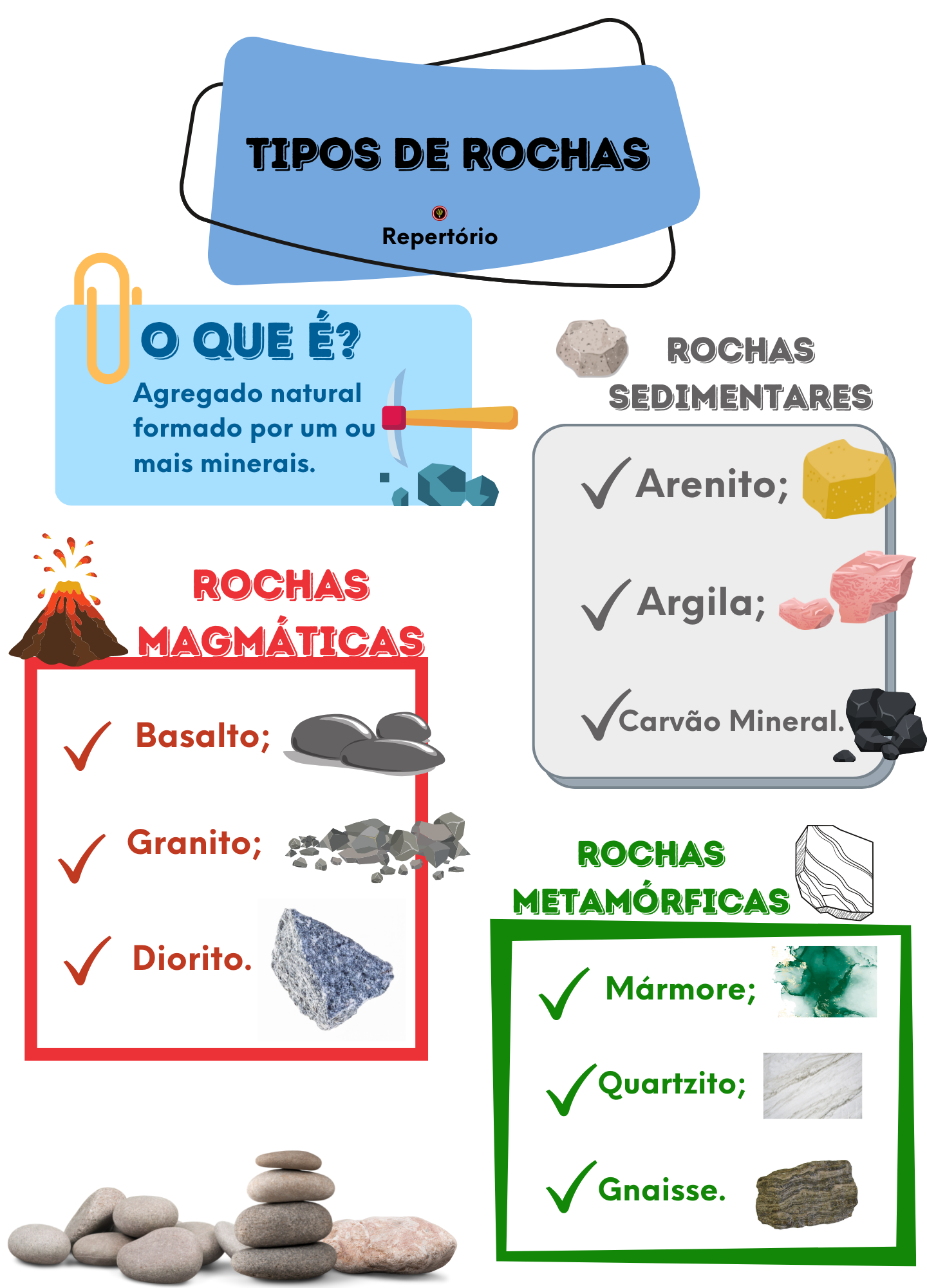 <p>TIPOS DE ROCHAS Repertório QUE E? ROCHAS Agregado natural SEDIMENTARES formado por um mais minerais. Arenito; ROCHAS Argila; MAGMÁTICAS Basalto; Carvão Mineral. Granito; ROCHAS Diorito. Mármore; Quartzito; Gnaisse.</p>