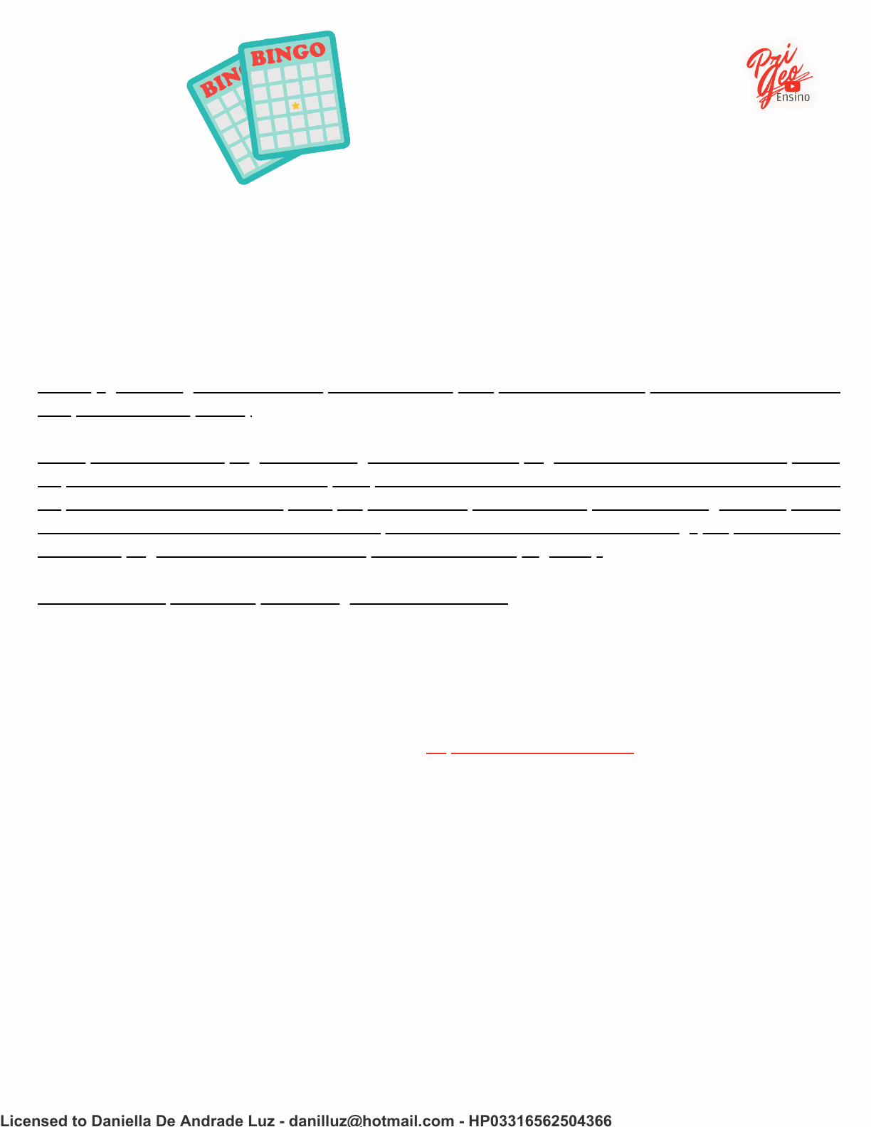 <p>Como jogar: Entregue uma cartela para cada aluno, no presencial é só imprimir e no on-line é só</p><p>compartilhar o link. (abaixo)</p><p>Você pode sortear as perguntas de sugestão ou criar as perguntas levando em consideração as</p><p>respostas das cartelas. Não fale a resposta, deixe os alunos testarem seus conhecimentos marcando as</p><p>respostas na cartela. Ganha aquele que primeiro completar a cartela, fazendo o bingo! Você poderá</p><p>conferir o resultado levando em consideração a cartela de base. Ao fim do bingo, faça o feedback</p><p>relendo as perguntas e identificando as respostas em voz alta (sugestão).</p><p>Vídeo de orientação: como aplicar o bingo educativo em aula.</p><p>educativo</p><p>Tema do Bingo: Aspectos do clima e problemas ambientais</p><p>Material de apoio ao professor</p><p>Link para o bingo virtual: https://mfbc.us/m/rabr8be</p><p>(caso vá realizar esse bingo em uma aula on-line, é só copiar o link acima e enviar para os alunos)</p><p>Sugestões de questões para o bingo:</p><p>1- É composta de cinco camadas: troposfera, estratosfera, mesosfera, termosfera e exosfera. (atmosfera)</p><p>2- É o conjunto das condições atmosféricas de um lugar em determinado momento. (tempo)</p><p>3- Corresponde ao estado térmico do ar em determinado momento. (temperatura)</p><p>4- É a medida das condições atmosféricas de um lugar, a sucessão habitual dos diversos estados de tempo, por anos</p><p>contínuos. (clima)</p><p>5- É a diferença entre as temperaturas máxima e mínima no período observado. (amplitude térmica)</p><p>6- É quantidade do vapor d´água existente na atmosfera em determinado momento e lugar. (umidade do ar)</p><p>ATENÇÃO: Esse material é de uso individual, para que você, professor (a), use-o em suas de aulas para</p><p>torná-las mais atrativas, entretanto, esse material não deve ser compartilhado com outros professores e</p><p>nem comercializado sem autorização da autora, sob as penas da lei.</p><p>A indicação do trabalho é livre e eu agradeço. Espero que esse material feito com muito carinho ajude a</p><p>transformar suas aulas em um sucesso. Beijo da Prigeo.</p><p>Licensed to Daniella De Andrade Luz - danilluz@hotmail.com - HP03316562504366</p><p>https://mfbc.us/m/rabr8be</p><p>https://mfbc.us/m/rabr8be</p><p>https://mfbc.us/m/rabr8be</p><p>https://mfbc.us/m/rabr8be</p><p>7- É o retorno do vapor de água das nuvens para a superfície da Terra, podendo ser em forma líquida</p><p>(chuva), sólida (granizo) ou cristais de gelo (neve). (precipitações)</p><p>8- É o peso do ar sobre todos os corpos e a superfície terrestre. Pode variar de acordo com a</p><p>temperatura e altitude. (pressão atmosférica)</p><p>9-São grandes porções de ar atmosférico com características de temperatura e umidade</p><p>aproximadamente uniformes às do lugar onde se originam. (massas de ar)</p><p>10- É um fenômeno natural que garante a vida na Terra por meio de um processo em que gases como</p><p>dióxido de carbono (CO2) e metano retêm o calor na atmosfera. (efeito estufa)</p><p>11- É o aumento da temperatura média do planeta verificado nas últimas décadas, resultado</p><p>principalmente, das emissões de gases liberados pela queima de combustáveis fosses. (aquecimento</p><p>global)</p><p>12- Corresponde ao aumento da temperatura nas áreas centrais de cidades, onde a excesso de</p><p>concreto em relação a áreas mais afastadas, que tem mais vegetação. (ilha de calor)</p><p>13- Suas consequências são percebidas mais facilmente no inverno, quando o ar frio, mais denso e</p><p>pesado, ocupa lugar do ar quente próximo a superfície. (inversão térmica)</p><p>14- É a ciência que, ao estudar os processos e dinâmicas relacionadas à atmosfera terrestre, possibilita</p><p>a previsão do tempo. (meteorologia)</p><p>Atenção: você pode incluir mais perguntas ou mudar as perguntas acima, elas são apenas uma</p><p>sugestão, BOA AULA!</p><p>Licensed to Daniella De Andrade Luz - danilluz@hotmail.com - HP03316562504366</p><p>Aspectos do clima e problemas</p><p>ambientais</p><p>atmosferapressão</p><p>atmosférica</p><p>temperaturaclima meteorologia</p><p>aquecimento</p><p>global</p><p>massas</p><p>de ar</p><p>amplitude</p><p>térmica</p><p>efeito</p><p>estufa</p><p>Aspectos do clima e problemas</p><p>ambientais</p><p>atmosfera</p><p>pressão</p><p>atmosférica</p><p>aquecimento</p><p>global</p><p>massas</p><p>de ar</p><p>tempo</p><p>efeito</p><p>estufa</p><p>umidade</p><p>do ar</p><p>ilha de</p><p>calor</p><p>inversão</p><p>térmica</p><p>temperatura</p><p>pressão</p><p>atmosférica</p><p>meteorologia</p><p>aquecimento</p><p>global</p><p>umidade</p><p>do ar</p><p>inversão</p><p>térmica</p><p>precipitações</p><p>ilha de</p><p>calor</p><p>amplitude</p><p>térmica</p><p>tempo</p><p>efeito</p><p>estufa</p><p>massas</p><p>de ar</p><p>climaatmosfera</p><p>Licensed to Daniella De Andrade Luz - danilluz@hotmail.com - HP03316562504366</p><p>Aspectos do clima e problemas</p><p>ambientais</p><p>ilha de</p><p>calor</p><p>ilha de</p><p>calor</p><p>meteorologia</p><p>aquecimento</p><p>global</p><p>meteorologia</p><p>aquecimento</p><p>global</p><p>efeito</p><p>estufa</p><p>tempo</p><p>inversão</p><p>térmica</p><p>inversão</p><p>térmica</p><p>atmosfera</p><p>atmosfera</p><p>amplitude</p><p>térmica</p><p>pressão</p><p>atmosférica</p><p>pressão</p><p>atmosférica</p><p>precipitações</p><p>clima</p><p>umidade</p><p>do ar</p><p>Aspectos do clima e problemas</p><p>ambientais</p><p>ilha de</p><p>calor</p><p>meteorologia</p><p>aquecimento</p><p>global</p><p>inversão</p><p>térmica</p><p>atmosfera</p><p>pressão</p><p>atmosférica</p><p>precipitações</p><p>clima</p><p>umidade</p><p>do aratmosfera</p><p>Aspectos do clima e problemas</p><p>ambientais</p><p>ilha de</p><p>calor</p><p>aquecimento</p><p>global</p><p>inversão</p><p>térmicaatmosfera</p><p>amplitude</p><p>térmica</p><p>temperaturaprecipitações</p><p>massa