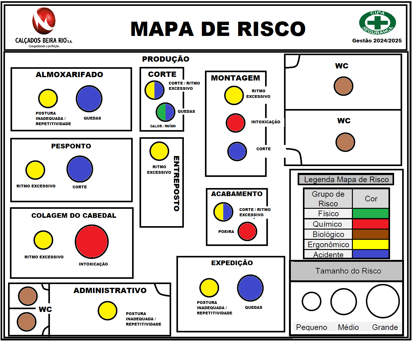 <p>CIPA MAPA DE RISCO SEGURANCE CALCADOS BEIRA Gestão 2024/2025 Conquistando perfeição PRODUÇÃO WC ALMOXARIFADO CORTE MONTAGEM CORTE / RITMO EXCESSIVO RITMO EXCESSIVO POSTURA QUEDAS INADEQUADA / QUEDAS REPETITIVIDADE INTOXICAÇÃO WC CALOR RUÍDO PESPONTO CORTE RITMO EXCESSIVO CORTE Legenda Mapa de Risco RITMO EXCESSIVO ACABAMENTO Grupo de Cor Risco COLAGEM DO CABEDAL EXCESSIVO Físico Químico POEIRA Biológico Ergonômico RITMO EXCESSIVO Acidente INTOXICAÇÃO EXPEDIÇÃO Tamanho do Risco ADMINISTRATIVO POSTURA WC INADEQUADA / QUEDAS POSTURA REPETITIVIDADE INADEQUADA / REPETITIVIDADE Pequeno Médio Grande</p>