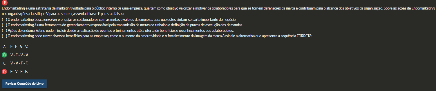 <p>5 Endomarketing é uma estratégia de marketing voltada para público interno de uma empresa, que e contribuam para alcance dos objetivos da organização. Sobre as ações de Endomarketing organizações, classifique V para as sentenças verdadeiras e F paras as falsas ) endomarketing busca envolver e engajar colaboradores com as metas e valores da empresa, para que estes sintam-se parte importante do negócio. endomarketing é uma ferramenta de gerenciamento responsável pela transmissão de metas de trabalho e definição de prazos de execução das demandas ) Ações de endomarketing podem incluir desde a realização de eventos e treinamentos até a oferta de benefícios e reconhecimentos aos colaboradores. ) endomarketing pode trazer diversos benefícios para as empresas, como aumento da produtividade e fortalecimento da imagem da a alternativa que apresenta a CORRETA: A F-F-V-V : V-F-V-V F-V-F-F</p>