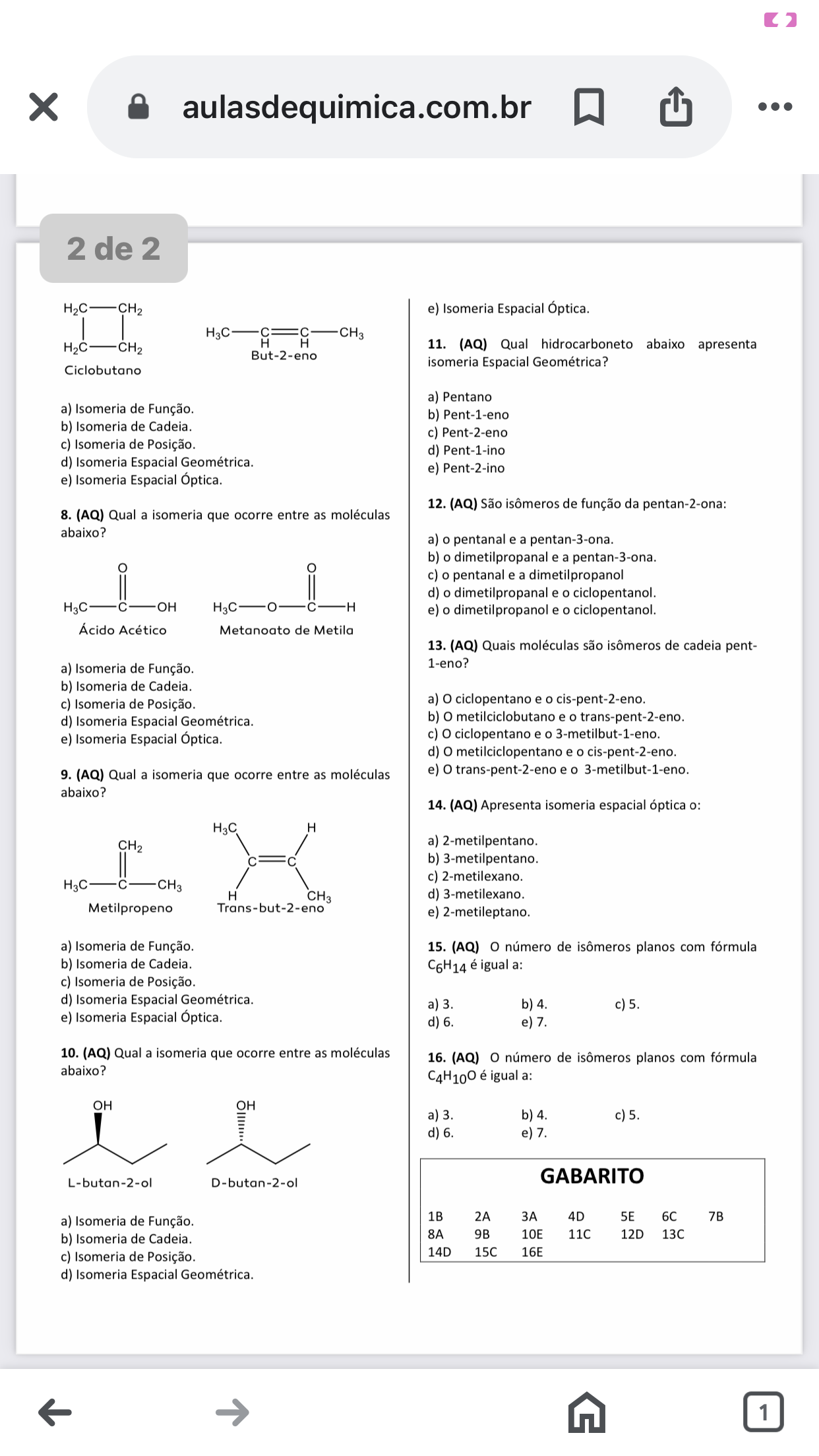 <p>X aulasdequimica.com.b 2 de 2 H2C CH2 e) Isomeria Espacial Óptica. H3C H C H CH3 H2C-CH2 11. (AQ) Qual hidrocarboneto abaixo apresenta But-2-eno isomeria Espacial Geométrica? Ciclobutano a) Pentano a) Isomeria de Função. b) Pent-1-eno b) Isomeria de Cadeia. c) Pent-2-eno c) Isomeria de Posição. d) Pent-1-ino d) Isomeria Espacial e) Pent-2-ino e) Isomeria Espacial 12. (AQ) São isômeros de função da pentan-2-ona: 8. (AQ) Qual a isomeria que ocorre entre as moléculas abaixo? a) o pentanal e a pentan-3-ona. b) o dimetilpropanal e a pentan-3-ona. c) o pentanal e a dimetilpropanol d) o dimetilpropanal e o ciclopentanol. H3C OH H3C H e) o dimetilpropanol e o ciclopentanol. Ácido Acético de Metila 13. (AQ) Quais moléculas são isômeros de cadeia pent- a) Isomeria de Função. 1-eno? b) Isomeria de Cadeia. c) Isomeria de Posição. a) o ciclopentano e o cis-pent-2-eno. d) Isomeria Espacial Geométrica. b) o metilciclobutano e o trans-pent-2-eno. e) Isomeria Espacial Óptica. c) o ciclopentano e o 3-metilbut-1-eno d) o metilciclopentano e o cis-pent-2-eno. 9. (AQ) Qual a isomeria que ocorre entre as moléculas e) o trans-pent-2-eno e o 3-metilbut-1-eno. abaixo? 14. (AQ) Apresenta isomeria espacial óptica H3O H CH2 a) 2-metilpentano. C b) 3-metilpentano. c) 2-metilexano. H3C CH3 H CH3 d) 3-metilexano. Metilpropeno Trans-but-2-eno e) a) Isomeria de Função. 15. (AQ) o número de isômeros planos com fórmula b) Isomeria de Cadeia. C6H14 é igual a: c) Isomeria de Posição. d) Isomeria Espacial b) 4. c) 5. e) Isomeria Espacial Óptica. e) 7. 10. (AQ) Qual a isomeria que ocorre entre as moléculas 16. (AQ) o número de isômeros planos com fórmula abaixo? é igual a: OH OH a) 3. b) 4. c) 5. d) 6. e) 7. L-butan-2-ol D-butan-2-ol GABARITO a) Isomeria de Função. 1B 2A 3A 4D 5E 6C 7B b) Isomeria de 8A 9B 10E 12D c) Isomeria de Posição. 14D 15C 16E d) Isomeria Espacial 1</p>