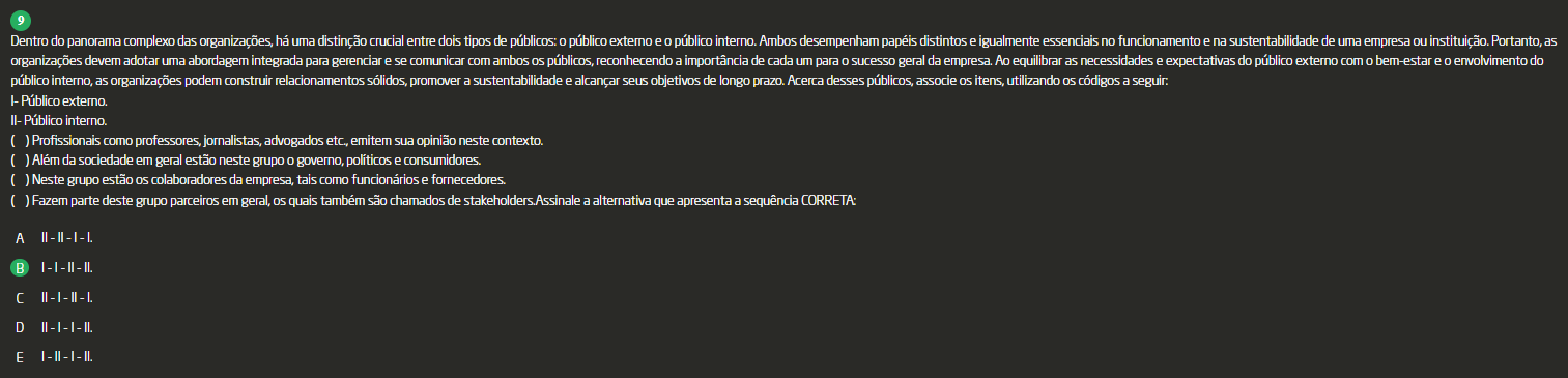 <p>g Dentro do panorama complexo das organizações, há uma distinção crucial entre dois tipos de públicos: público externo e público interno. Ambos desempenham papéis distintos e igualmente essenciais no funcionamento e na sustentabilidade de uma empresa ou instituição. Portanto, as organizações devem adotar uma abordagem integrada para gerenciar e se comunicar com ambos os públicos, reconhecendo a importância de cada um para sucesso geral da empresa Ao equilibrar as necessidades e expectativas do público externo com bem-estar e envolvimento do público interno, as organizações podem construir relacionamentos sólidos, promover a sustentabilidade e alcançar seus objetivos de longo prazo. Acerca desses públicos, associe os itens, utilizando os códigos a Público Público ( Profissionais como professores, jornalistas, advogados etc., emitem sua opinião neste contexto. ( ) Além da sociedade em geral estão neste grupo governo, políticos e ( ) Neste grupo estão os colaboradores da empresa, tais como funcionários e fornecedores ( ) Fazem parte deste grupo parceiros em geral, quais também são chamados de a alternativa que apresenta a A B D E</p>
