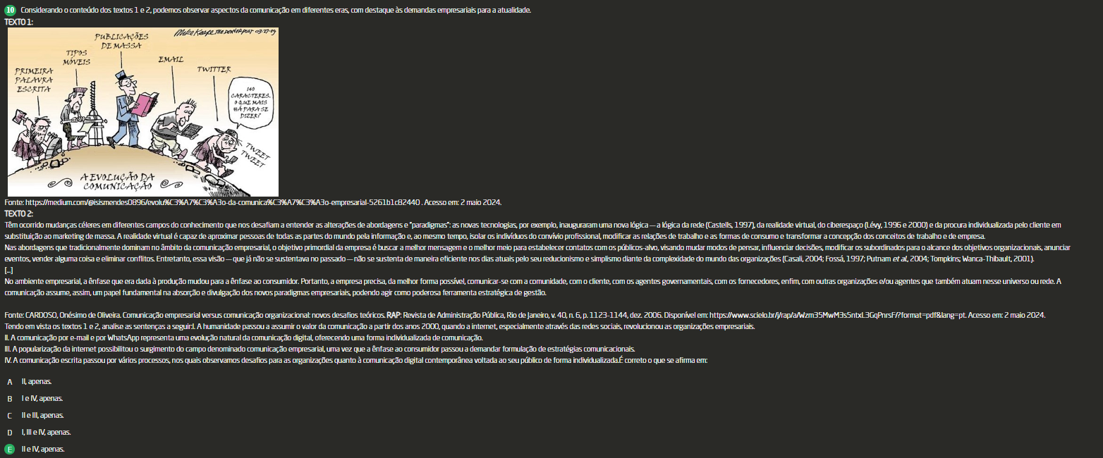 <p>10 Considerando conteúdo dos textos 1 e 2, podemos obser aspectos da comunicação em diferentes eras, com destaque às demandas empresariais para a atualidade. TEXTO 1: DE MASSA TIPOS MOVEIS EMAIL PRIMEIRA TWITTER PALAVRA ESCRITA 140 DA 2 maio 2024. TEXTO 2: Têm ocorrido mudanças céleres em diferentes campos do conhecimento que nos desafiam a entender as alterações de abordagens e "paradigmas": as novas por exemplo, inauguraram uma nova lógica a lógica da rede (Castells, da realidade virtual, do 1996 e 2000) ed substituição ao marketing de massa A realidade virtual é capaz de aproximar pessoas de todas as partes do mundo pela informação e ao mesmo tempo, isolar do convívio profissional, modificar as relações de trabalho as formas de consumo transformar a concepção dos conceitos de trabalh Nas abordagens que tradicionalmente dominam âmbito da comunicação empresarial, objetivo primordial da empresa é buscar a melhor mensagem e melhor meio para estabelecer contatos com visando mudar modos de pensar, influenciar decisões modificar subordinados para alca eventos, vender alguma coisa e eliminar Entretanto, essa visão que já não se sustentava no passado não se sustenta de maneira eficiente nos dias atuais pelo seu reducionismo e simplismo diante da complexidade do mundo das organizações (Casali, 2004; Putnam et al. To No ambiente a que era dada à produção mudou para a ênfase ao a empresa precisa, da melhor forma comunicar- SP com a com diente, com agentes governamentals, com enfim, com outras organizações e/ou agentes que t comunicação assim, um papel fundamental na absorção e divulgação dos novos paradigmas podendo agir como poderosa ferramenta estratégica de gestão. Fonte: Onésimo de Oliveira Comunicação empresarial versus comunicação novos desafios RAP: Revista de Administração Pública, Rio de Janeiro, 40. n. dez 2006 Disponível em Tendo em vista textos analise as sentenças a A humanidade passou a assumir valor da comunicação a partir dos anos 2000. quando a internet, especialmente através das redes revolucionou as organizações empresariais. IL A comunicação por e-mail P por WhatsApp representa uma evolução natural da comunicação oferecendo uma forma individualizada de comunicação. III A popularização da internet possibilitou surgimento do campo denominado comunicação empresarial, uma vez que a ênfase ao consumidor passou a demandar formulação de estratégias A comunicação escrita passou por vários processos, nos quais observamos desafios para as organizações quanto à comunicação digital voltada ao seu público de forma correto que se afirma A II, apenas le IV, apenas apenas D III e apenas.</p>