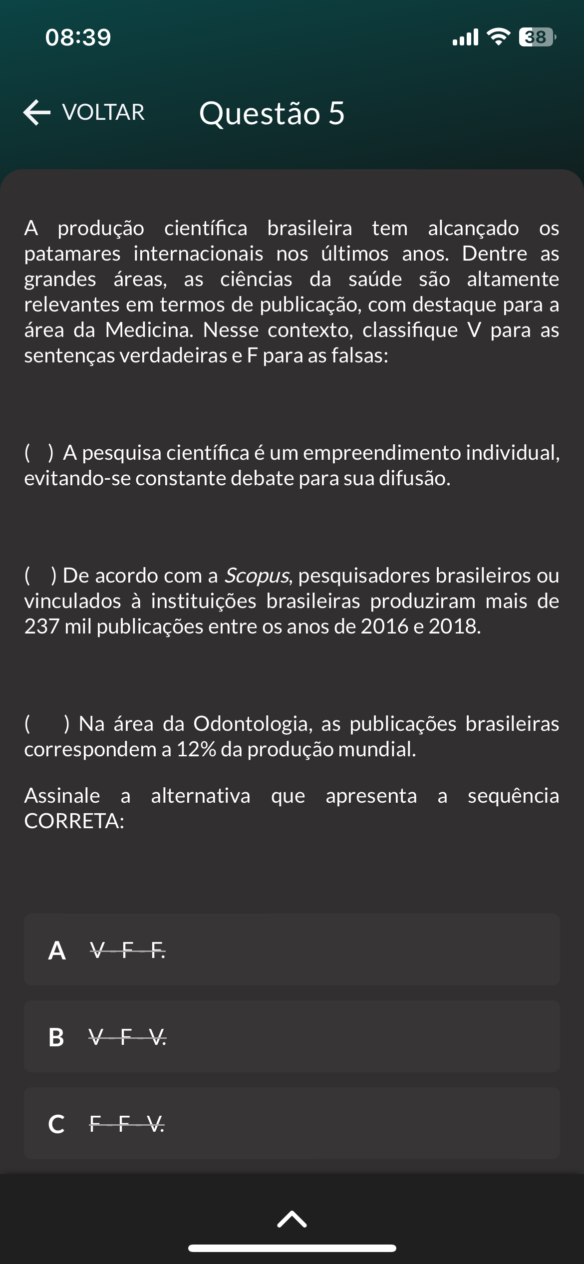 <p>08:39 38 VOLTAR Questão 5 A produção científica brasileira tem alcançado os patamares internacionais nos últimos anos. Dentre as grandes áreas, as ciências da saúde são altamente relevantes em termos de publicação, com destaque para a área da Medicina. Nesse contexto, classifique V para as sentenças verdadeiras e F para as falsas: ( ) A pesquisa científica é um empreendimento individual, evitando-se constante debate para sua difusão. ( ) De acordo com a Scopus, pesquisadores brasileiros ou vinculados à instituições brasileiras produziram mais de 237 mil publicações entre os anos de 2016 e 2018. ( ) Na área da Odontologia, as publicações brasileiras correspondem a 12% da produção mundial. Assinale a alternativa que apresenta a sequência CORRETA: A V F V. C F F V</p>