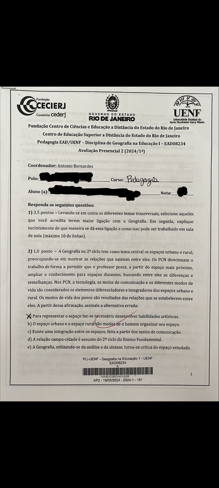 <p>Fundação CECIERJ cederj GOVERNO DO ESTADO UENF RIO DE JANEIRO Universidade Estadual do Norte Fluminense Darcy Fundação Centro de Ciências e Educação a Distância do Estado do Rio de Janeiro Centro de Educação Superior a Distância do Estado do Rio de Janeiro Pedagogia EAD/UENF - Disciplina de Geografia na Educação I - EAD08234 Avaliação Presencial 2 Coordenador: Antonio Bernardes Polo: Curso: Pedagogia Aluno (a) Nota: Responda as seguintes questões: 1) 3,5 pontos - Levando-se em conta os diferentes temas transversais, selecione aqueles que você acredita terem maior ligação com a Geografia. Em seguida, explique sucintamente de que maneira se dá essa ligação e como isso pode ser trabalhado em sala de aula (máximo 10 de linhas). 2) 1,0 ponto - A Geografia no 2° ciclo tem como tema central os espaços urbano e rural, preocupando-se em mostrar as relações que existem entre eles. Os PCN direcionam trabalho de forma a permitir que professor possa, a partir do espaço mais próximo, ampliar conhecimento para espaços distantes, buscando entre eles as diferenças e semelhanças. Nos PCN, a tecnologia, os meios de comunicação e os diferentes modos de vida são considerados os elementos diferenciadores e integradores dos espaços urbano e rural. Os modos de vida dos povos são resultados das relações que se estabelecem entre eles. A partir dessa afirmação, assinale a alternativa errada: Para representar espaço faz-se necessário desenvolver habilidades b) espaço urbano e espaço rural são modos de homem organizar seu espaço. c) Existe uma integração entre os espaços, feita a partir dos meios de comunicação. d) A relação campo-cidade é assunto do 2° ciclo do Ensino e) A Geografia, utilizando-se da análise e da síntese, torna-se crítica do espaço PLI-UENF Geografia na Educação 1 UENF EAD08234 1 AP2 19/05/2024 - 2024-1 181</p>