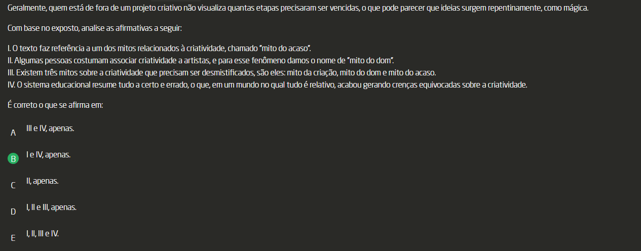<p>Geralmente, quem está de fora de um projeto criativo não visualiza quantas etapas precisaram ser vencidas, que pode parecer que ideias surgem repentinamente, como mágica. Com base no exposto, analise as afirmativas a seguir: texto faz referência a um dos mitos relacionados à criatividade, chamado "mito do acaso". II. Algumas pessoas costumam associar criatividade a artistas, e para esse fenômeno damos nome de "mito do III. Existem três mitos sobre a criatividade que precisam ser desmistificados, são eles: mito da criação, mito do dom e mito do acaso. IV. sistema educacional resume tudo a certo e errado, que, em um mundo no qual tudo é relativo, acabou gerando crenças equivocadas sobre a criatividade. É correto 0 que se afirma em: A III e IV, apenas. B I e IV, apenas. II, apenas. D I, II e III, apenas. E I, II, III e IV.</p>