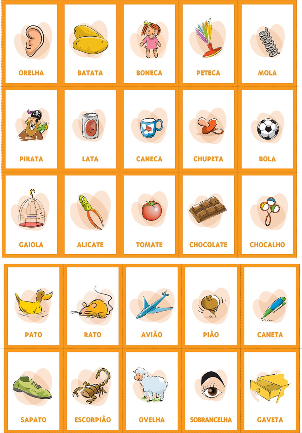 <p>ORELHA BATATA BONECA PETECA MOLA PIRATA LATA CANECA CHUPETA BOLA GAIOLA ALICATE TOMATE CHOCOLATE CHOCALHO PATO RATO AVIÃO PIÃO CANETA SAPATO ESCORPIÃO OVELHA SOBRANCELHA GAVETA</p>