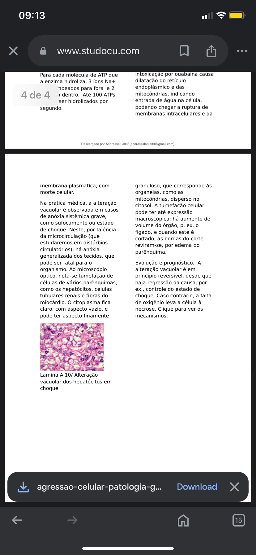 <p>09:13 www.studocu.com Para cada molécula de ATP que intoxicação por causa a enzima hidroliza, 3 íons Na+ dilatação do retículo para fora e 2 endoplásmico e das 4 de 4 dentro. Até 100 ATPs mitocôndrias, indicando ser hidrolizados por entrada de água na célula, segundo. podendo chegar a ruptura de membranas intracelulares e da Descargado por Andressa membrana plasmática, com granuloso, que corresponde às morte celular. organelas, como as mitocôndrias, disperso no Na prática médica, a alteração citosol. A tumefação celular vacuolar é observada em casos pode ter até expressão de anóxia sistêmica grave, macroscópica: há aumento de como sufocamento ou estado volume do órgão, p. ex. o de choque. Neste, por falência fígado, e quando este é da microcirculação (que cortado, as bordas do corte estudaremos em distúrbios reviram-se, por edema do circulatórios), há anóxia parênquima. generalizada dos tecidos, que pode ser fatal para o Evolução e prognóstico. A organismo. Ao microscópio alteração vacuolar é em óptico, nota-se tumefação de princípio reversível, desde que células de vários parênquimas, haja regressão da causa, por como os hepatócitos, células ex., controle do estado de tubulares renais e fibras do choque. Caso contrário, a falta miocárdio. o citoplasma fica de oxigênio leva a célula à claro, com aspecto vazio, e necrose. Clique para ver os pode ter aspecto finamente mecanismos. Lamina A.10/ Alteração vacuolar dos hepatócitos em choque agressao-celular-patologia-g... Download X 15</p>