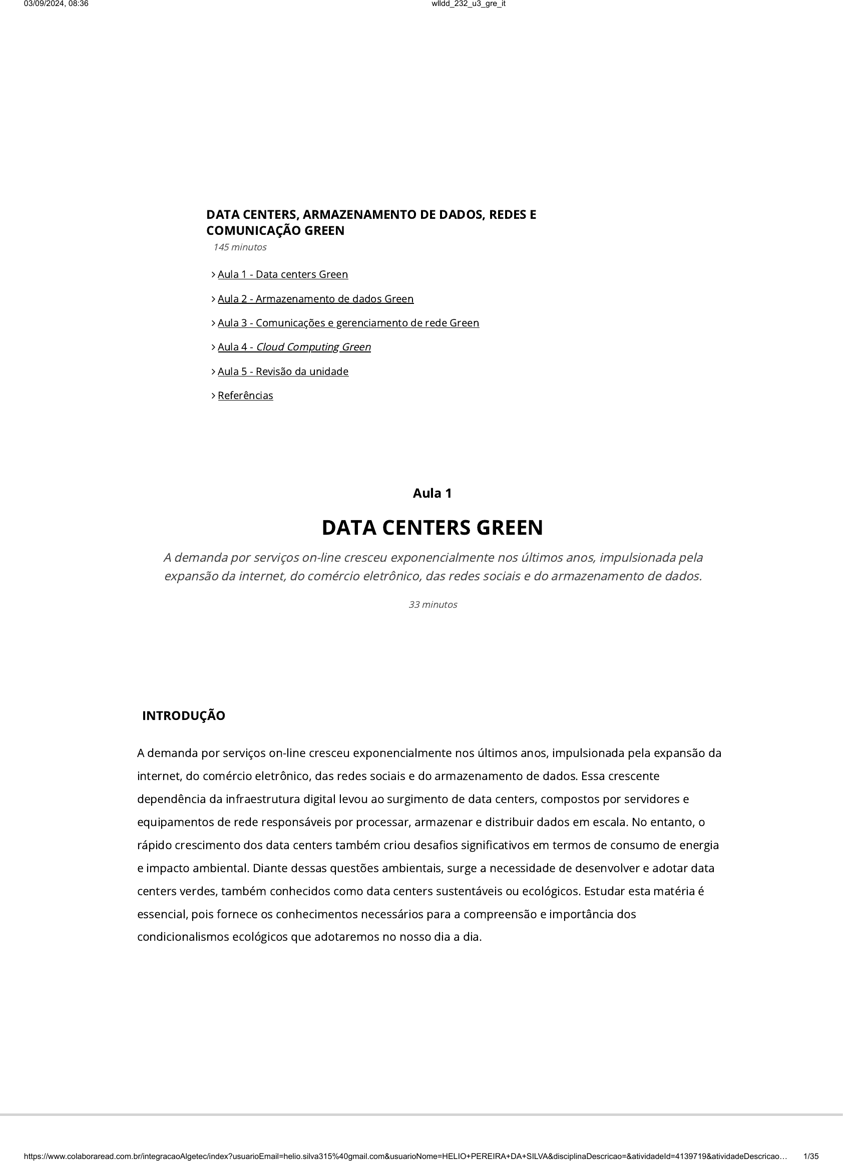 <p>INTRODUÇÃO</p><p>A demanda por serviços on-line cresceu exponencialmente nos últimos anos, impulsionada pela expansão da</p><p>internet, do comércio eletrônico, das redes sociais e do armazenamento de dados. Essa crescente</p><p>dependência da infraestrutura digital levou ao surgimento de data centers, compostos por servidores e</p><p>equipamentos de rede responsáveis por processar, armazenar e distribuir dados em escala. No entanto, o</p><p>rápido crescimento dos data centers também criou desa�os signi�cativos em termos de consumo de energia</p><p>e impacto ambiental. Diante dessas questões ambientais, surge a necessidade de desenvolver e adotar data</p><p>centers verdes, também conhecidos como data centers sustentáveis ou ecológicos. Estudar esta matéria é</p><p>essencial, pois fornece os conhecimentos necessários para a compreensão e importância dos</p><p>condicionalismos ecológicos que adotaremos no nosso dia a dia.</p><p>Aula 1</p><p>DATA CENTERS GREEN</p><p>A demanda por serviços on-line cresceu exponencialmente nos últimos anos, impulsionada pela</p><p>expansão da internet, do comércio eletrônico, das redes sociais e do armazenamento de dados.</p><p>33 minutos</p><p>DATA CENTERS, ARMAZENAMENTO DE DADOS, REDES E</p><p>COMUNICAÇÃO GREEN</p><p> Aula 1 - Data centers Green</p><p> Aula 2 - Armazenamento de dados Green</p><p> Aula 3 - Comunicações e gerenciamento de rede Green</p><p> Aula 4 - Cloud Computing Green</p><p> Aula 5 - Revisão da unidade</p><p> Referências</p><p>145 minutos</p><p>03/09/2024, 08:36 wlldd_232_u3_gre_it</p><p>https://www.colaboraread.com.br/integracaoAlgetec/index?usuarioEmail=helio.silva315%40gmail.com&usuarioNome=HELIO+PEREIRA+DA+SILVA&disciplinaDescricao=&atividadeId=4139719&atividadeDescricao… 1/35</p><p>CONHECENDO OS DATA CENTERS E SUAS MÉTRICAS</p><p>Infraestrutura, armazenamento e instalações de data centers</p><p>Para podermos entender sobre infraestrutura e instalações de um data center, é importante saber o que ele</p><p>faz. Então, vamos lá!</p><p>Conceito de implicações para a e�ciência energética</p><p>Data centers são grandes consumidores de energia elétrica, e a demanda por estes processadores de dados</p><p>segue uma tendência de aumento, considerando a popularização do uso da internet e os serviços associados</p><p>à computação em nuvem. Neste contexto, autoridades e gestores de Tecnologia da Informação (TI) passam</p><p>gradativamente a considerar de forma prioritária a e�ciência energética em um data center.</p><p>Um data center corresponde a um local físico que armazena máquinas de computação e seus equipamentos</p><p>de hardware relacionados. Ele contém a infraestrutura de computação que os sistemas de TI exigem, como</p><p>servidores, unidades de armazenamento de dados e equipamentos de rede. É a instalação física que</p><p>armazena os dados digitais de qualquer empresa.</p><p>Figura 1 | Data center físico</p><p>Fonte: Pexels.</p><p>Figura 2 | Data center físico Green/Empresa Dataprev</p><p>Fonte: Brasil (2022, [s. p.]).</p><p>Na Figura 1, vemos uma imagem real do data center que se localiza em Brasília, em São Paulo e no Rio de</p><p>Janeiro e foi projetado pela empresa pública Dataprev. Ele é referência em data center no Brasil.</p><p>03/09/2024, 08:36 wlldd_232_u3_gre_it</p><p>https://www.colaboraread.com.br/integracaoAlgetec/index?usuarioEmail=helio.silva315%40gmail.com&usuarioNome=HELIO+PEREIRA+DA+SILVA&disciplinaDescricao=&atividadeId=4139719&atividadeDescricao… 2/35</p><p>Novos data centers passaram a ser projetados pensando em se obter uma melhor e�ciência operacional, e os</p><p>retro�ts (técnicas aplicadas pela engenharia e pela arquitetura para trazer modernidade) são aplicados em</p><p>data centers já em operação, promovendo adequação ou modernização de seus equipamentos e da sua</p><p>infraestrutura. As vantagens e os benefícios advindos com a economia do consumo de energia estão</p><p>relacionados diretamente à redução de investimentos em projetos elétricos e de energia renovável.</p><p>Figura 3 | Consumo de energia típico de um data center</p><p>Fonte: acervo do autor.</p><p>A e�ciência energética em data centers (DC) tem conquistado cada vez mais espaço na agenda dos gestores</p><p>da área de TI. A adequação do consumo energético impacta diretamente na diminuição de custos. Um data</p><p>center energeticamente e�ciente tende a apresentar custos operacionais mais baixos, além de apresentar um</p><p>menor impacto ambiental durante a sua operação. Data centers são considerados ambientes críticos, ou seja,</p><p>não podem parar a sua operação. A função deles envolve a hospedagem de dispositivos de armazenamento</p><p>de dados, hardwares de redes e demais equipamentos computacionais responsáveis pelo processamento da</p><p>TI. Eles são provedores de serviço, cujo objetivo principal é garantir a entrega ininterrupta de serviços</p><p>computacionais (Marin, 2016).</p><p>Diferentemente dos Centros de Processamento de Dados (CPDs), nos quais o conceito era ter espaço para</p><p>aportar os computadores, os data centers, além de hospedarem computadores, são formados por salas que</p><p>abrigam os demais equipamentos de infraestrutura, como sistemas de energia, refrigeração, segurança</p><p>patrimonial, monitoramento e gerência de todos esses itens (Faccioni Filho, 2016).</p><p>Segundo Veras (2010), recentemente, a e�ciência do data center era medida exclusivamente em termos de</p><p>indicadores vinculados ao seu desempenho e à sua disponibilidade. Na atualidade, o fator custo também foi</p><p>adicionado a esta equação, e o consumo energético implica diretamente neste fator. Considerando questões</p><p>ambientais, o aspecto do “verde” nas diversas escolhas tecnológicas também passou a fazer parte dos</p><p>indicadores. O Uptime Institute (2014) levantou que os custos de energi