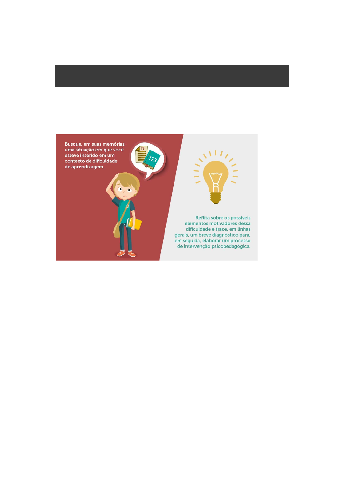 <p>Impresso por Jario Ribeiro, E-mail jarioribeiroef@gmail.com para uso pessoal e privado. Este material pode ser protegido por direitos</p><p>autorais e não pode ser reproduzido ou repassado para terceiros. 30/06/2023, 08:53:34</p><p>FUNDAMENTOS PSICOPEDAGÓGICOS DA</p><p>EDUCAÇÃO (2021PER4)</p><p>Desafio</p><p>O prazo para envio das respostas está encerrado.</p><p>A intervenção psicopedagógica, assim como as dificuldades de aprendizagem, é</p><p>uma situação na qual o psicopedagogo coloca seus conhecimentos à prova, uma vez que</p><p>estará inserido em seu campo de atuação, na busca pela resolução dos conflitos de</p><p>aprendizagem.</p><p>Lembre-se que, em algum momento da vida, nos depararemos com alunos com dificuldades</p><p>de aprendizagem; logo, é importante o exercício de observação para proceder com</p><p>adequadas estratégias de ajuda e auxílio a esses alunos. Tenha em mente:</p><p>a) faixa etária;</p><p>b) escolaridade;</p><p>c) fatores internos motivadores de dificuldades de aprendizagem;</p><p>d) fatores externos motivadores de dificuldades de aprendizagem;</p><p>e) possibilidade de intervenção psicopedagógica.</p><p>Padrão de resposta esperado</p><p>Para efeito de avaliação do desafio, sugere-se que o aluno estabeleça um diálogo entre</p><p>suas vivências e os autores que o embasam teoricamente no desenvolvimento da proposta,</p><p>apresentando sua capacidade de construção de análise e síntese reflexiva acerca da</p><p>temática proposta. O importante aqui é a percepção do aluno sobre o que ele considera,</p><p>efetivamente, como intervenção diagnóstica e dificuldade de aprendizagem.</p><p>1.</p><p>De acordo com a conceitualização internacional, as dificuldades de aprendizagem se</p><p>caracterizam por:</p><p>Impresso por Jario Ribeiro, E-mail jarioribeiroef@gmail.com para uso pessoal e privado. Este material pode ser protegido por direitos</p><p>autorais e não pode ser reproduzido ou repassado para terceiros. 30/06/2023, 08:53:34</p><p>D.</p><p>Funcionamento abaixo do esperado, interferindo no rendimento escolar do aluno ou em seu</p><p>cotidiano.</p><p>Tais fatores são agentes que desencadeiam uma dificuldade de aprendizagem, em</p><p>conformidade com a conceitualização internacional.</p><p>2.</p><p>Sobre a função do diagnóstico psicopedagógico, podemos AFIRMAR que é:</p><p>C.</p><p>Verificar em que contexto ocorre a aprendizagem do aluno, bem como suas competências</p><p>e dificuldades.</p><p>É por meio dessa verificação inicial que será possível apontar em que condições o aluno</p><p>aprende.</p><p>3.</p><p>Considerando o processo de intervenção psicopedagógica, podemos considerar que</p><p>a psicopedagogia tem como campo profissional áreas como:</p><p>E.</p><p>Educação e saúde.</p><p>Educação e saúde estão representadas também como áreas institucional e clínica de</p><p>atuação do psicopedagogo.</p><p>4.</p><p>No decorrer desta unidade, você viu que a psicopedagogia teve sua origem na</p><p>urgência em atender crianças que apresentavam dificuldades de aprendizagem.</p><p>Anteriormente, essas crianças e seus agentes dificultadores da aprendizagem eram</p><p>estudados por algumas áreas específicas. Quais são elas?</p><p>A.</p><p>Medicina e psicologia.</p><p>Em outros momentos, o profissional era chamado de "psicólogo escolar", "psicólogo" ou</p><p>"pedagogo" com atuação nessa área profissional.</p><p>5.</p><p>Podemos afirmar que o objeto de estudo da psicopedagogia é:</p><p>E.</p><p>Impresso por Jario Ribeiro, E-mail jarioribeiroef@gmail.com para uso pessoal e privado. Este material pode ser protegido por direitos</p><p>autorais e não pode ser reproduzido ou repassado para terceiros. 30/06/2023, 08:53:34</p><p>A aprendizagem humana.</p><p>Para a psicopedagogia, tudo que se refere aos processos de aprendizagem humana,</p><p>sobretudo na ação escolar e em seu cotidiano, é significativo e relevante.</p><p>Desafio</p><p>O prazo para envio das respostas está encerrado.</p><p>Laura é professora de Língua Portuguesa em turmas de 5º ano de uma escola de ensino</p><p>fundamental, na qual você atua junto à coordenação pedagógica desempenhando a função</p><p>de psicopedagogo. Laura necessita do seu apoio para o desenvolvimento de um projeto de</p><p>aprendizagem, pois está com sérias dificuldades na área da leitura com seus alunos. Ela</p><p>relata que eles não conseguem manter a atenção, permanecendo dispersos boa parte do</p><p>tempo. Apresenta informações relevantes, como o gosto por determinados tipos de leituras</p><p>(p. ex., gibi, HQ e mangá ).</p><p>Considerando o contexto apresentado por Laura, elabore um plano de ação para o ensino</p><p>de estratégias aos alunos. Lembre-se de que deverá considerar na descrição do seu plano</p><p>de ação os seguintes princípios básicos: explicitar as estratégias, integrar a metacognição</p><p>ao ensino-aprendizagem, modelagem, trabalho em grupo, síntese metacognitiva e uso de</p><p>fichas de procedimentos. Utilize os recursos do PowerPoint ou outro editor de apresentação</p><p>similar a este para viabilizar suas ideias. Faça uso também de esquemas de assimilação,</p><p>mapas conceituais, imagens e materiais que favoreçam sua criação.</p><p>Padrão de resposta esperado</p><p>Será considerado como satisfatório o plano de ação que integrar os princípios básicos</p><p>referentes ao ensino de estratégias, que são: explicitar as estratégias, integrar a</p><p>metacognição ao ensino-aprendizagem, modelagem, trabalho em grupo, síntese</p><p>metacognitiva e uso de fichas de procedimentos. A criatividade é fator relevante nesta</p><p>construção visual do aluno.</p><p>1.</p><p>Qual o principal desafio para o professor no ensino-aprendizagem de estratégias?</p><p>A.</p><p>Ensinar estratégias ao mesmo tempo em que apresenta sua utilidade, sua eficiência e as</p><p>possibilidades de transferência qu