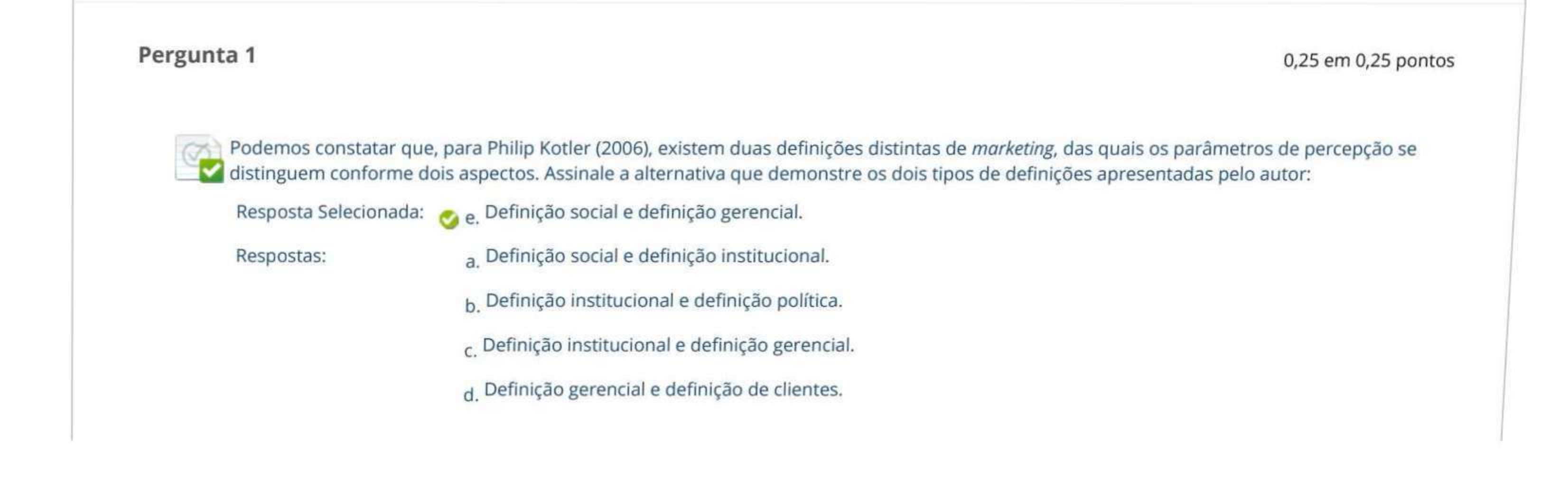 <p>Pergunta 1 0,25 em 0,25 pontos Podemos constatar que, para Philip Kotler (2006), existem duas definições distintas de marketing, das quais os parâmetros de percepção se distinguem conforme dois aspectos. Assinale a alternativa que demonstre os dois tipos de definições apresentadas pelo autor: Resposta Selecionada: e. Definição social e definição gerencial. Respostas: a. Definição social e definição institucional. b. Definição institucional e definição política. Definição institucional e definição gerencial. d. Definição gerencial e definição de clientes.</p><p>e. Definição social e definição gerencial. Comentário da Resposta: E resposta: Comentário: as duas definições estabelecidas para marketing, segundo Kotler, são: Definição social: "um processo social por meio do qual pessoas e grupos de pessoas obtêm aquilo de que necessitam e o que desejam com a criação, oferta e livre negociação de produtos e serviços de valor com outros". Definição gerencial é o "processo de planejar e executar a concepção, a determinação de preço, a promoção e a distribuição de ideias, bens e serviços para criar negociações que satisfaçam metas individuais e organizacionais" (KOTLER, 1998, p. 30). Pergunta 2 0,25 em 0,25 pontos Para Philip Kotler, existem duas definições de marketing que estruturam todo o saber da disciplina. Quando estamos nos referindo à definição social, estamos falando de: Proporcionar à sociedade uma qualidade de vida superior. II. Proporcionar às organizações uma lucratividade maior para que possam distribuir os rendimentos com os colaboradores. III. Atender as necessidades e os desejos de pessoas e grupos de pessoas, por meio da criação de ofertas de produtos e serviços que tenham valor para esses grupos. Resposta Selecionada: e. e III estão corretas. Respostas: a. I está correta. b. está correta. III está correta. d. e II estão corretas. e. I e III estão corretas. Comentário da Resposta: E resposta: Comentário: falar em marketing pela perspectiva social é falar em atender necessidades e desejos das pessoas por meio de produtos e serviços, visando a proporcionar uma melhor qualidade de vida.</p><p>Pergunta 3 0,25 em 0,25 pontos Existem diversos em relação à palavra marketing. Sabemos que a tradução literal é mercadologia, o que, por definição, podemos dizer que significa: Resposta Selecionada: Estudo de mercado. e. Respostas: a. Mercado. b. Pessoas. Vendas. d. Produtos e serviços. e. Estudo de mercado. Comentário da Resposta: E resposta: Comentário: não podemos esquecer que a tradução literal de marketing deveria ser mercadologia, ou seja, mercado + logia = estudo; sendo, portanto, estudo de mercado. Pergunta 4 0,25 em 0,25 pontos Para o alcance dos objetivos organizacionais, as empresas precisam compreender que são afetadas direta ou indiretamente pelos ambientes das quais fazem parte. Segundo Philip Kotler esses ambientes podem ser divididos, de forma mais ampla, em: I. Ambiente publicitário. II. Ambiente externo ou macroambiente.</p><p>III Ambiente tecnológico. IV. Ambiente interno ou microambiente. Resposta Selecionada: e. e IV estão corretas. Respostas: a. I e estão corretas. b. e III estão corretas. III e IV estão corretas. d. I e III estão corretas. e. e IV estão corretas. Comentário da Resposta: E resposta: Comentário: os ambientes pelos quais as empresas fazem parte são: macroambiente ou ambiente externo, composto por todas as forças incontroláveis que podem afetar direta ou indiretamente as organizações e o ambiente microambiente ou ambiente externo, composto pelas forças controláveis pelas organizações, como funcionários, fornecedores e clientes. Pergunta 5 0,25 em 0,25 pontos Quando estamos falando do macroambiente, existem forças diversas que estruturam esse ambiente externo à empresa e sobre o qual ela não tem Ao estudarmos a força da moeda vigente, estamos falando de qual força? Resposta Selecionada: Econômica. Respostas: a. Demográfica. b. Político-legal. Econômica. d.</p><p>e. Natural. Comentário da Resposta: C resposta: Comentário: a força econômica diz respeito às estruturas determinadas pelo governo de cada país para estabelecer uma moeda forte na economia. Pergunta 6 0,25 em 0,25 pontos As forças culturais e sociais têm grande influência nos hábitos e nas preferências das pessoas. Sendo assim, é correto afirmarmos que: É por meio das forças socioculturais que a decisão de compra das pessoas será direcionada para determinado produto e/ou serviço em detrimento de outro. II. É por meio das forças socioculturais que o profissional de marketing conseguirá estabelecer a visão que as pessoas têm de si, das outras pessoas, das instituições, da sociedade e do universo como um todo. III. É preciso que as vendas de produtos girem em torno dos valores de determinada sociedade a fim de obterem sucesso. IV. Para internacionalizar é fundamental que o profissional de marketing conheça profundamente a cultura e os valores do país em que quer ingressar com seus produtos ou serviços. Resposta Selecionada: d. I, II, III e IV estão corretas. Respostas: a. I e estão corretas. b. II, III e IV estão corretas. I, III e IV estão corretas. d. I, II, III e IV estão corretas. e. Todas as afirmativas apresentadas dizem respeito a outras forças macroambientais. Comentário da resposta: Resposta: D Comentário: todas as afirmativas apresentadas dizem respeito às forças culturais e sociais.</p><p>Pergunta 7 0,25 em 0,25 pontos o princípio da segmentação indica que os mercados são divididos por suas características, diferentes entre si. Essa divisão resulta em alguns tipos de mercado. Assinale qual das alternativas nos traz quais são esses mercados: Resposta Selecionada: a. Mercado consumidor, industrial, revendedor, governamental e internacional. Respostas: a. Mercado consumidor, industrial, revendedor, governamental e internacio