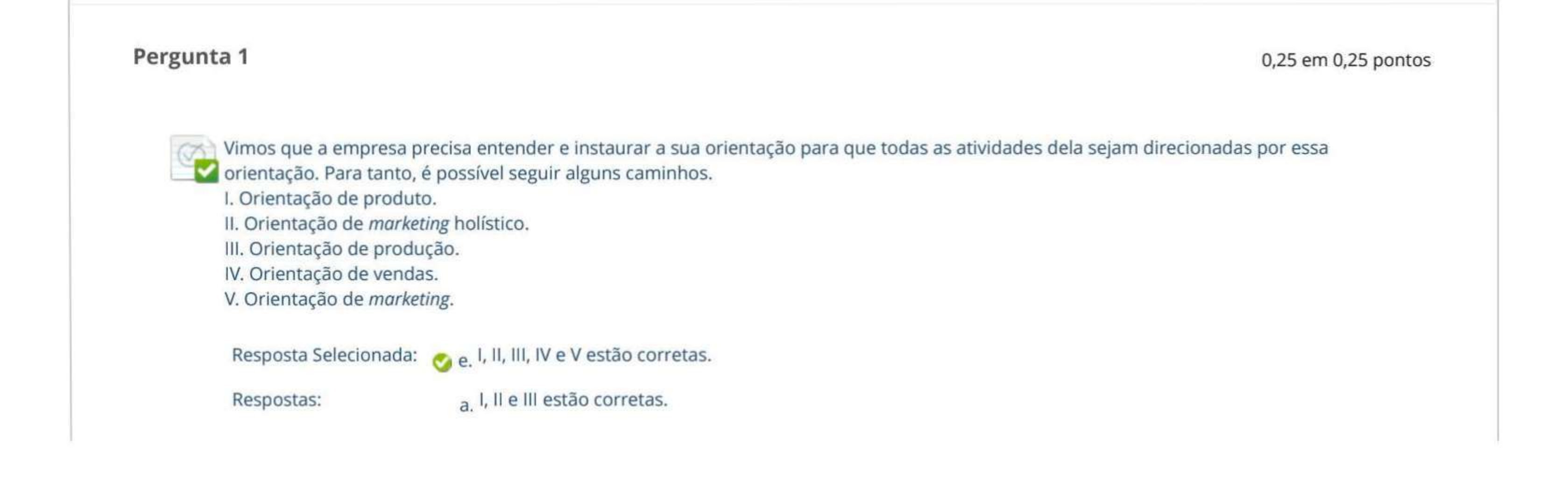 <p>Pergunta 1 0,25 em 0,25 pontos Vimos que a empresa precisa entender e instaurar a sua orientação para que todas as atividades dela sejam direcionadas por essa orientação. Para tanto, é possível seguir alguns caminhos. I. Orientação de produto. II. Orientação de marketing III. Orientação de produção. IV. Orientação de vendas. V. Orientação de marketing. Resposta Selecionada: I, II, III, IV e V estão corretas. Respostas: a. I, Il e III estão corretas.</p><p>b. II, III e IV estão corretas. III, IV e V estão corretas. d. I, III e IV estão corretas. e. I, II, III, IV e V estão corretas. Comentário da Resposta: E resposta: Comentário: todas as afirmativas estão corretas porque a empresa pode se voltar exclusivamente para o produto, sua qualidade, performance etc. Ela pode se voltar para o marketing e para melhorar um posicionamento de mercado por meio da comunicação, da publicidade, das promoções; pode também se orientar para a produção e a minimização de custos de produção; para as vendas, ou seja, voltar-se para um olhar comercial e, por último, ela pode sim ter uma orientação de marketing holístico que entenderá que a organização é parte de um todo. Pergunta 2 0,25 em 0,25 pontos Analise as afirmativas e a relação proposta entre elas. Como vimos, a orientação de marketing surgiu na década de 1950, quando as empresas, logo depois da Segunda Grande Guerra Mundial, precisaram readequar suas filosofias de trabalho, deixando de procurar clientes para seus produtos e passando a desenvolver produtos para seus clientes. Diante disso é correto afirmarmos que: II. Qualquer empresa, não importa seu tamanho, pode migrar para o conceito de orientação para o marketing, desde que entenda seus objetivos e mude seus paradigmas, fazendo com que o cliente seja o centro dos negócios. Resposta Selecionada: d. Ambas as afirmativas estão corretas e a segunda é consequência da primeira. Respostas: a. Somente a afirmativa está correta. b. Somente a afirmativa II está correta. Ambas as afirmativas estão incorretas.</p><p>d. Ambas as afirmativas estão corretas e a segunda é consequência da primeira. e. Ambas as afirmativas estão corretas, porém a segunda não é consequência da primeira. Comentário da Resposta: D resposta: Comentário: ambas estão corretas porque depois do pós-guerra foi realmente preciso olhar o cliente de maneira diferente, entendendo suas necessidades a fim de criar produtos que pudessem atendê-lo. Dessa forma, como consequência, toda empresa pode migrar para essa orientação, mas vai precisar ter esse mesmo enfoque, ou seja, colocar o cliente como centro do negócio. Pergunta 3 0,25 em 0,25 pontos o marketing integrado, como o próprio nome diz, visa à elaboração de programas que integrem todas as atividades da empresa para criar, comunicar e entregar valores para os clientes. Seria, então, correto afirmarmos que: As atividades de marketing podem assumir várias formas. II. As atividades de marketing só podem seguir um caminho, caso contrário perdem a identificação com o cliente. III. Uma empresa sempre tem algo a oferecer, que deverá ser distribuído no mercado de forma conveniente a um preço estrategicamente definido e comunicado com eficácia para seu público-alvo. Resposta Selecionada: e. e III estão corretas. Respostas: a. I está correta. b. II está correta. III está correta. d. I e estão corretas. e. I e III estão corretas. Comentário da E resposta: Comentário: o marketing não só pode como deve assumir várias formas a fim de que entre em adequação com as orientações empresariais,</p><p>lembrando que é fundamental ter o produto certo, no lugar certo, com o preço certo direcionado para o cliente específico. Pergunta 4 0,25 em 0,25 pontos Sabemos o quanto é fundamental monitorarmos a concorrência para que não sejamos pegos de surpresa, mas antes de qualquer coisa, é preciso identificarmos o tipo de concorrência que enfrentamos ou enfrentaremos e essa identificação pode ser feita analisando a concorrência do ponto de vista setorial ou de mercado. Quando estamos falando de um setor onde não há uma base para diferenciação e os preços dos concorrentes são praticamente os mesmos e a diferenciação acaba se dando pelo conceito criado para o produto, estamos falando de: Resposta Selecionada: d. Concorrência pura. Respostas: a. Oligopólio. b. Monopólio. Concorrência monopolista. d. Concorrência pura. e. Tanto podemos estar falando de monopólio quanto de concorrência monopolista. Comentário da Resposta: D resposta: Comentário: quando a empresa não se diferencia dos seus concorrentes pelo produto ou serviço que oferece, nem pelo preço ou distribuição, havendo somente a condição de criar um conceito a fim de persuadir o cliente, estamos falando de concorrência pura. Pergunta 5 0,25 em 0,25 pontos</p><p>É fundamental a empresa e seus dirigentes mapearem o mercado para poderem definir seus objetivos, metas e as estratégias que farão com que os resultados sejam atingidos. Para isso, após a identificação de seus concorrentes, a empresa precisa: I. Analisar suas forças e suas fraquezas. II. Estabelecer objetivos. III. Analisar quais são as ações que deverão ser tomadas. IV. Estabelecer as metas a serem atingidas a fim de se mensurar resultados. Resposta Selecionada: e. I, II, III e IV estão corretas. Respostas: a. está correta. b. I e III estão corretas. C. II, III e IV estão corretas. d. e IV estão corretas. e. I, II, III e IV estão corretas. Comentário da Resposta: E resposta: Comentário: todas as afirmativas se encontram corretas porque precisamos analisar nossas forças e fraquezas para podermos estabelecer objetivos coerentes e plausíveis. A partir é necessário analisar as ações que serão tomadas a fim de atingirmos os objetivos e só conseguimos mensurar os resultados a partir do momento em que quantificamos esses objetivos por meio das metas.