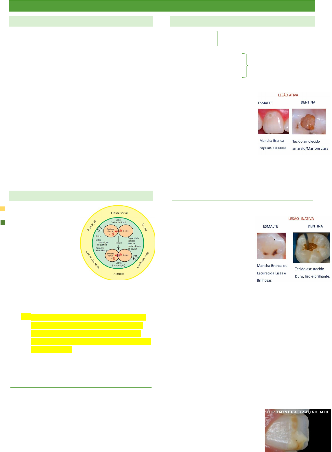 <p>dentística</p><p>diagnóstico e plano de tratamento</p><p>· Anamnese: investigar o histórico médico, queixas do paciente, uso de medicamentos (ex.: medicamentos para hipertensão e ansiedade que podem alterar produção salivar, proporcionando o aparecimento de lesões cariosas)</p><p>· Exame clínico: observar as características de cada dente, o campo operatório deve estar limpo, bem iluminado e seco. Esses três itens, principalmente uma profilaxia prévia ajudam a verificar melhor se o paciente necessita de um tratamento periodontal, pois um cálculo por exemplo pode mascarar alguma alteração que possa estar presente</p><p>· Exames complementares: raio-x bitewing, (radiografia interproximal) é melhor para avaliar cáries proximais que não são visíveis somente ao realizar exame clínico, e o rx periapical pode auxiliar no diagnóstico de diversas doenças e possíveis lesões no periápice</p><p>cariologia</p><p>Fatores externos</p><p>Fatores comportamentais</p><p>o que pode causar uma lesão de mancha branca?</p><p>· A cárie ocorre por meio do ataque de ácidos produzidos pelas bactérias, que formam as placas (biofilme)</p><p>· A produção do acido é maior quando há o consumo de açúcar e carboidratos</p><p>· É importante avaliar a relação do paciente com o biofilme e ao fluxo salivar, já que a saliva possui capacidade de tampão (pode alterar o pH) que pode tornar o biofilme menos ácido levando a uma desmineralização</p><p>· Outras influências de desmineralização podem ocorrer pela dieta, falta de higienização, tempo que o biofilme está depositado</p><p>evidenciador de placa bacteriana</p><p>· Serve para que o paciente possa visualizar as áreas que necessitam de uma melhor higienização</p><p>· Geralmente são áreas interproximais e regiões cervicais</p><p>diagnóstico de mancha branca</p><p>· Ativa Originados por fatores cariogênicos</p><p>· Inativa</p><p>· Fluorose Originado por fatores congênitos</p><p>· Hipomineralização</p><p>· Hipoplasia de esmalte</p><p>mancha branca de lesão ativa</p><p>· A superfície do esmalte sofreu uma desmineralização</p><p>· Se estiver ativa significa que está em processo</p><p>· Essa lesão se interfere por meio de 4 sessões de fluorterapia</p><p>· Prevalente na superfície vestibular e na região cervical de dentes posteriores</p><p>· Aspecto opaco, sem brilho, fluorterapia 4 sessões com verniz</p><p>mancha branca de lesão inativa</p><p>· Alteração de cor devido ao processo reparador da dentina</p><p>· Esmalte fica escurecido ou brilhoso</p><p>· Se o paciente higienizar a mancha fica estagnada, paralização do processo</p><p>· Esse tipo de dentina quando inativa, ao passar a cureta ela não solta facilmente (dentina afetada)</p><p>· Pacientes que utilizam aparelho possuem mais chances de desenvolverem lesões cariosas em volta do brequet, pois são regiões de acúmulo de biofilme</p><p>hipomineralização de esmalte</p><p>· Alteração na translucides do esmalte (formação de mancha branca)</p><p>· Especificas em regiões incisais</p><p>· Possui um aspecto mais acastanhado, é acompanhada de uma síndrome que consiste no defeito do processo de mineralização que ocorre em dente permanente (molares e incisivos)</p><p>· Para tratar a estética desses casos se faz o desgaste da região e restaura em seguida</p><p>hipoplasia de esmalte</p><p>· Formação incompleta/deficiente da matriz orgânica do esmalte. O germe dentário sofreu deficiência nutritiva (falta de cálcio) ou sofreu alteração sistêmica durante a gravidez</p><p>· Apresenta-se como manchas esbranquiçadas, rugosas, possui sulcos ou ranhuras</p><p>· As cavidades expõem a dentina (cor amarelada)</p><p>· Sensibilidade</p><p>fluorose</p><p>· Alteração no esmalte devido ao excesso de flúor no organismo na formação dos dentes</p><p>· Um efeito colateral devido ao uso crônico</p><p>· Forma manchas ou estrias esbranquiçadas</p><p>· Infiltrantes resinosos podem reestabelecer a estética</p><p>O Infiltrante Resinoso (ICON) preenche as microporosidades do corpo da lesão de mancha branca, pela infiltração de uma resina de baixa viscosidade fotopolimerizável, afim de camuflar as manchas brancas, melhorar a estética e impedir a progressão da cárie dental.</p><p>cárie e sulco pigmentado</p><p>· Sulco pigmentado: é uma mancha escura</p><p>· Isolado ou não</p><p>· Superfície do dente na região de fissura da coroa</p><p>· Processo de remineralização do dente</p><p>· Cárie: processo de desmineralização</p><p>· Apresenta cavidades</p><p>· Podem ser ativas</p><p>· Diagnóstico precisa de radiografia</p><p>A classificação só pode ser definida após a remoção do tecido cariado. Exemplo:Cárie</p><p>Sulco pigmentado</p><p>Cárie</p><p>Sulco pigmentado</p><p>Lesão de cárie extensa, cavitada que acomete esmalte e dentina. Tratamento é RRC Classe II O-M</p><p>cárie crônica</p><p>· Cavidade aberta por muito tempo provoca desmineralização lenta</p><p>· Fica extremamente escurecida</p><p>tetraciclina</p><p>· Escurecimento dos dentes em virtude do uso de tetraciclina (antibiótico usado na gravidez)</p><p>· Tratamento: clareamento – 6 sessões – de consultório em alta concentração de peróxido de hidrogênio</p><p>image4.jpeg</p><p>image5.jpeg</p><p>image6.jpeg</p><p>image7.png</p><p>image8.jpeg</p><p>image9.jpeg</p><p>image10.jpeg</p><p>image11.jpeg</p><p>image12.jpeg</p><p>image13.jpeg</p><p>image1.jpeg</p><p>image2.jpeg</p><p>image3.jpeg</p>
