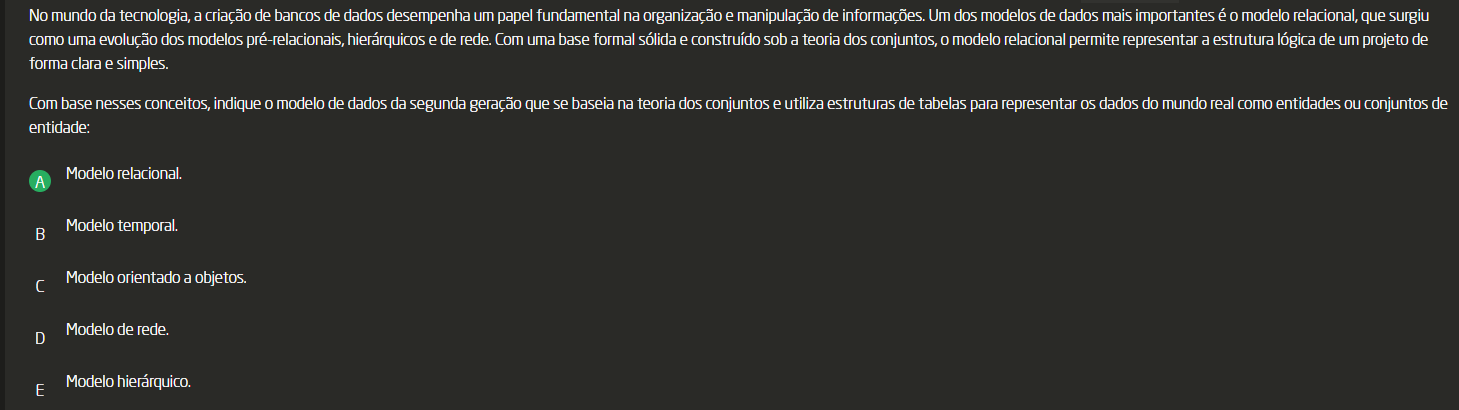 <p>No mundo da tecnologia, a criação de bancos de dados desempenha um papel fundamental na organização e manipulação de informações. Um dos modelos de dados mais importantes é modelo relacional, que surgiu como uma evolução dos modelos pré-relacionais, hierárquicos e de rede. Com uma base formal sólida e construído sob a teoria dos conjuntos, modelo relacional permite representar a estrutura lógica de um projeto de forma clara e simples Com base nesses conceitos, indique modelo de dados da segunda geração que se baseia na teoria dos conjuntos e utiliza estruturas de tabelas para representar os dados do mundo real como entidades ou conjuntos de entidade: Modelo relacional. A B Modelo temporal. Modelo orientado a objetos. Modelo de rede. D E Modelo hierárquico.</p>