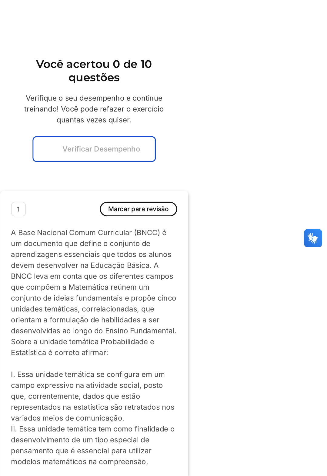 <p>Você acertou 0 de 10</p><p>questões</p><p>Verifique o seu desempenho e continue</p><p>treinando! Você pode refazer o exercício</p><p>quantas vezes quiser.</p><p>Verificar Desempenho</p><p>1 Marcar para revisão</p><p>A Base Nacional Comum Curricular �BNCC) é</p><p>um documento que define o conjunto de</p><p>aprendizagens essenciais que todos os alunos</p><p>devem desenvolver na Educação Básica. A</p><p>BNCC leva em conta que os diferentes campos</p><p>que compõem a Matemática reúnem um</p><p>conjunto de ideias fundamentais e propõe cinco</p><p>unidades temáticas, correlacionadas, que</p><p>orientam a formulação de habilidades a ser</p><p>desenvolvidas ao longo do Ensino Fundamental.</p><p>Sobre a unidade temática Probabilidade e</p><p>Estatística é correto afirmar:</p><p>I. Essa unidade temática se configura em um</p><p>campo expressivo na atividade social, posto</p><p>que, correntemente, dados que estão</p><p>representados na estatística são retratados nos</p><p>variados meios de comunicação.</p><p>II. Essa unidade temática tem como finalidade o</p><p>desenvolvimento de um tipo especial de</p><p>pensamento que é essencial para utilizar</p><p>modelos matemáticos na compreensão,</p><p>A</p><p>B</p><p>C</p><p>D</p><p>E</p><p>representação e análise de relações</p><p>quantitativas de grandezas e, também, de</p><p>situações e estruturas matemáticas, fazendo</p><p>uso de letras e outros símbolos.</p><p>III. Essa unidade contribui ainda para a</p><p>consolidação e ampliação da noção de número,</p><p>a aplicação de noções geométricas e a</p><p>construção do pensamento algébrico.</p><p>I, II, III</p><p>II, III</p><p>II</p><p>I, II</p><p>I</p><p>Questão não respondida</p><p>Opa! A alternativa correta é a letra</p><p>D. Confira o gabarito comentado!</p><p>Gabarito Comentado</p><p>As alternativas I e II estão corretas e fazem</p><p>parte da Unidade Temática Probabilidade e</p><p>Estatística. A alternativa I destaca a</p><p>relevância social da estatística, que é</p><p>frequentemente utilizada em diversos</p><p>meios de comunicação. A alternativa II</p><p>ressalta a importância dessa unidade</p><p>temática para o desenvolvimento de um</p><p>pensamento especial, essencial para a</p><p>utilização de modelos matemáticos na</p><p>compreensão, representação e análise de</p><p>relações quantitativas de grandezas e de</p><p>estruturas matemáticas. A alternativa III,</p><p>embora seja importante para a matemática</p><p>como um todo, não está diretamente</p><p>relacionada à unidade temática de</p><p>Probabilidade e Estatística, mas sim à</p><p>unidade temática de Grandezas e Medidas.</p><p>2 Marcar para revisão</p><p>A Base Nacional Comum Curricular �BNCC) é</p><p>um documento que foi instituído em 2017 e tem</p><p>como foco as aprendizagens essenciais que</p><p>todos os alunos devem desenvolver ao longo da</p><p>Educação Básica e para isso são previstas</p><p>habilidades em cada ano de escolaridade que</p><p>devem ser desenvolvidas. Analise o conjunto de</p><p>habilidades explicitadas para o Ensino</p><p>Fundamental pela BNCC de Matemática:</p><p>I. Analisar e identificar, em gráficos divulgados</p><p>pela mídia, os elementos que podem induzir, às</p><p>vezes propositadamente, erros de leitura, como</p><p>escalas inapropriadas, legendas não</p><p>explicitadas corretamente, omissão de</p><p>informações importantes (fontes e datas), entre</p><p>outros.</p><p>II. Selecionar razões, de diferentes naturezas</p><p>(física, ética ou econômica), que justificam a</p><p>realização de pesquisas amostrais e não</p><p>censitárias, e reconhecer que a seleção da</p><p>amostra pode ser feita de diferentes maneiras</p><p>(amostra casual simples, sistemática e</p><p>estratificada).</p><p>III. e executar pesquisa amostral, selecionando</p><p>uma técnica de amostragem adequada, e</p><p>escrever relatório que contenha os gráficos</p><p>apropriados para representar os conjuntos de</p><p>dados, destacando aspectos como as medidas</p><p>Questão 2 de 10</p><p>Em branco �10�</p><p>1 2 3 4 5</p><p>6 7 8 9 10</p><p>Exercicio</p><p>O Ensino-aprendizagem De</p><p>Probabilidade e Estatística e</p><p>Bncc</p><p>Sair</p><p>Alto contraste</p><p>A</p><p>B</p><p>C</p><p>D</p><p>E</p><p>de tendência central, a amplitude e as</p><p>conclusões.</p><p>IV. Calcular a probabilidade de um evento</p><p>aleatório, expressando-a por número racional</p><p>(forma fracionária, decimal e percentual) e</p><p>comparar esse número com a probabilidade</p><p>obtida por meio de experimentos sucessivos.</p><p>Dessas habilidades, as duas previstas para o 8º</p><p>ano do Ensino Fundamental são apenas</p><p>Alternativas:</p><p>I, II</p><p>I, III</p><p>I, IV</p><p>II e III</p><p>III, IV</p><p>Questão não respondida</p><p>Opa! A alternativa correta é a letra</p><p>D. Confira o gabarito comentado!</p><p>Gabarito Comentado</p><p>As habilidades descritas na alternativa D,</p><p>que são "Selecionar razões, de diferentes</p><p>naturezas (física, ética ou econômica), que</p><p>justificam a realização de pesquisas</p><p>amostrais e não censitárias, e reconhecer</p><p>que a seleção da amostra pode ser feita de</p><p>diferentes maneiras (amostra casual</p><p>simples, sistemática e estratificada)" e</p><p>"Executar pesquisa amostral, selecionando</p><p>uma técnica de amostragem adequada, e</p><p>escrever relatório que contenha os gráficos</p><p>apropriados para representar os conjuntos</p><p>de dados, destacando aspectos como as</p><p>medidas de tendência central, a amplitude</p><p>e as conclusões", são as previstas para o</p><p>8º ano do Ensino Fundamental, de acordo</p><p>com a Base Nacional Comum Curricular</p><p>�BNCC�. As habilidades descritas nas</p><p>opções I e IV são destinadas,</p><p>respectivamente, ao 9º e ao 6º ano do</p><p>Ensino Fundamental.</p><p>3 Marcar para revisão</p><p>Na BNCC, a unidade temát