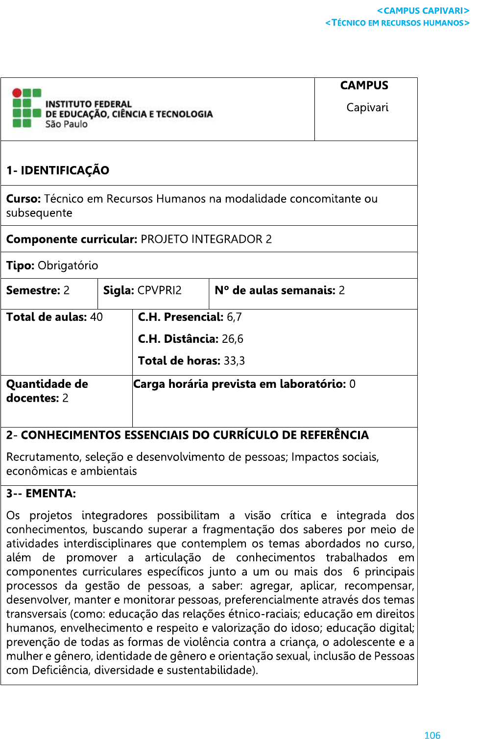 <p><CAMPUS CAPIVARI> <TÉCNICO EM RECURSOS HUMANOS> CAMPUS INSTITUTO FEDERAL Capivari DE EDUCAÇÃO, CIÊNCIA E TECNOLOGIA São Paulo - IDENTIFICAÇÃO Curso: Técnico em Recursos Humanos na modalidade concomitante ou subsequente Componente curricular: PROJETO INTEGRADOR 2 Tipo: Obrigatório Semestre: 2 Sigla: CPVPRI2 N° de aulas semanais: 2 Total de aulas: 40 C.H. Presencial: 6,7 C.H. Distância: 26,6 Total de horas: 33,3 Quantidade de Carga horária prevista em laboratório: 0 docentes: 2 2- - CONHECIMENTOS ESSENCIAIS DO CURRÍCULO DE REFERÊNCIA Recrutamento, seleção e desenvolvimento de pessoas; Impactos sociais, econômicas e ambientais 3-- EMENTA: Os projetos integradores possibilitam a visão crítica e integrada dos conhecimentos, buscando superar a fragmentação dos saberes por meio de atividades interdisciplinares que contemplem os temas abordados no curso, além de promover a articulação de conhecimentos trabalhados em componentes curriculares específicos junto a um ou mais dos 6 principais processos da gestão de pessoas, a saber: agregar, aplicar, recompensar, desenvolver, manter e monitorar pessoas, preferencialmente através dos temas transversais (como: educação das relações étnico-raciais; educação em direitos humanos, envelhecimento e respeito e valorização do idoso; educação digital; prevenção de todas as formas de violência contra a criança, o adolescente e a mulher e gênero, identidade de gênero e orientação sexual, inclusão de Pessoas com Deficiência, diversidade e sustentabilidade). 106</p><p><CAMPUS CAPIVARI> <TÉCNICO EM RECURSOS HUMANOS> 4- OBJETIVOS: Integrar conhecimentos dos temas transversais com as diversas áreas do curso para abordar desafios complexos de forma holística. Desenvolver competências técnicas relevantes para desempenho eficiente das atividades profissionais. Demonstrar atitudes éticas, colaborativas e respeitosas no ambiente de trabalho. Aplicar conceitos teóricos em situações práticas do mundo real. 5 CONTEÚDO PROGRAMÁTICO: Educação das relações étnico-raciais; Educação em direitos humanos; Educação ambiental e Sustentabilidade; Respeito e valorização do idoso; Inclusão de Pessoas com Deficiência; Agregar, aplicar, recompensar, desenvolver, manter e monitorar pessoas; O papel do RH para a promoção da diversidade nas empresas; Orientação para elaboração dos resultados e discussão; Orientação para conclusão do projeto integrador; Orientação para a apresentação do projeto. 6 - BIBLIOGRAFIA BÁSICA: AMARO, Sarita. Racismo, igualdade racial e políticas de ações afirmativas no Brasil. Porto Alegre: EdiPUC-RS, 2015. 13,30 p. ISBN 9788539707331. E-book (Biblioteca Virtual da Pearson). CARVALHO, José Murilo de. Cidadania no Brasil: longo caminho. 15. ed. Rio de Janeiro: Civilização brasileira, 2012. 236 p. ISBN 9788520005651. DECLARAÇÃO UNIVERSAL DOS DIREITOS HUMANOS. Assembleia Geral das Nações Unidas em 10 dez. 1948. Disponível em: Acesso em 07 nov. 2019. 7 - BIBLIOGRAFIA COMPLEMENTAR ARENDT, Hannah. Eichmann em Jerusalém: um relato sobre a banalidade do mal. São Paulo: Companhia das Letras, 2013,3. 336 p. ISBN 97885713,349620 107</p><p><CAMPUS CAPIVARI> <TÉCNICO EM RECURSOS HUMANOS> BEAUVOIR, Simone de. A velhice. Rio de Janeiro: Nova Fronteira, 2008. 711p. ISBN 852090213,32. PINSKY, Jaime; PINSKY, Carla Bassanezi (org.). História da cidadania. 6. ed. São Paulo: Contexto, 2012. 573 p. ISBN 9788572442176. GONSALVES, Elisa Pereira. Conversas sobre iniciação à pesquisa científica. 5. ed. rev. e ampl. Campinas: Alínea, 2011. 101 p. (Coleção Conversas sobre). ISBN SILVA, Alberto da Costa e. A África explicada aos meus filhos. 2. ed. Rio de Janeiro: Nova Fronteira, 2013. 159 p. ISBN 9788520934845. 108</p>