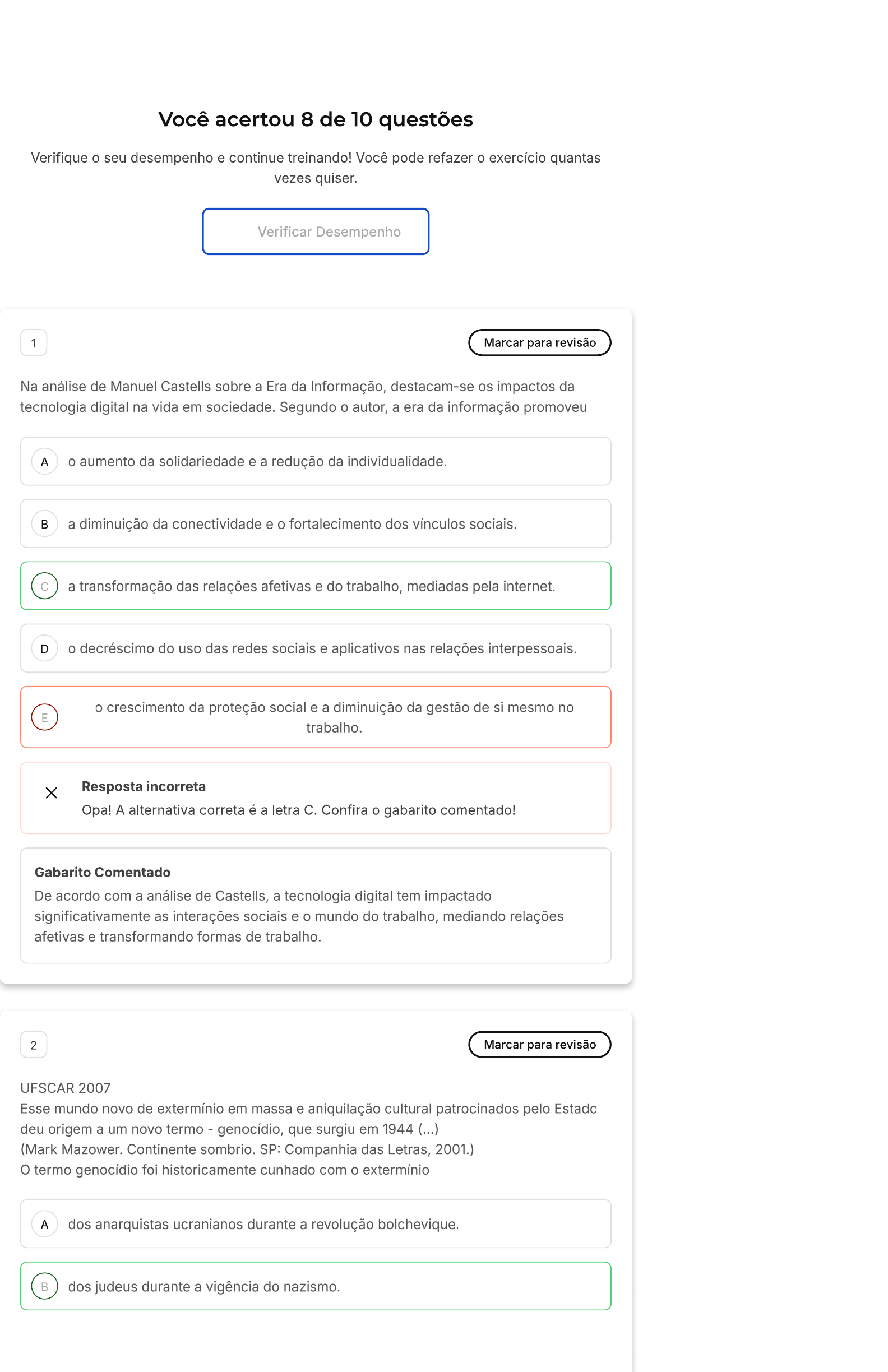 <p>Você acertou 8 de 10 questões Verifique o seu desempenho e continue treinando! Você pode refazer o exercício quantas vezes quiser. Verificar Desempenho 1 Marcar para revisão Na análise de Manuel Castells sobre a Era da Informação, destacam-se os impactos da tecnologia digital na vida em sociedade. Segundo o autor, a era da informação promoveu A o aumento da solidariedade e a redução da individualidade. B a diminuição da conectividade e o fortalecimento dos vínculos sociais. C a transformação das relações afetivas e do trabalho, mediadas pela internet D o decréscimo do uso das redes sociais e aplicativos nas relações interpessoais. o crescimento da proteção social e a diminuição da gestão de si mesmo no E trabalho. X Resposta incorreta Opa! A alternativa correta é a letra C. Confira o gabarito comentado! Gabarito Comentado De acordo com a análise de Castells, a tecnologia digital tem impactado significativamente as interações sociais e o mundo do trabalho, mediando relações afetivas e transformando formas de trabalho. 2 Marcar para revisão UFSCAR 2007 Esse mundo novo de extermínio em massa e aniquilação cultural patrocinados pelo Estado deu origem a um novo termo genocídio, que surgiu em 1944 (...) (Mark Mazower. Continente sombrio. SP: Companhia das Letras, 2001.) termo genocídio foi historicamente cunhado com o extermínio A dos anarquistas ucranianos durante a revolução bolchevique. B dos judeus durante a vigência do nazismo.</p><p>C dos romenos no seu processo de independência. D dos na invasão italiana. E dos zulus durante o governo racista da África do Sul. Resposta correta Parabéns, você selecionou a alternativa correta. Confira o gabarito comentado! Gabarito Comentado termo genocídio foi cunhado em 1944 pelo jurista Raphael Lemkin, para designar o extermínio sistemático de um grupo étnico, racial, religioso ou nacional. termo foi utilizado pela primeira vez para descrever o Holocausto, o genocídio dos judeus durante a Segunda Guerra 3 Marcar para revisão Parte dos pensadores contemporâneos acredita que a sociedade esteja passando por um processo conhecido como pós-verdade. Umberto Eco dizia que "o drama da internet é que ela promoveu o idiota da aldeia ao portador da verdade". autor quer dizer que, com a internet, qualquer sujeito social devidamente conectado tem acesso à produção e publicação de conteúdo. Disponível em Contudo, esta verdade apontada pelo filósofo italiano pode ter consequências drásticas para a democracia quando se tem uma produção em larga escala de A Decretos e leis. B Fakenews. C Normas e regulamentos. D Publicidade institucional. E Socialismo chinês. Resposta correta Parabéns, você selecionou a alternativa correta. Confira o gabarito comentado! Gabarito Comentado A alternativa correta é: "fakenews". filósofo Umberto Eco, em sua citação, alerta para o perigo da disseminação de informações não verificadas ou falsas na internet, que podem ser produzidas e compartilhadas por qualquer pessoa. Isso pode ter consequências drásticas para a democracia, pois a disseminação em larga escala de notícias falsas pode influenciar a opinião pública e distorcer a realidade. As eleições norte-americanas, por exemplo, evidenciaram que o compartilhamento de notícias falsas não era tão espontâneo quanto se pensava, reforçando a necessidade de se ter cuidado com as informações que circulam na internet.</p><p>4 Marcar para revisão fenômeno da economia global é um processo fundamental para a compreensão de como, a partir de sua capacidade de multiplicação, as trocas econômicas atingiram rinções que há menos de um século seriam entendidos como inacreditáveis. Sobre o a dinâmica da economia na era global observamos as assertivas abaixo: avanço da indústria chinesa, que superou a concorrência comercial mundial em vários produtos, pode ser entendido como um símbolo da economia globalizada. A sociedade em rede é um mecanismo vital para a dinâmica da economia global, em especial sua capacidade de virtualização como sucessora ao modelo político econômico aplicado nos tempos da Guerra Fria por EUA e URSS. III - imperialismo norte-americano, que impôs seu domínio econômico-financeiro sobre a América, a Europa Ocidental e parte do continente africano. IV - Expansionismo europeu sobre o Pacífico, a Ásia e a África, que impôs o controle político e comercial de potências ocidentais a diversas partes do mundo. Estão corretas as afirmativas: A Somente I, II e III. B Somente e III. C Somente as afirmativas II, III e IV. D Somente as afirmativas I, e IV. E Somente as afirmativas e IV. Resposta correta Parabéns, você selecionou a alternativa correta. Confira o gabarito comentado! Gabarito Comentado A resposta correta é: Somente as afirmativas I, e IV. 5 Marcar para revisão Na Internet, ela é uma rede social criada em 2004 que permite comunicar com um grupo de amigos predefinido (Grupos), aceitando os amigos e restringindo o acesso de estranhos aos seus dados. A Correio Eletrônico. B Gmail. C Blog.</p><p>D Facebook. E Weblog. Resposta correta Parabéns, você selecionou a alternativa correta. Confira o gabarito comentado! Gabarito Comentado Facebook é a rede social que se encaixa na descrição do enunciado. Foi criado em 2004 e permite a comunicação com um grupo de amigos predefinido, além de possibilitar a aceitação de novos amigos e a restrição do acesso de pessoas desconhecidas aos dados do usuário. Além disso, o Facebook permite a criação de perfis pessoais e profissionais, o acompanhamento de personalidades públicas e marcas, a criação, consumo e compartilhamento de conteúdos, entre outras funcionalidades. 6 Marcar para revisão Adaptado de FUNCAB 2011 Leia o texto: Ao contrário do que muita gente pensa, as ferramentas digitais já fazem parte da rotina das pessoas mais conforme uma pesquisa da Federação Brasileira de Bancos (Febraban) e do