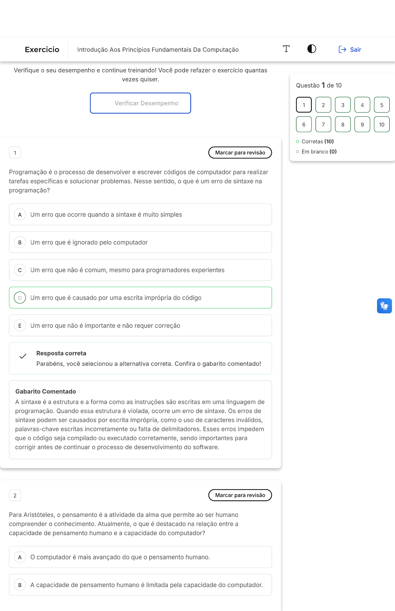 <p>Exercicio Introdução Aos Princípios Fundamentais Da Computação T Sair Verifique o seu desempenho e continue treinando! Você pode refazer o exercício quantas vezes quiser. Questão 1 de 10 Verificar Desempenho 1 2 3 4 5 6 7 8 9 10 Corretas (10) 1 Marcar para revisão Em branco (0) Programação é o processo de desenvolver e escrever códigos de computador para realizar tarefas específicas e solucionar problemas. Nesse sentido, o que é um erro de sintaxe na programação? A Um erro que ocorre quando a sintaxe é muito simples B Um erro que é ignorado pelo computador C Um erro que não é comum, mesmo para programadores experientes D Um erro que é causado por uma escrita imprópria do código E Um erro que não é importante e não requer correção Resposta correta você selecionou a alternativa correta. Confira o gabarito comentado! Gabarito Comentado A sintaxe é a estrutura e a forma como as instruções são escritas em uma linguagem de programação. Quando essa estrutura é violada, ocorre um erro de sintaxe. Os erros de sintaxe podem ser causados por escrita imprópria, como o uso de caracteres inválidos, palavras-chave escritas incorretamente ou falta de delimitadores. Esses erros impedem que o código seja compilado ou executado corretamente, sendo importantes para corrigir antes de continuar o processo de desenvolvimento do software. 2 Marcar para revisão Para Aristóteles, o pensamento é a atividade da alma que permite ao ser humano compreender o conhecimento. Atualmente, o que é destacado na relação entre a capacidade de pensamento humano e a capacidade do computador? A computador é mais avançado do que o pensamento humano. B A capacidade de pensamento humano é limitada pela capacidade do computador.</p><p>computador é limitado pela capacidade de pensamento digital. A capacidade de pensamento humano é infinita, enquanto a capacidade do D computador é limitada. E A capacidade do computador e a capacidade de pensamento humano são iguais Resposta correta Parabéns, você selecionou a alternativa correta. Confira o gabarito comentado! Gabarito Comentado De acordo com a filosofia de Aristóteles, o pensamento humano é uma atividade da alma que nos permite compreender o conhecimento. Na era moderna, quando comparamos a capacidade de pensamento humano com a capacidade de um computador, é importante destacar que a capacidade de pensamento humano é considerada infinita, enquanto a capacidade do computador é limitada. Isso ocorre porque o computador é uma ferramenta criada pelo ser humano e, portanto, sua capacidade é limitada pelo conhecimento e pela programação fornecidos pelos programadores humanos. Além disso, o pensamento humano é amplo e inclui aspectos como criatividade, intuição e emoção, que estão além da capacidade de um computador, que é limitado aos comandos programados. 3 Marcar para revisão Estudamos sobre a equação essencial dos computadores. Segundo o que estudamos, os computadores são inacreditavelmente rápidos. A segunda característica fundamental é: A São inteligentes. B São lentos. C São tolos. D Processam instruções complexas. E Possuem capacidade de compreensão dos dados. Resposta correta Parabéns, você selecionou a alternativa correta. Confira o gabarito comentado! Gabarito Comentado A alternativa correta é "são tolos". Isso se deve ao fato de que, apesar de os computadores serem extremamente rápidos e poderosos para realizar cálculos matemáticos, eles não possuem a capacidade de compreensão e discernimento. Ou seja, eles não conseguem interpretar ou entender os dados que estão processando, apenas executam as instruções que lhes são dadas. Portanto, em um sentido figurado, podemos dizer que os computadores são "tolos".</p><p>4 Marcar para revisão JavaScript é uma linguagem de programação criada em meados da década de 90 e de fácil assimilação por apresentar uma sintaxe simples e intuitiva. Acerca dessa linguagem, marque a opção que representa o código Javascript que produz o resultado abaixo. alho treze dois A show( "alho", "treze" "dois" B print( "alho","treze","dois") C put( "alho", D screen( "alho", 13, "dois" ); E print( "alho", 13, 2); Resposta correta Parabéns, você selecionou a alternativa correta. Confira o gabarito comentado! Gabarito Comentado comando print( "alho", "treze", "dois" é a alternativa correta. No JavaScript, para imprimir ou exibir uma string (sequência de caracteres), utilizamos o comando print. As strings devem estar entre aspas duplas. Os comandos show, put e screen não são utilizados para essa finalidade em JavaScript. Além disso, é importante notar que os números 13 e 2, quando pretendemos que sejam interpretados como texto, também devem estar entre aspas. 5 Marcar para revisão A memória do computador é capaz de armazenar diferentes tipos de dados. A forma como lidamos com esses dados depende da necessidade do programador e da linguagem por ele utilizada. Em computação, o que é uma string? A É o nome de um tipo de dado estritamente numérico. É o nome de um tipo de dado constituído por uma sequência de caracteres, ou B seja, um texto. C É o nome dado a uma sequência de instruções. D É um tipo de dado que admite valores numéricos, como inteiros e decimais. É o nome dado às instruções simples e interpretáveis por computadores que E formam um código</p><p>Resposta correta Parabéns, você selecionou a alternativa correta. Confira o gabarito comentado! Gabarito Comentado A alternativa correta é a que define a string como um tipo de dado constituído por uma sequência de caracteres, ou seja, um texto. Em programação, as strings são utilizadas para representar e manipular textos. Elas podem ser usadas para armazenar diversos tipos de informações, como nomes de pessoas, endereços residenciais ou páginas da web. É importante lembrar que, em algumas linguagens de programação, as strings devem ser delimitadas por aspas du