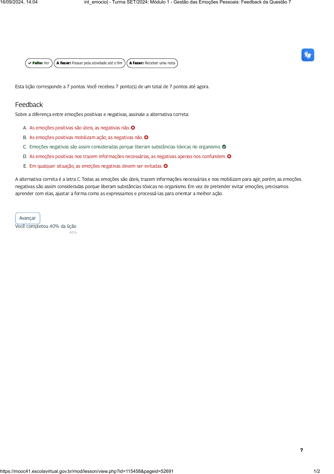 <p>Esta lição corresponde a 7 pontos. Você recebeu 7 ponto(s) de um total de 7 pontos até agora.</p><p>Feedback</p><p>Sobre a diferença entre emoções positivas e negativas, assinale a alternativa correta:</p><p>A. As emoções positivas são úteis, as negativas não. </p><p>B. As emoções positivas mobilizam ação, as negativas não. </p><p>C. Emoções negativas são assim consideradas porque liberam substâncias tóxicas no organismo. </p><p>D. As emoções positivas nos trazem informações necessárias, as negativas apenas nos confundem. </p><p>E. Em qualquer situação, as emoções negativas devem ser evitadas. </p><p>A alternativa correta é a letra C. Todas as emoções são úteis, trazem informações necessárias e nos mobilizam para agir, porém, as emoções</p><p>negativas são assim consideradas porque liberam substâncias tóxicas no organismo. Em vez de pretender evitar emoções, precisamos</p><p>aprender com elas, ajustar a forma como as expressamos e processá-las para orientar a melhor ação.</p><p>Avançar</p><p>Você completou 40% da lição</p><p>40%</p><p> Feito: Ver A fazer: Passar pela atividade até o �m A fazer: Receber uma nota</p><p></p><p>16/09/2024, 14:04 int_emocio| - Turma SET/2024: Módulo 1 - Gestão das Emoções Pessoais: Feedback da Questão 7</p><p>https://mooc41.escolavirtual.gov.br/mod/lesson/view.php?id=115458&pageid=52691 1/2</p><p>16/09/2024, 14:04 int_emocio| - Turma SET/2024: Módulo 1 - Gestão das Emoções Pessoais: Feedback da Questão 7</p><p>https://mooc41.escolavirtual.gov.br/mod/lesson/view.php?id=115458&pageid=52691 2/2</p>