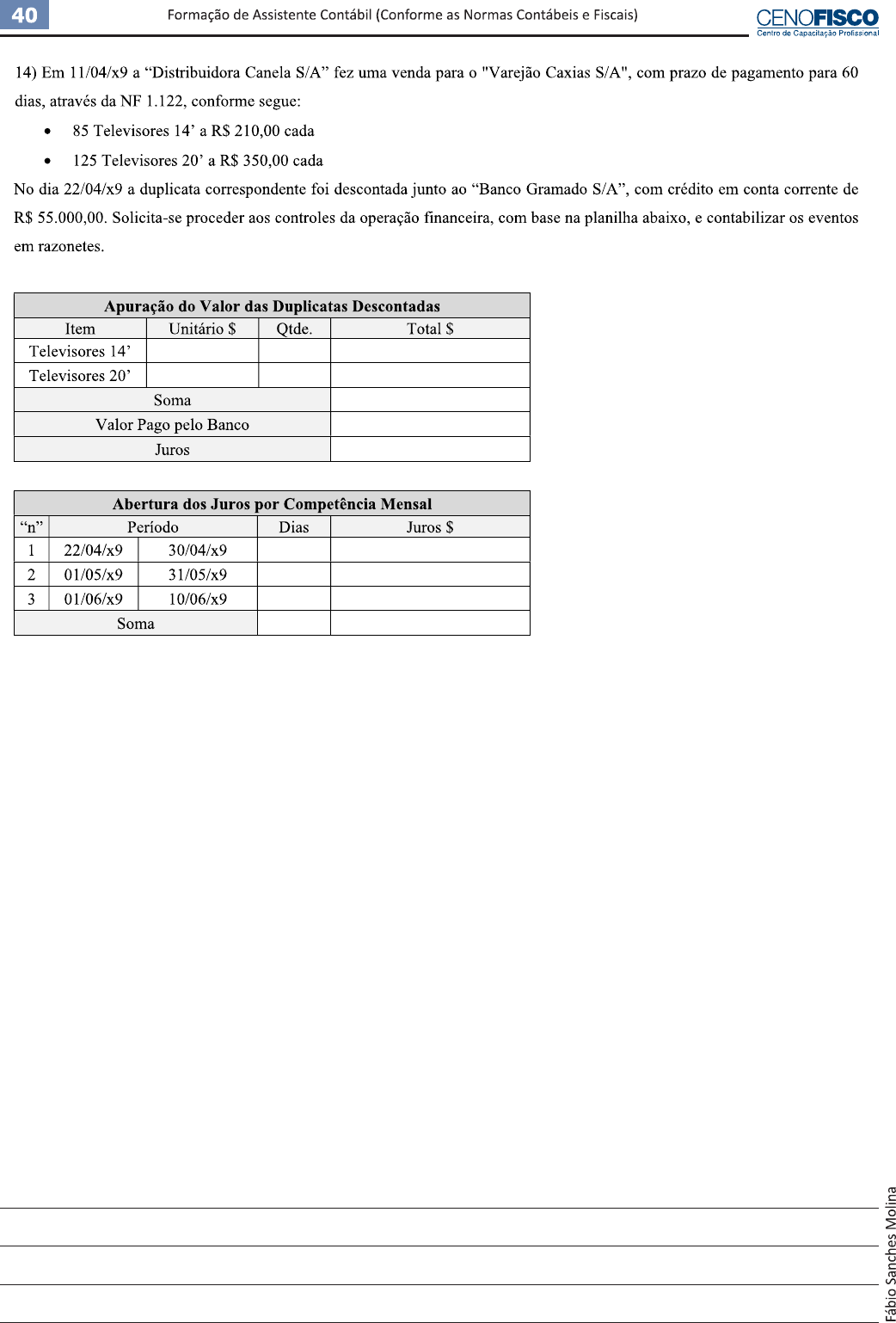<p>40 Formação de Assistente Contábil (Conforme as Normas Contábeis e Fiscais) CENOFISCO Centro de Capacitação Profissional 14) Em 11/04/x9 a "Distribuidora Canela S/A" fez uma venda para o "Varejão Caxias S/A", com prazo de pagamento para 60 dias, através da NF 1.122, conforme segue: 85 Televisores 14' a R$ 210,00 cada 125 Televisores 20' a R$ 350,00 cada No dia 22/04/x9 a duplicata correspondente foi descontada junto ao "Banco Gramado S/A", com crédito em conta corrente de R$ 55.000,00. Solicita-se proceder aos controles da operação financeira, com base na planilha abaixo, e contabilizar os eventos em razonetes. Apuração do Valor das Duplicatas Descontadas Item Unitário $ Total $ Televisores 14' Televisores 20' Soma Valor Pago pelo Banco Juros Abertura dos Juros por Competência Mensal "n" Período Dias Juros $ 1 22/04/x9 30/04/x9 2 01/05/x9 31/05/x9 3 01/06/x9 10/06/x9 Soma</p>