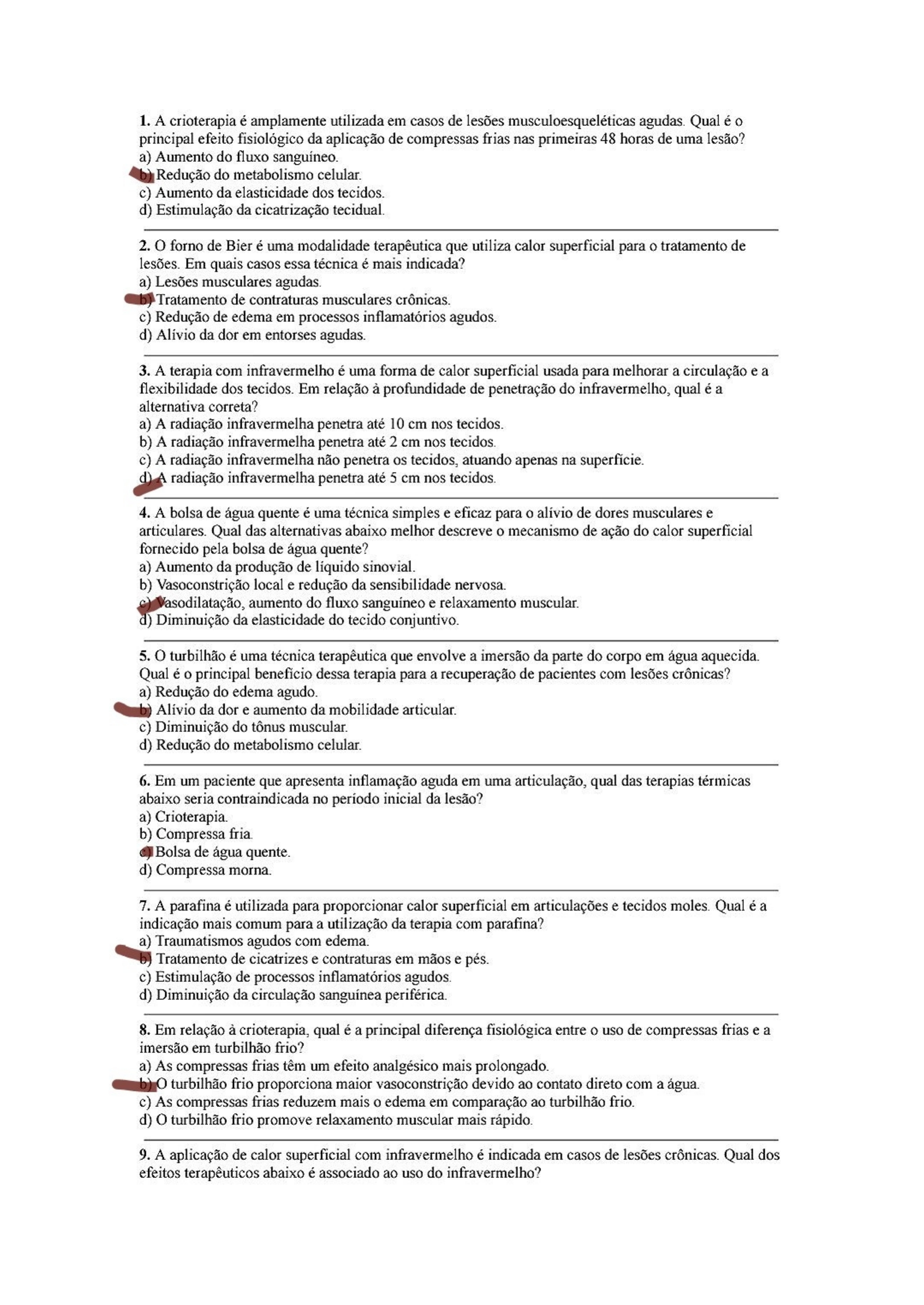 <p>1. A crioterapia é amplamente utilizada em casos de lesões musculoesqueléticas agudas. Qual é principal efeito fisiológico da aplicação de compressas frias nas primeiras 48 horas de uma lesão? a) Aumento do fluxo sanguíneo. Redução do metabolismo celular. c) Aumento da elasticidade dos tecidos. d) Estimulação da cicatrização tecidual. 2. O forno de Bier é uma modalidade terapêutica que utiliza calor superficial para o tratamento de lesões. Em quais casos essa técnica é mais indicada? a) Lesões musculares agudas. Tratamento de contraturas musculares crônicas. c) Redução de edema em processos inflamatórios agudos. d) Alívio da dor em entorses agudas. 3. A terapia com infravermelho é uma forma de calor superficial usada para melhorar a circulação e a flexibilidade dos tecidos. Em relação à profundidade de penetração do infravermelho, qual é a alternativa correta? a) A radiação infravermelha penetra até 10 cm nos tecidos. b) A radiação infravermelha penetra até 2 cm nos tecidos. c) A radiação infravermelha não penetra os tecidos, atuando apenas na d) A radiação infravermelha penetra até 5 cm nos tecidos. 4. A bolsa de água quente é uma técnica simples e eficaz para o alívio de dores musculares e articulares. Qual das alternativas abaixo melhor descreve o mecanismo de ação do calor superficial fornecido pela bolsa de água quente? a) Aumento da produção de líquido sinovial. b) Vasoconstrição local e redução da sensibilidade nervosa. aumento do fluxo sanguíneo e relaxamento muscular. d) Diminuição da elasticidade do tecido conjuntivo. 5. O turbilhão é uma técnica terapêutica que envolve a imersão da parte do corpo em água aquecida. Qual é o principal beneficio dessa terapia para a recuperação de pacientes com lesões crônicas? a) Redução do edema agudo b) da dor e aumento da mobilidade articular. c) Diminuição do tônus muscular. d) Redução do metabolismo celular. 6. Em um paciente que apresenta inflamação aguda em uma articulação, qual das terapias térmicas abaixo seria contraindicada no período inicial da lesão? a) Crioterapia. b) Compressa fria. Bolsa de água d) Compressa morna. 7. A parafina é utilizada para proporcionar calor superficial em articulações e tecidos moles. Qual é a indicação mais comum para a utilização da terapia com parafina? a) Traumatismos agudos com edema. Tratamento de cicatrizes e contraturas em mãos e pés. c) Estimulação de processos inflamatórios agudos. d) Diminuição da circulação sanguínea periférica. 8. Em relação à crioterapia, qual é a principal diferença fisiológica entre o uso de compressas frias e a imersão em turbilhão frio? a) As compressas frias têm um efeito analgésico mais prolongado. turbilhão frio proporciona maior vasoconstrição devido ao contato direto com a água. c) As compressas frias reduzem mais o edema em comparação ao turbilhão frio. d) turbilhão frio promove relaxamento muscular mais 9. A aplicação de calor superficial com infravermelho é indicada em casos de lesões crônicas. Qual dos efeitos terapêuticos abaixo é associado ao uso do infravermelho?</p><p>a) Diminuição da inflamação aguda. b) Estimulação da cicatrização de feridas abertas. Aumento da elasticidade dos tecidos e redução de espasmos musculares. d) Vasoconstrição e redução da sensibilidade nervosa. 10. Ao aplicar o forno de Bier em um paciente com artrite reumatoide nas mãos, qual é a principal vantagem do uso dessa técnica em comparação com outras formas de calor superficial? a) forno de Bier reduz o edema mais rapidamente. Ele permite um controle mais preciso da temperatura e do tempo de aplicação. c) A técnica é mais eficaz na redução da dor em lesões agudas. d) forno de Bier promove maior penetração do calor nos tecidos profundos. 11. Durante a aplicação de uma compressa quente sobre a pele de um paciente, o calor é transferido diretamente do material da compressa para os tecidos superficiais. Esse tipo de transferência de calor é classificado como: a) Convecção. b) d) 12. A terapia com parafina, utilizada para tratar articulações de pequenas dimensões, como mãos e pés, é um exemplo de qual tipo de transferência de calor? a) Convecção. b) Radiação. Condução. d) 13. No uso terapêutico de um turbilhão aquecido, o calor é transferido pela movimentação da água ao redor da parte do corpo submersa. Esse tipo de transferência de calor é caracterizado como: b) Convecção. c) Radiação. d) Condução e radiação. 14. o infravermelho é utilizado em fisioterapia para promover aquecimento superficial dos tecidos sem contato direto com a pele. Qual é o tipo de transferência de calor envolvido nesse processo? a) Convecção. d) Difusão térmica. 15. Durante a aplicação de uma bolsa de gelo (crioterapia), a troca de calor entre a pele e o material frio ocorre por contato direto. Esse mecanismo de troca de calor é um exemplo de: Condução. b) Convecção. c) Radiação. Absorção térmica. 16. A eletroestimulação é uma técnica terapêutica utilizada na Fisioterapia para tratar dores e promover a reabilitação muscular. Um dos principios envolvidos na eletroestimulação é a interação eletrostática entre os eletrodos e os tecidos corporais. Sabendo que essa interação depende da carga elétrica presente nos eletrodos e nos ions do corpo, qual dos fenômenos abaixo descreve corretamente o efeito da interação eletrostática no processo de eletroestimulação? a) A movimentação dos ions em direção ao eletrodo de mesma carga elétrica resulta em contração muscular. Os presentes no tecido corporal são para o eletrodo de carga oposta, facilitando a estimulação c) A aplicação de corrente elétrica gera a repulsão dos ions da área tratada, resultando em analgesia d) A carga elétrica aplicada pelos eletrodos promove uma reorganização dos ions no tecido, diminuindo a excitabili
